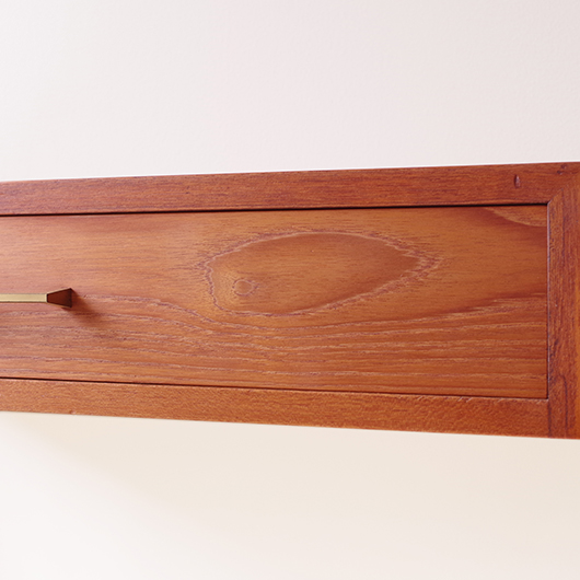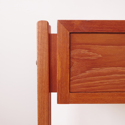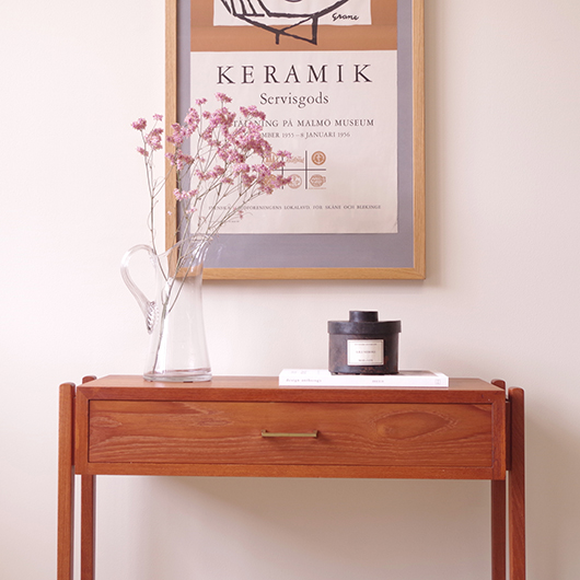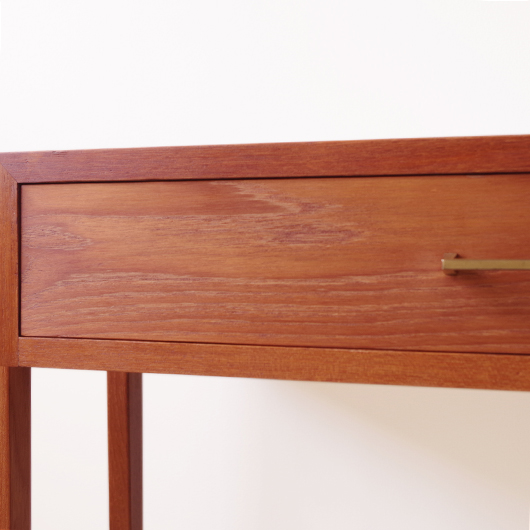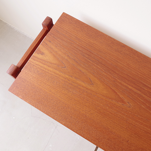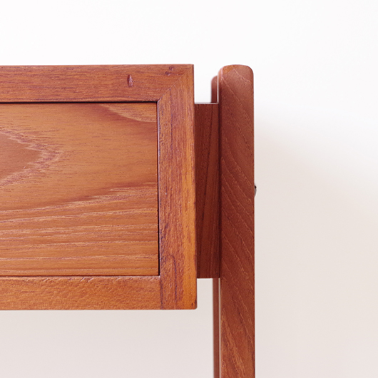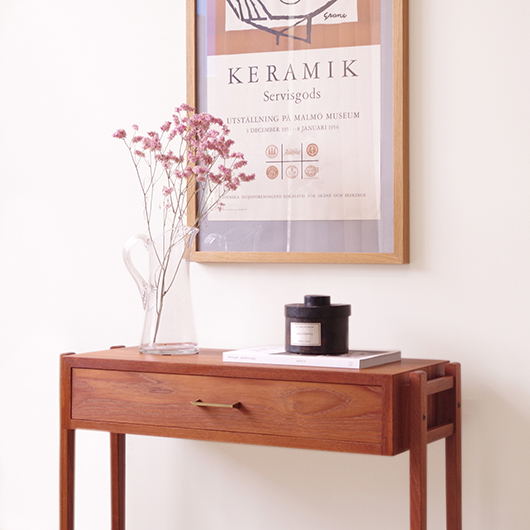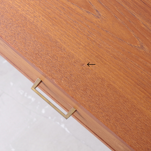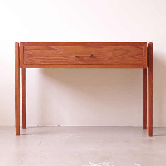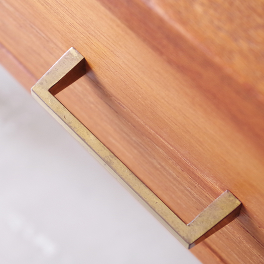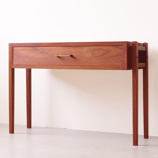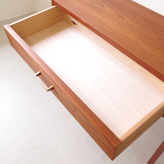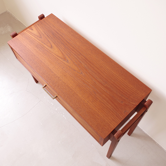 1960年代デンマーク製のヴィンテージ ミディアムチェスト。 幅広い天板の下には引き出しが付き、真鍮の取っ手がアクセントとなっています。本体を左右からスラリと長い脚部で挟み込む構造で、脚部と本体の間にスペースを空けることで浮遊感を出しとても軽やかな印象です。 特徴となっているのはそのサイズ感で、幅が73cmと広めであるのに奥行きが30cmに満たない浅さのため、省スペースでの使用にも向いています。 リビングにはもちろん、玄関先やベッドルームなどに置いても邪魔になりにくいサイズのため、コンソールテーブルのようにお使いいただけます。広い天板に花瓶などを飾ったり、上部の壁面にはミラーやポスターなどを合わせても良さそうです。 丁寧な修復を施しまして、全体的に綺麗な状態です。引出しの底板は新しく交換しておりますので、清潔に気持ち良くお使いいただけます。僅かな小キズなどございますが、雰囲気を損ねない程度かと思います。そのほか細部の状態などは、画像をご参照ください。
