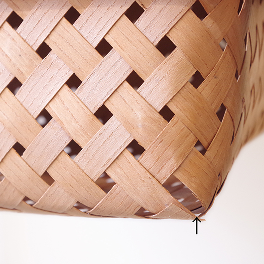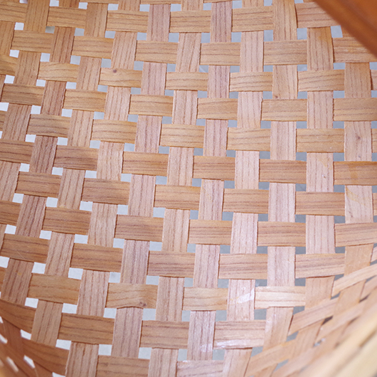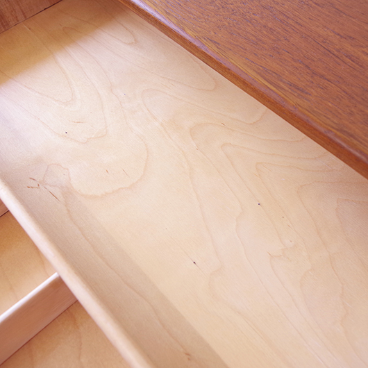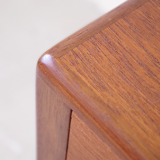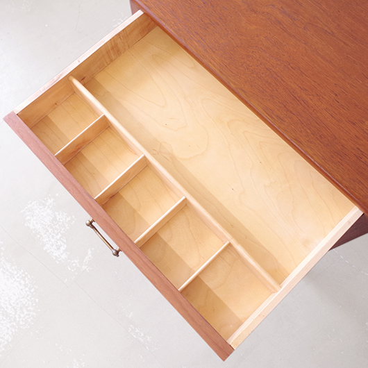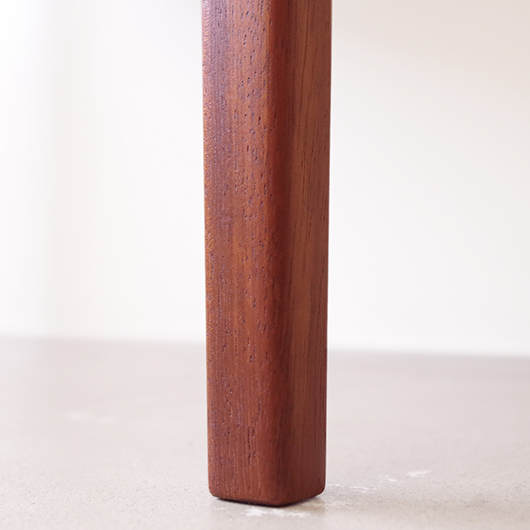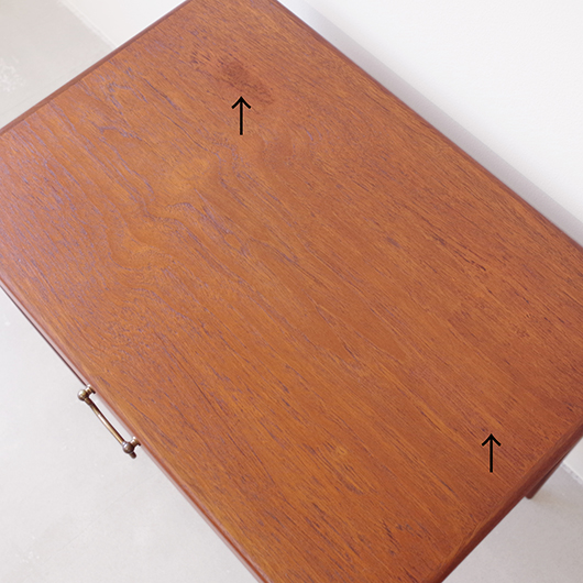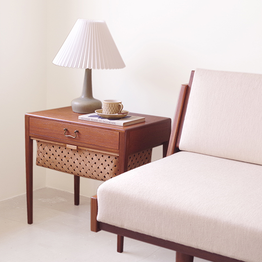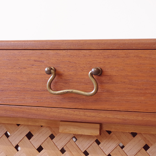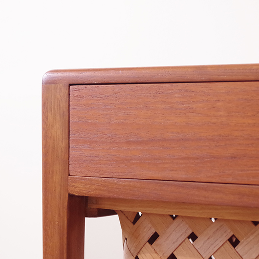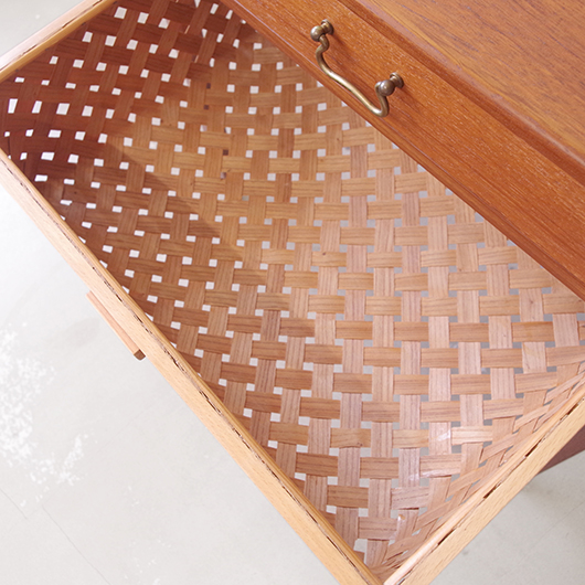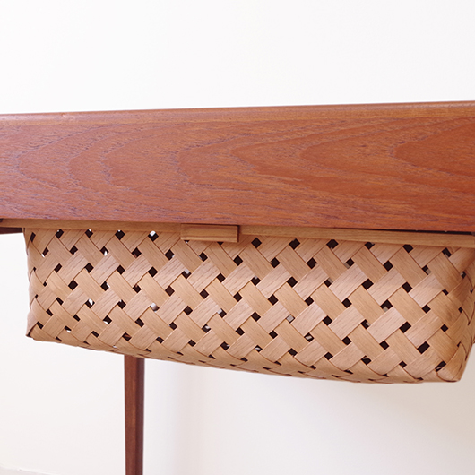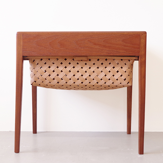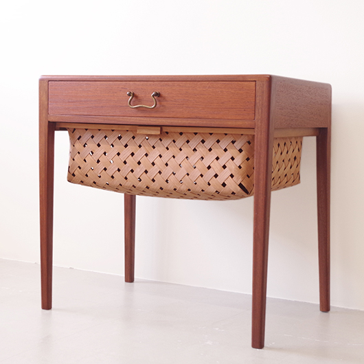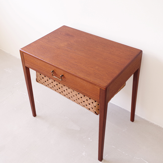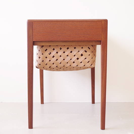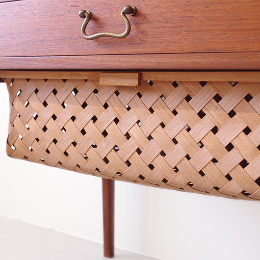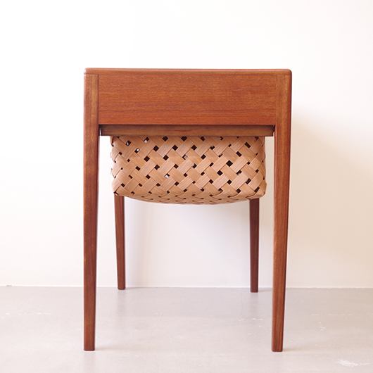 1960年代デンマーク製のヴィンテージソーイングテーブル。 本体からスラリと華奢な脚が伸びた佇まいが印象的です。天板下の引き出しは手前に細かな仕切りのついた収納となっており、真鍮の雰囲気ある取っ手が目を惹きます。 一番の特徴はその下についたカゴの部分で、パイン材を薄く削いで作ったへぎ板(=Spån)を編んでバスケット(=korg )にしたスペシャルなもので、一般的なラタンのバスケットとはまた異なる雰囲気が魅力ではないでしょうか。 夜の長い北欧諸国では裁縫が盛んなゆえ、裁縫道具をひとまとめに収納できるこのような家具が作られました。もちろん多目的に使用できるためソーイングにこだわらず、ソファ脇などに置いてリビングに散らかりがちな文具などの細かなものを収納したりと、現代の暮らしに合わせた使い方が思い浮かびます。北欧ヴィンテージらしい雰囲気と合わせて工芸的な美しさも感じる一台で、部屋の雰囲気作りに一役買ってくれることと思います。 全体を丁寧に研磨(サンディング)をして小キズを取り除き、その後に再塗装を行い、自然な艶の良い雰囲気に仕上がりました。カゴに切れや天板に落とし切れなかった極薄らとした僅かなシミなどありますが、よく見ないと分からない程度で、雰囲気を損ねるほどではないかと思います。全体として綺麗な状態です。そのほか細部の状態などは、画像をご参照ください。