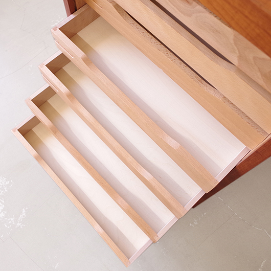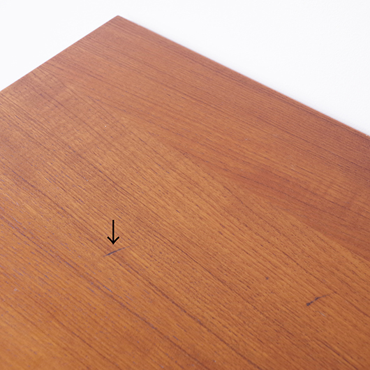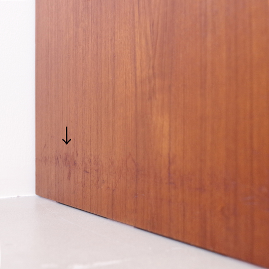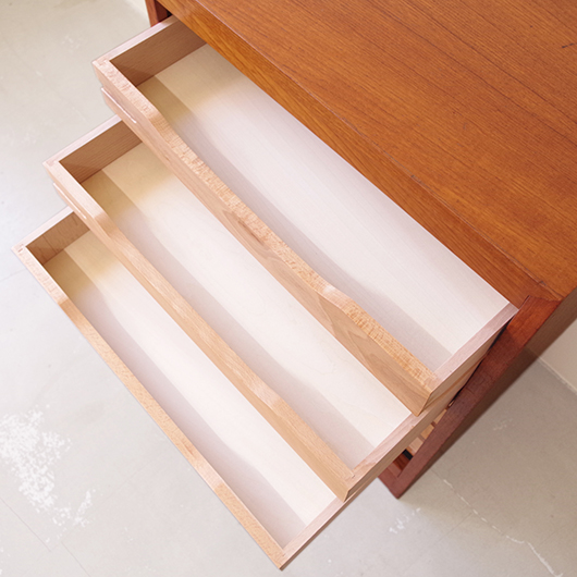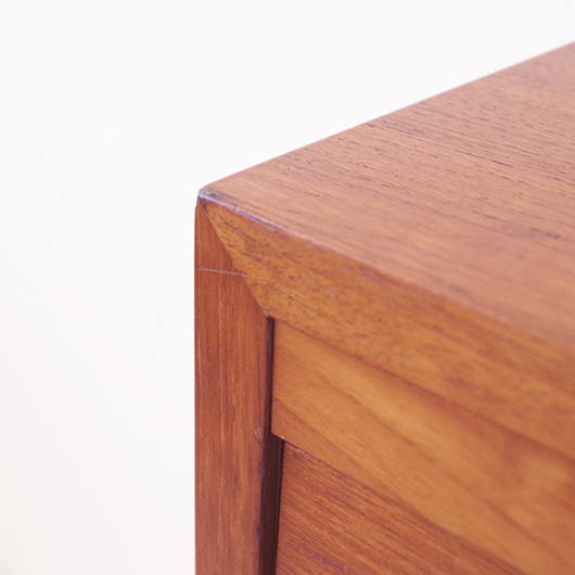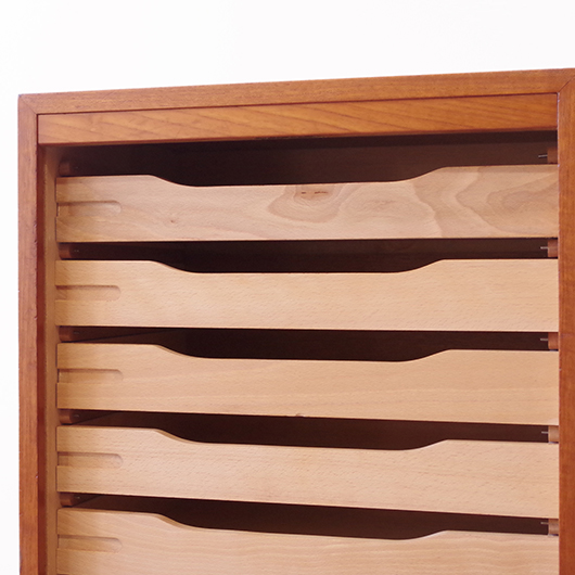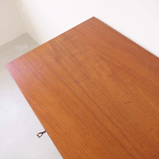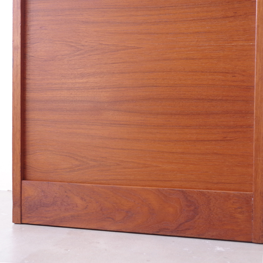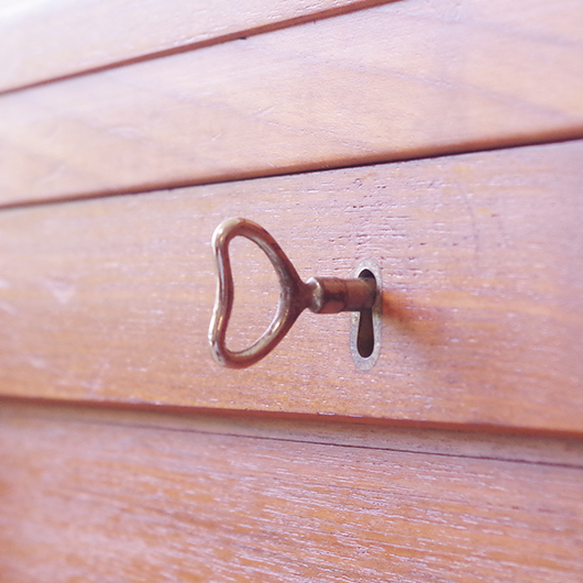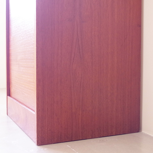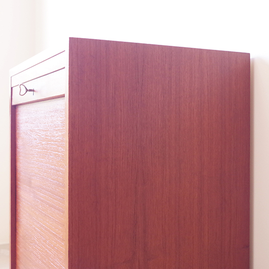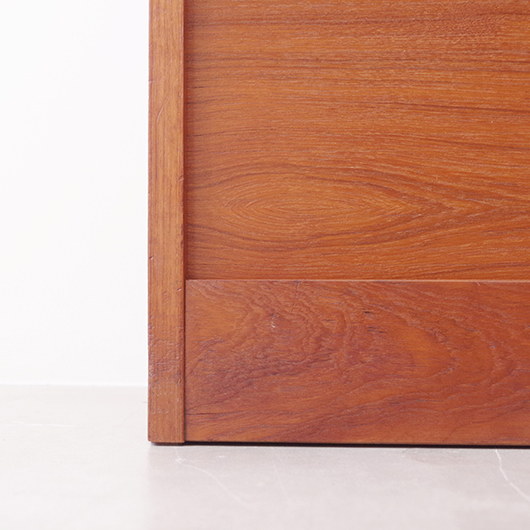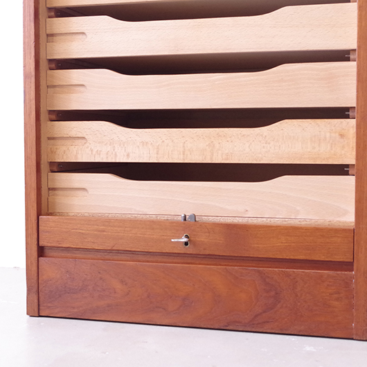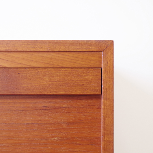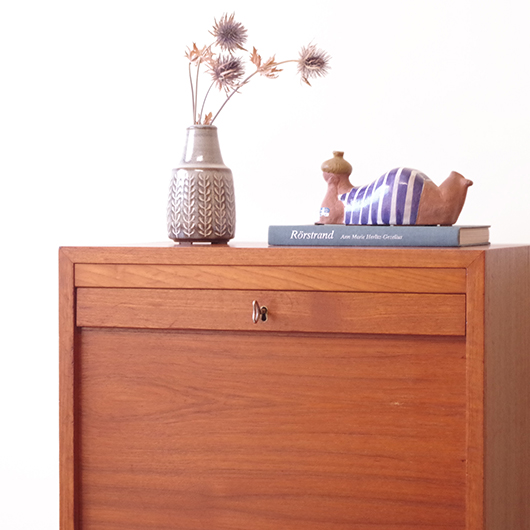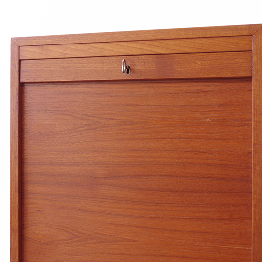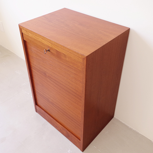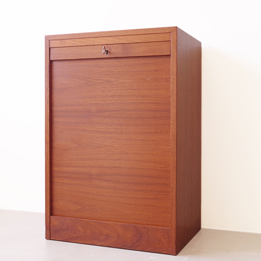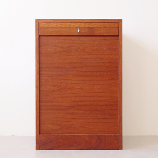 1960年代デンマーク製のヴィンテージロールフロントキャビネット。 正面のチーク材の美しい木目をよく見ると細かなスリットが入っており、鍵を回すと下側にサッと巻き込まれていく縦型の蛇腹式扉となっています。近くで見ても分からないほどの細かなスリットは楽しい驚きを与えてくれるとともに、丁寧で高度な技術であることが伺えます。そして、もうひとつユニークなのが扉の施錠で、アナログな作りながら下から上に押し上げるだけで自動でロックが掛かる便利な構造です。 内部は収納ケースが7枚備わっており、A4サイズをおいても十分なゆとりがあります。 扉を閉じた状態では花瓶などを置く花台など、高さのある天板上にお気に入りの小物をディスプレイしてお楽しみいただけます。細かく仕切られた内部ケースには書類はもちろん、切り抜きや布などのコレクションなどを分かりやすく種分けしたりと、実用的な一台として活躍してくれそうです。 丁寧な修復を施し、全体的に良好な状態です。本体背板や収納ケースの底板はすべて新しい板に交換しておりますので、清潔にお使いいただけます。全体的にやや経年感が見られますが雰囲気を損ねるものではなく、ヴィンテージの風合いを生かした仕上がりとなっております。そのほか細部の状態などは、画像をご参照ください。
