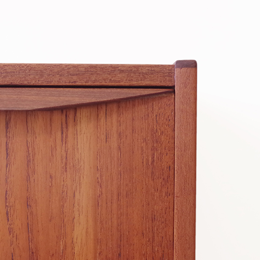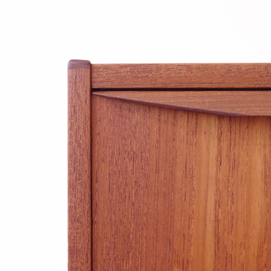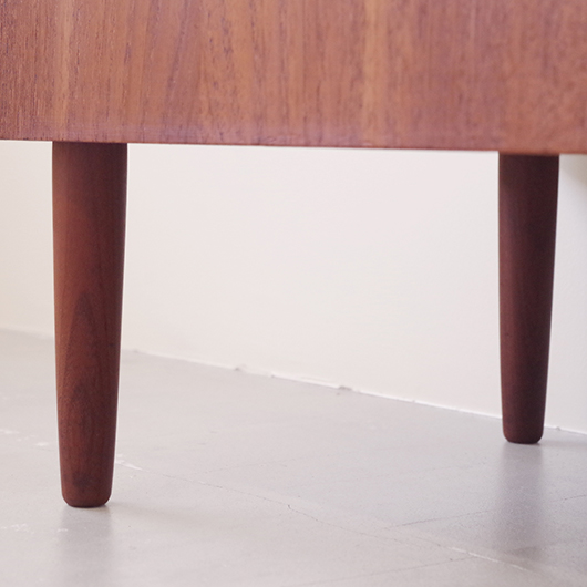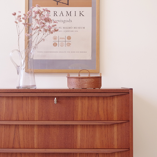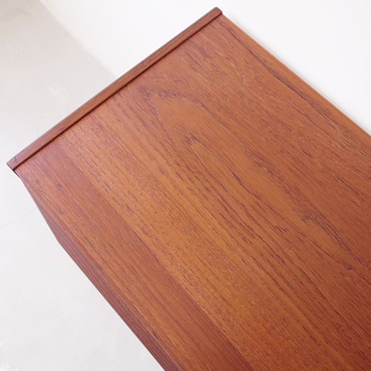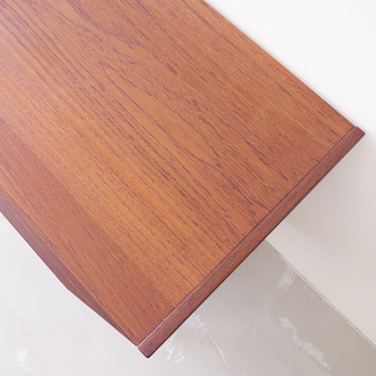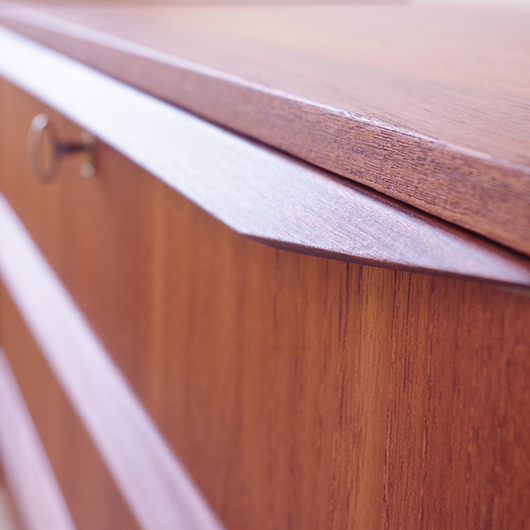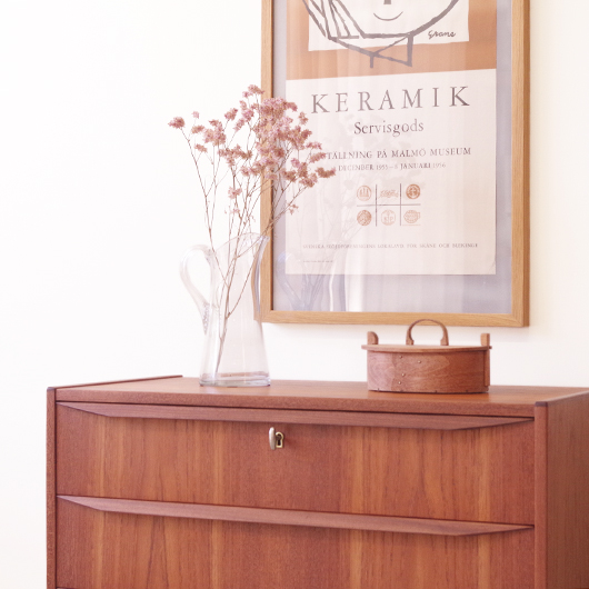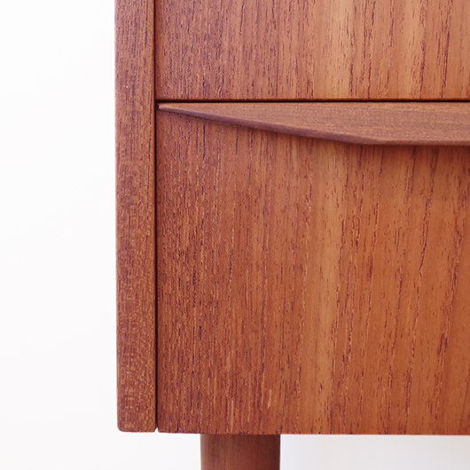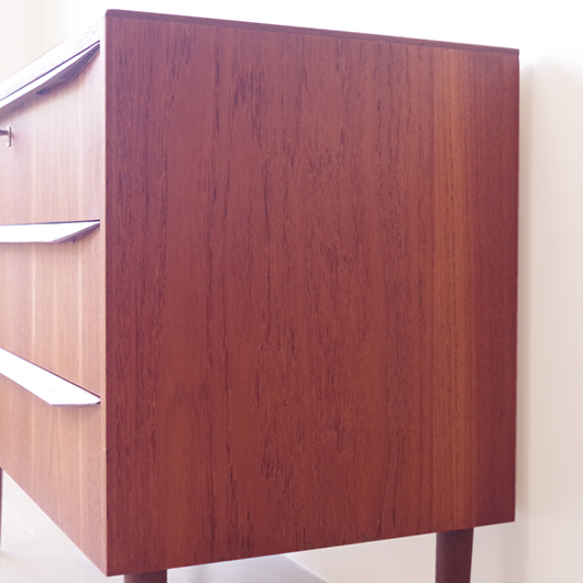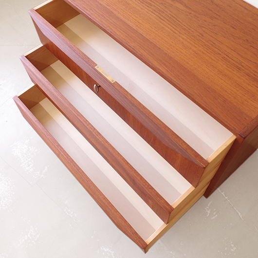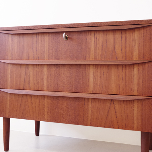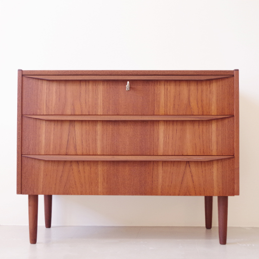 1960年代デンマーク製のヴィンテージ3段チェスト。 高さを抑えた幅のあるミディアムサイズで、確りとした収納力を備えながら圧迫感のないサイズ感が使いやすい一台です。取っ手は引き出しの縁に沿って取り付けられたバータイプで、厚みのある無垢材は全体のアクセントとなっております。最上段には雰囲気のある鍵も付いており、また正面から見て上下に揃った穏やかな木目も丁寧に作られたデンマーク製のヴィンテージらしいポイントのひとつです。 広い天板にはお気に入りの小物などをディスプレイしてはいかがでしょうか。上部の空間にポスターやミラーなどを合わせても良さそうです。 丁寧な修復を行いまして、綺麗な状態です。引出しの底板や背板もすべて新しく交換しておりますので、清潔に気持ち良くお使いいただけます。側面下方に修復箇所がございますが、まず気にならない程度かと思います。そのほか細部の状態などは、画像をご参照ください。