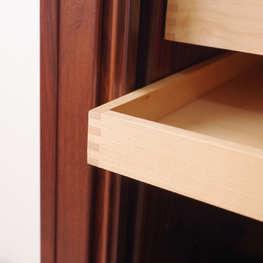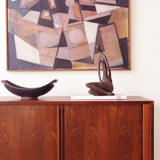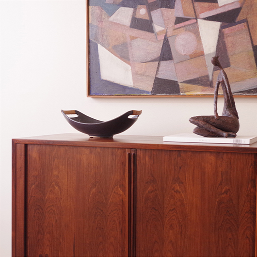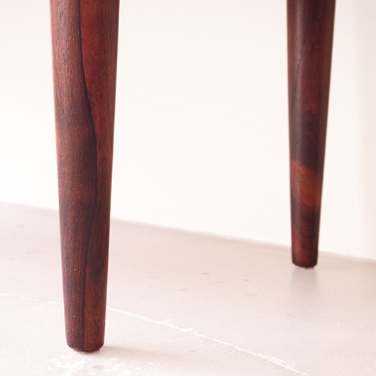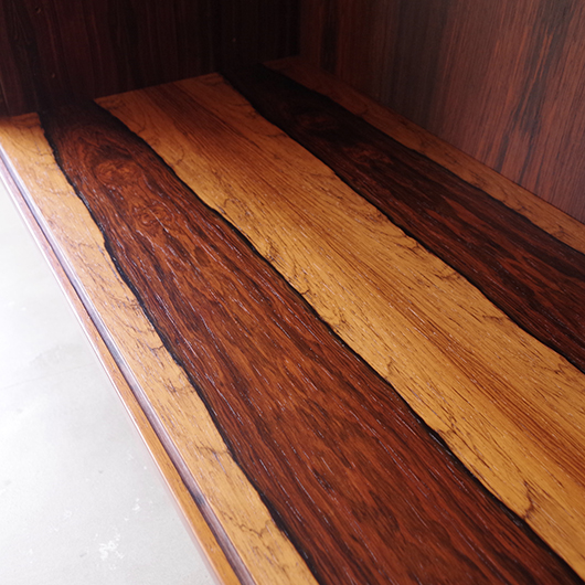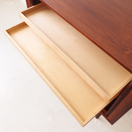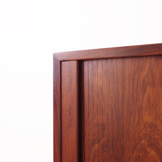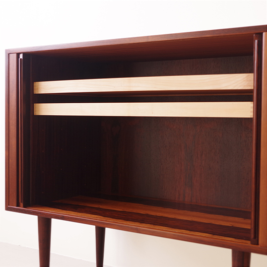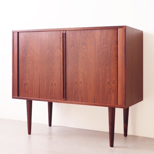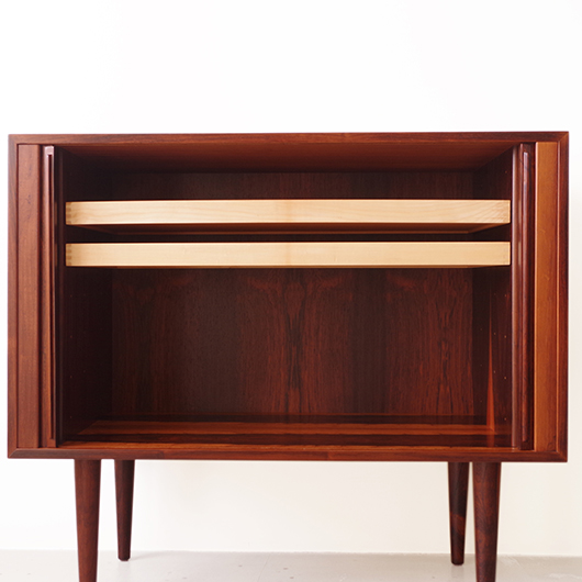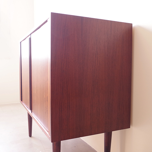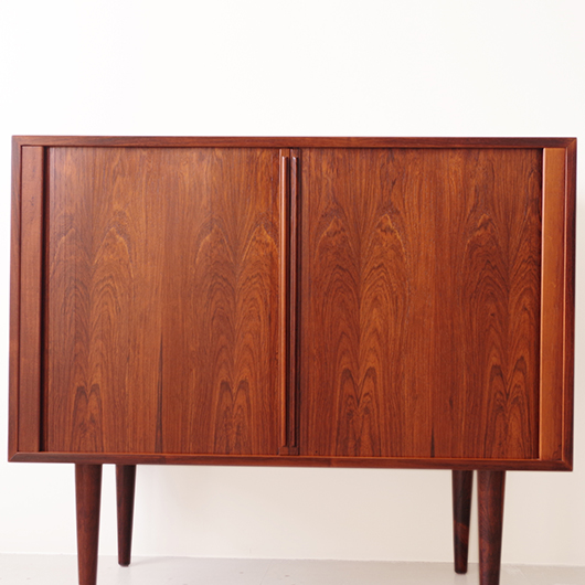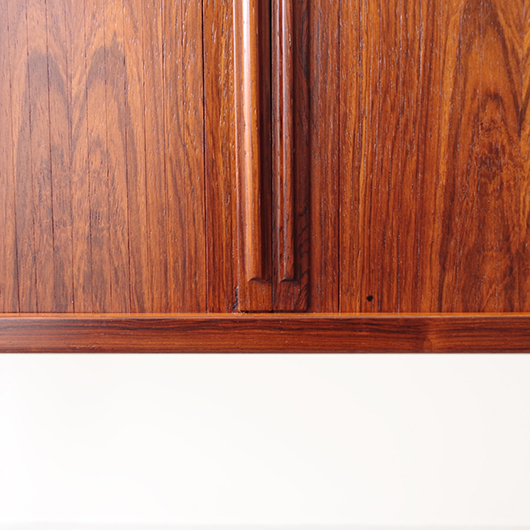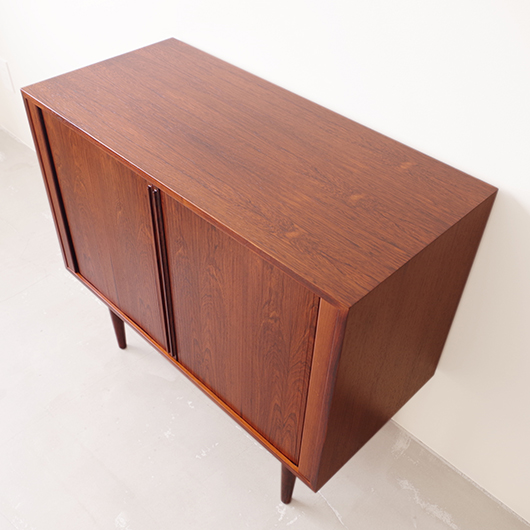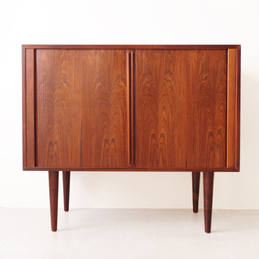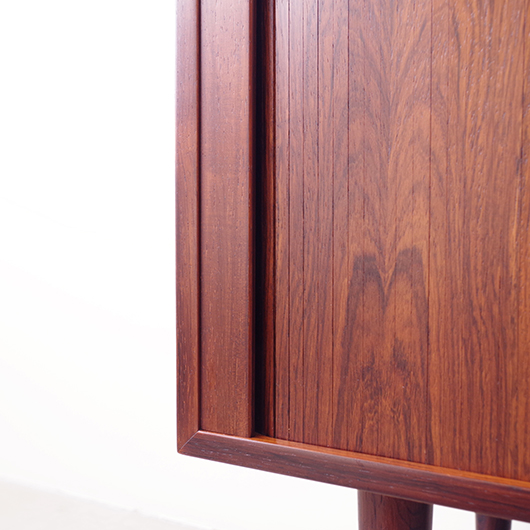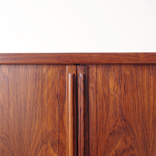 デンマークを代表するデザイナーの一人 Kai Kristiansenのデザインによる、Feldballes Mobelfabrik製のヴィンテージ ロールフロントキャビネット。 正面の扉をよく見ると細かなスリットが入っており、取っ手を横に引くとスルスルと側面に回り込む蛇腹式の扉となっています。この近くで見ても分からないほどのスリットに、職人の高度な技術が伺えます。 素材にはワシントン条約のレッドリストに入っている希少な高級木材であるローズウッドが用いられております。天板は穏やかな木目、扉を開けた内部は特徴的な杢が強く現れ、全体を通してローズウッドらしさを堪能できます。 扉の内部は上側に2段の浅い引き出しが備わり、その下は広いオープンスペースとなっております。特に底には見事なローズウッドの木目が見られ、ブラジリアンローズウッドと思われるダイナミックな杢が隠れています。 リビングの片隅に置くだけで、目を惹く存在感があります。天板に小物などを飾ったり壁面に絵画を合わせたりと、日々の暮らしの中で活躍してくれそうです。 全体を丁寧にサンディング(研磨)した後に再塗装を行いまして、全体的に綺麗な状態に仕上がりました。そのほか細部の状態などは、画像をご参照ください。
