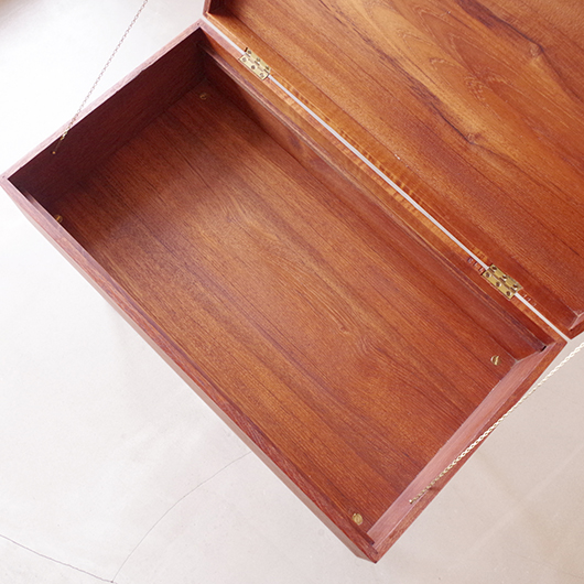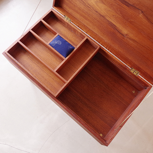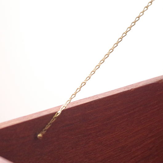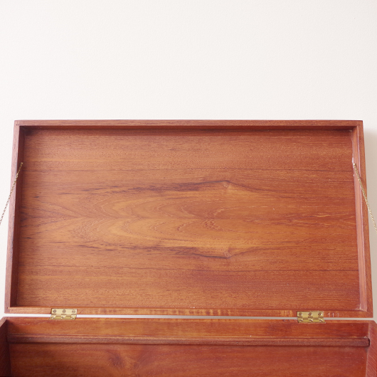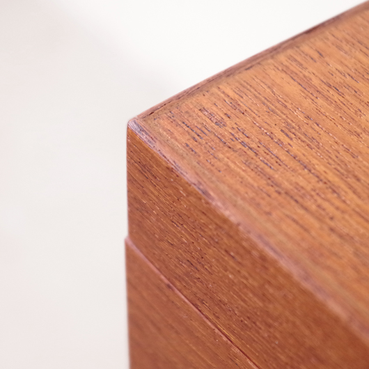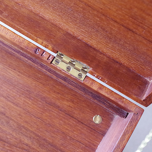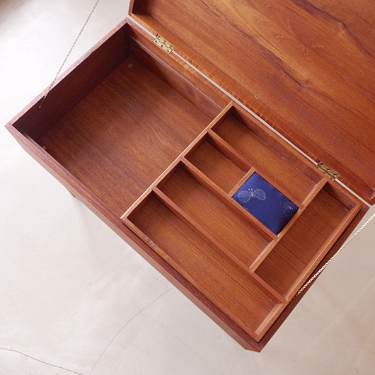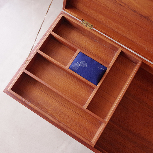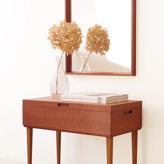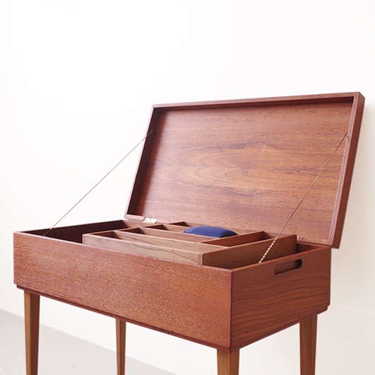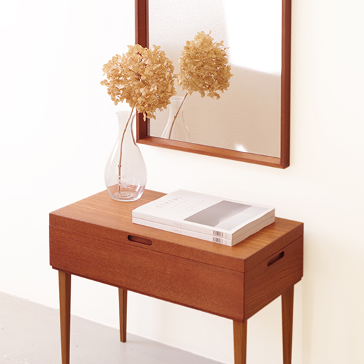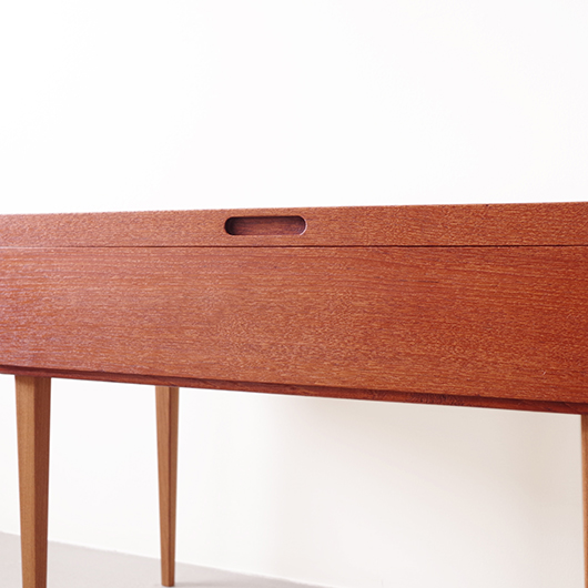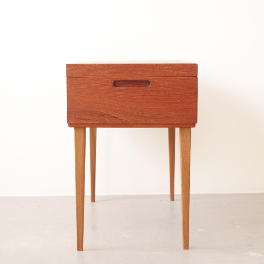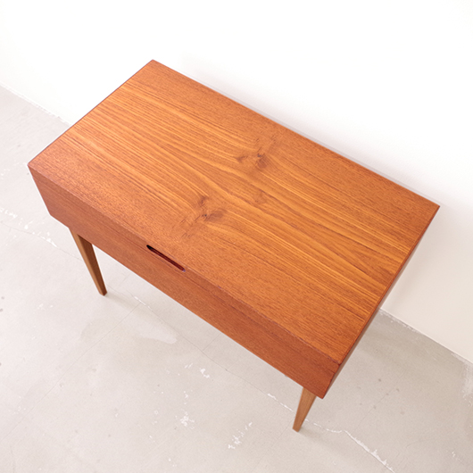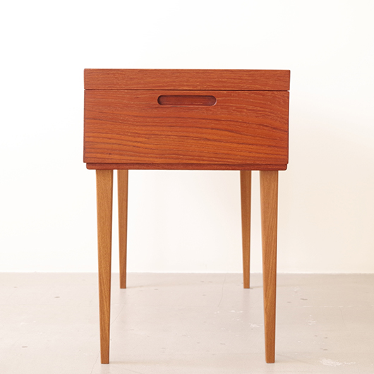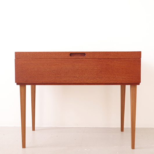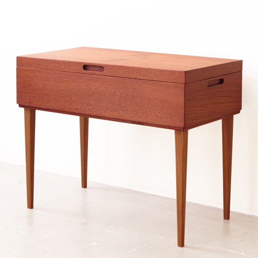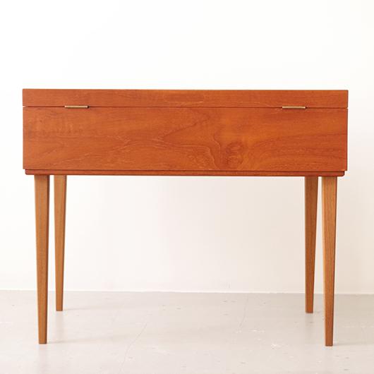 1960年代デンマーク製のヴィンテージソーイングテーブル。 天板を上げると深さのある収納部と様々なサイズに仕切られたスライド式のトレーが現れる、使い勝手の良い細やかなデザインです。そしてスラリとした長い脚部が本体を支えています。両サイドのはオーバル型に繰り抜かれた持ち手がつき、手軽に持って置く場所を変えることができます。 針山はmina perhonen dop chouchoの生地で新しく張替え、合わせて内部の詰め物も交換しております。深い色合いのネイビーの生地に刺繍が施され、物語性のあるファブリックがどこか北欧らしい優しい雰囲気を作り出してくれます。 夜の長い北欧諸国では裁縫が盛んなゆえ、裁縫道具をひとまとめに収納できるこのような家具が作られたのではないでしょうか。またソーイングにこだわらず文具やアクセサリーなどを収納したり、現代の暮らしに合わせた使い方が思い浮かびます。ソファの脇に置いてサイドテーブルのようにお使いいただくのもおすすめです。 丁寧な修復を行い、全体的に綺麗な状態です。そのほか細部の状態などは、画像をご参照ください。
