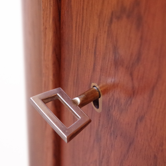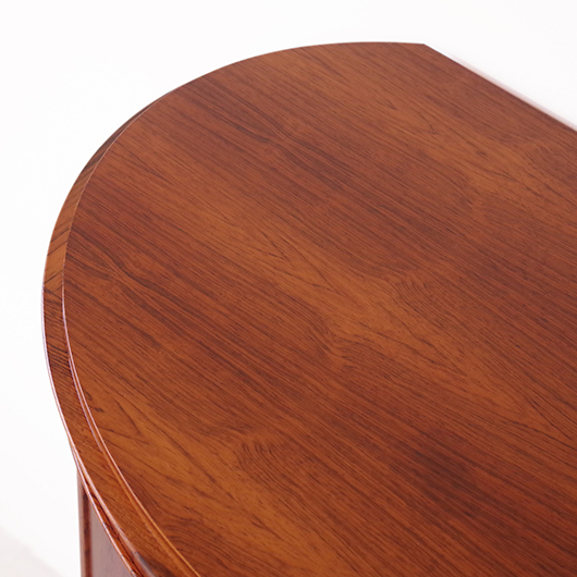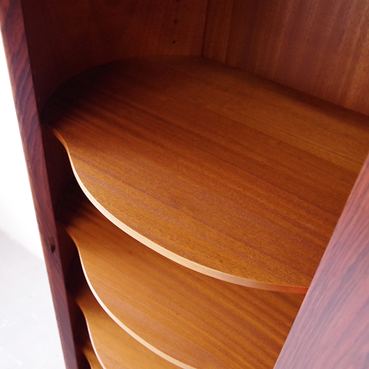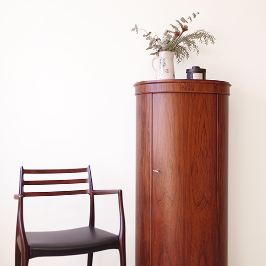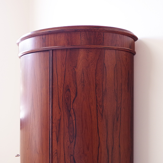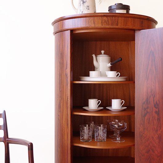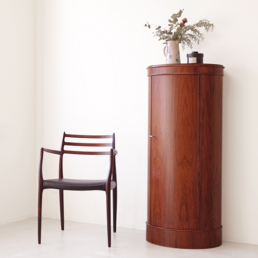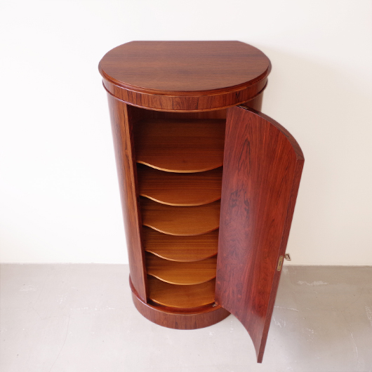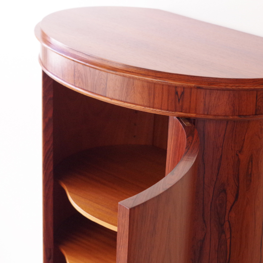Johannes Sorthのデザインによる1960年代デンマークBornholms Moblefabrik製のヴィンテージ キャビネット。 唯一無二の楕円柱型のフォルムが目を引く一台。特筆すべきはそのラウンド型のフォルムで、カーブに合わせて正面の扉も湾曲したラインで作られており、職人の非常に高い技術に驚かされます。鍵を回して扉を開けると、内部は可動式の棚板が5枚備えられた広い収納部となっております。スペースを最大限に生かすように、棚板は曲線を多用した複雑な形をしています。フレームに施されたモールディングなど、高い技術で丁寧に作られていることを随所に感じます。 素材にはワシントン条約のレッドリストに入っている高級木材であるローズウッドが用いられ、ダイナミックな木目が目に飛び込んできます。 内部にはグラスやカップ&ソーサーなどを入れたっぷりの収納力を持った食器棚としてはもちろん、書籍や文具をまとめたりと、様々な場所で活躍してくれそうです。高さが130cmに満たないため、圧迫感なく空間に収まりそうです。上部には花瓶や陶器などを飾ったりと、ディスプレイ棚のようにも使うことができます。 丁寧にサンディング(研磨)をした後に再塗装を行い、自然な艶の良い雰囲気に仕上がりました。全体的に非常に綺麗な状態です。そのほか細部の状態などは、画像をご参照ください。