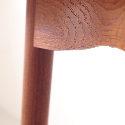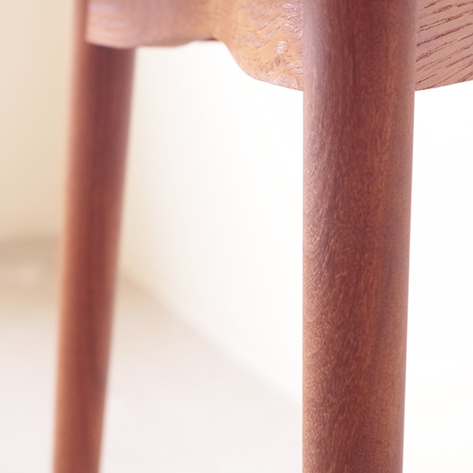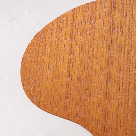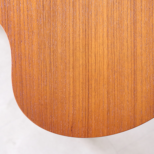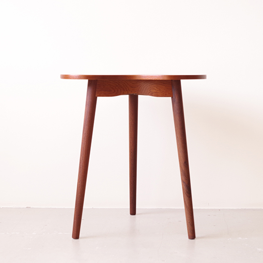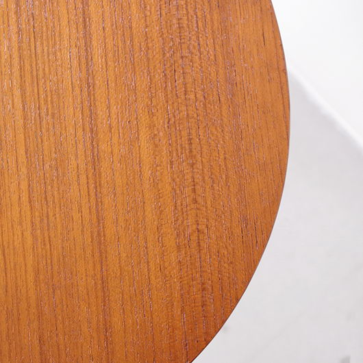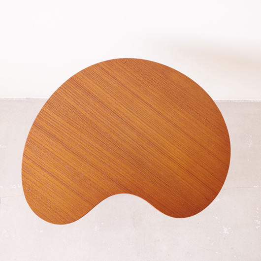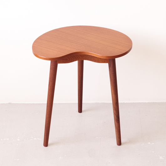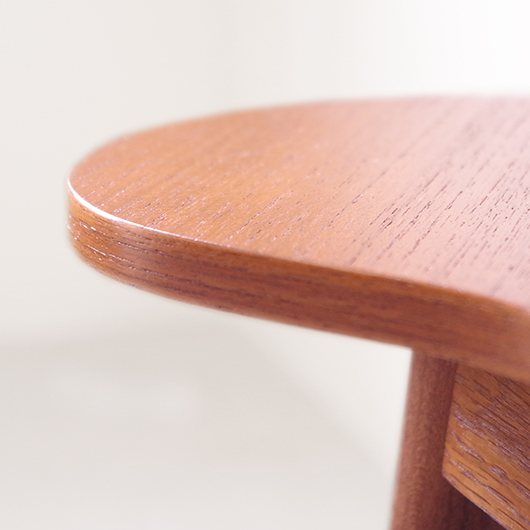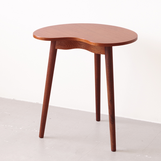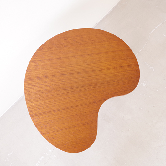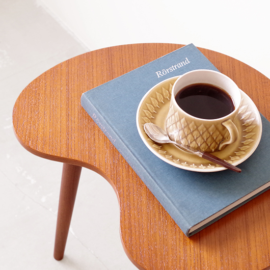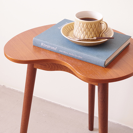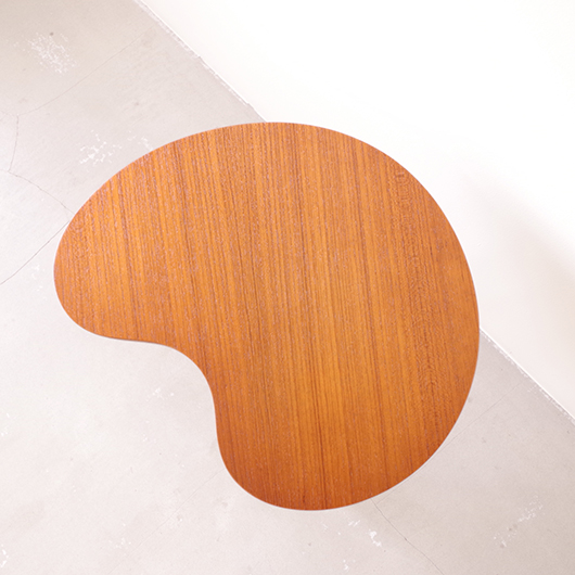 1950年代デンマーク製の、ヴィンテージコーヒーテーブル。 天板は当時流行したキドニーシェイプ(腎臓型)と呼ばれる流線型をしており、コロンと丸みを帯びたフォルムが目を引きます。素材はこの時代ならではの目の詰まったチーク材が用いられ、北欧ヴィンテージらしい雰囲気を作り出しています。 当時の広告に書かれたた商品名”Rygebord"とは”煙のテーブル”の意味で、葉巻とコーヒーカップを乗せてソファ横に置かれた写真が掲載されていました。同メーカーには”Hyggebord"(ヒュッゲなテーブル)と名付けられたテーブルもあり、それぞれ寛ぎのひとときを想定してデザインしていたことに心が温まります。 ソファやロッキングチェアなどの横に置き、新聞を読みながら珈琲を飲むひとときが思い浮かびます。日々の暮らしの中で便利にお使いいただけることと思います。 丁寧に研磨(サンディング)をして小キズや輪ジミを取り除き、その後に再塗装を行いました。全体的にとても綺麗な状態です。そのほか細部の状態などは、画像をご参照ください。
