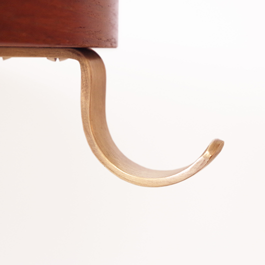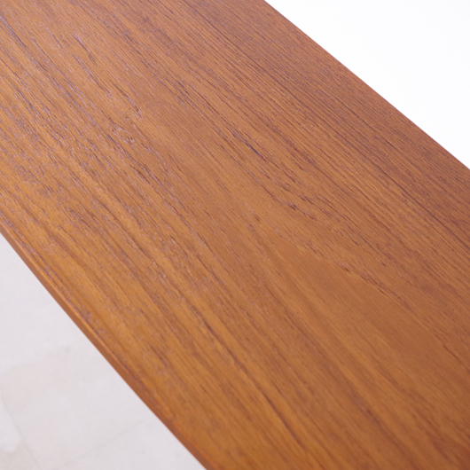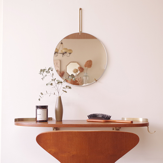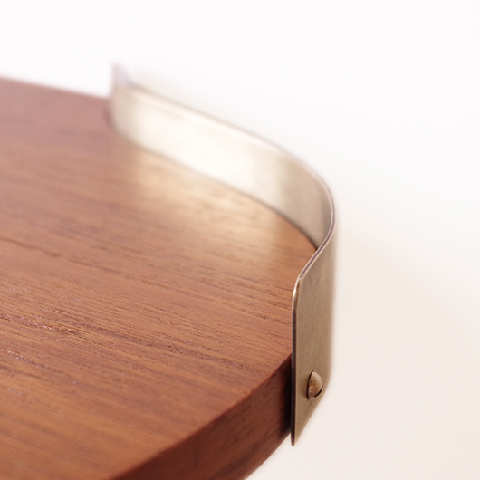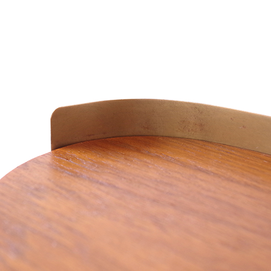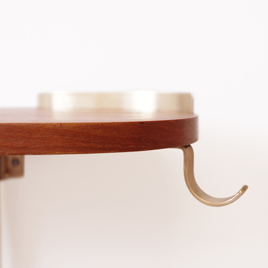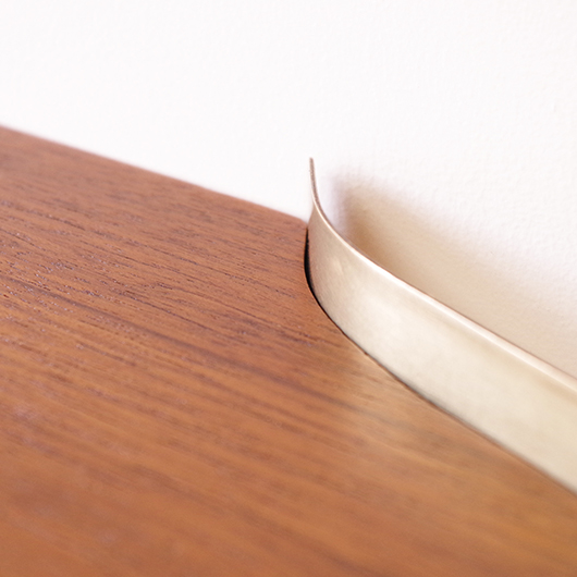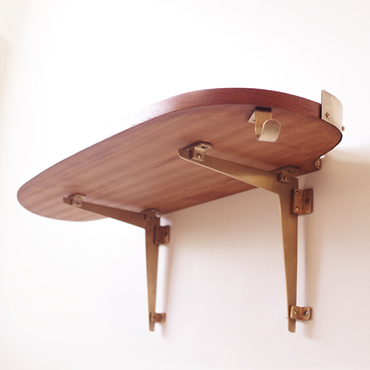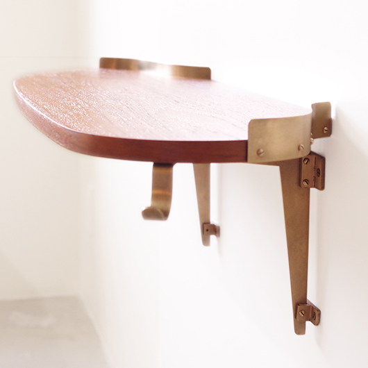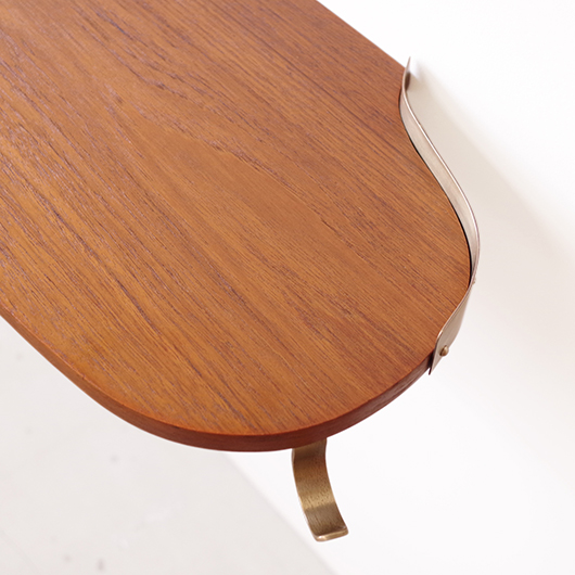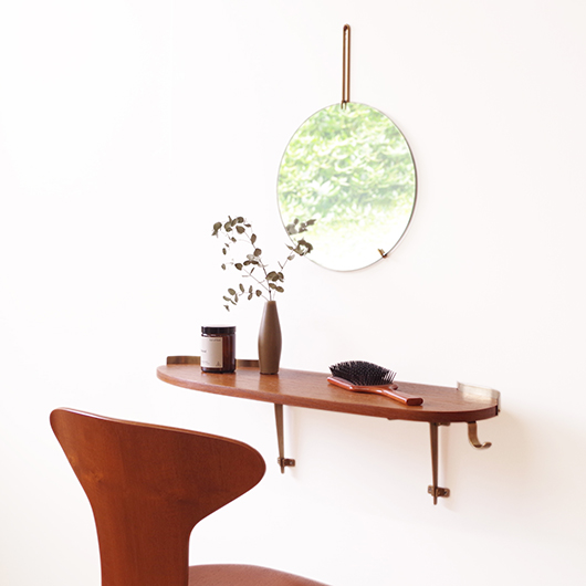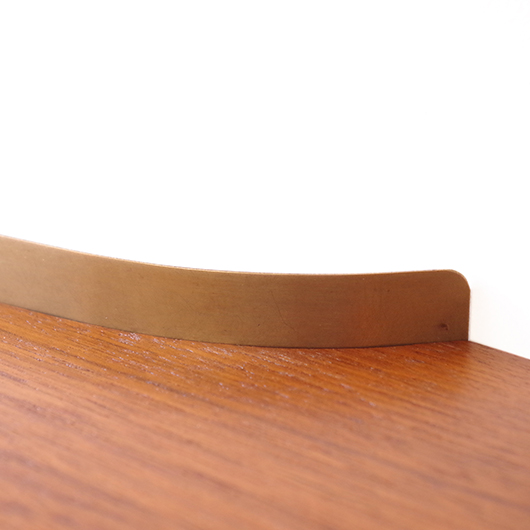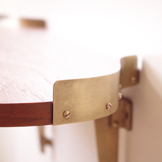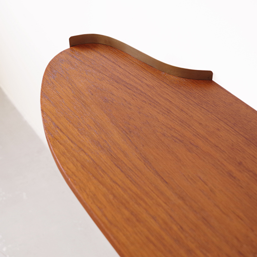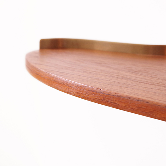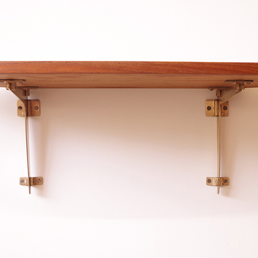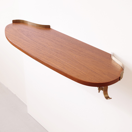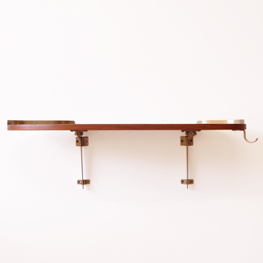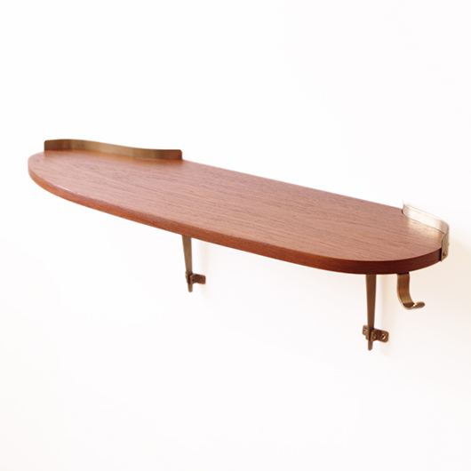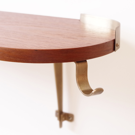 1950年代デンマーク製のヴィンテージウォールシェルフ。 天板右側は緩やかな丸みを帯び、左側はより壁の設置面から先へとオーガニックな曲線を描き、アシンメトリーな天板のフォルムが唯一無二のデザインです。そのフォルムを強調させるようにエッジには真鍮プレートが付けられ、天板に置いたものを落ちにくくするような機能を持たせているようです。さらに右側には同じく真鍮製のフックも備えられています。 そしてもう一つ特筆すべきポイントは天板下方に見える真鍮製の棚受けで、四方から見える特性を活かして棚受けまでをもデザインの一部として魅せるスペシャルな作りとなっております。この手の込んだ凝った作りから推測すると、当時どこかの店舗のために特注品として作られたものと思われます。 上部に壁掛けミラーを合わせれば身だしなみを整えるシンプルな鏡台に、玄関先やリビングに設置してカウンターのように使うのもお勧めです。その他にも飲食店や小さな美容室、サロンなど実用性はもちろん雰囲気作りも大事な要素となる店舗什器としても向いているかと思います。 丁寧な修復を行いまして、綺麗な状態です。僅かな小キズなどございますが、まず気にならない程度かと思います。そのほか細部の状態などは、画像をご参照ください。 ※壁に直接取り付けるタイプとなりますので、下記の注記をご覧ください。