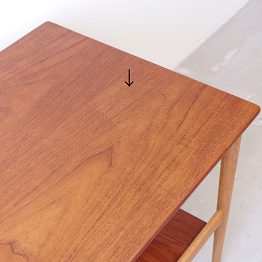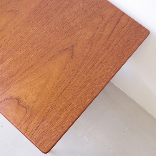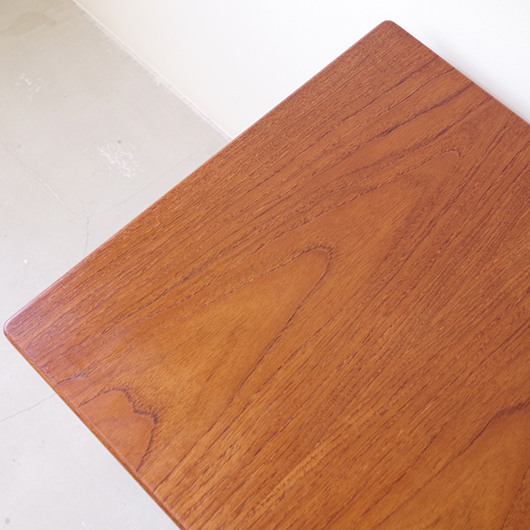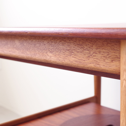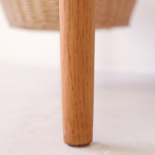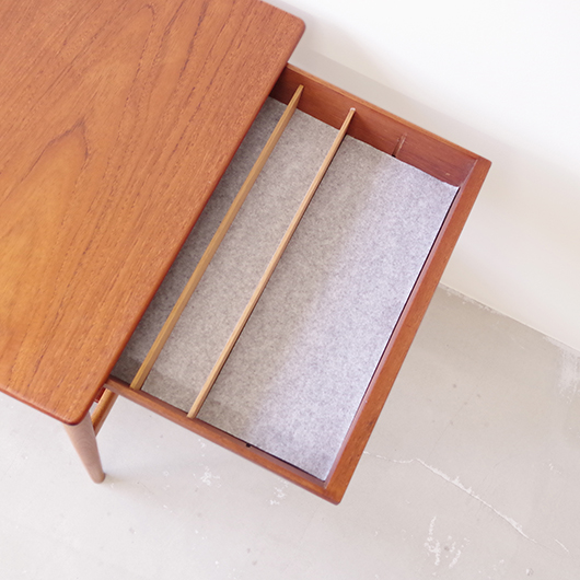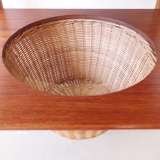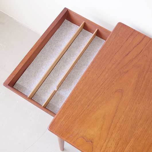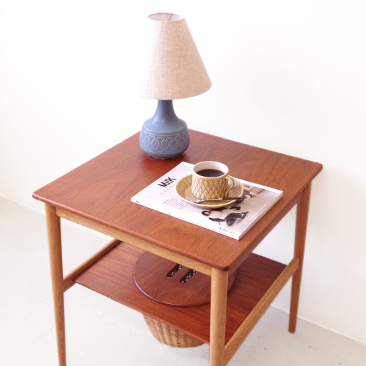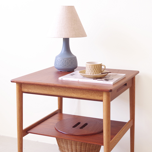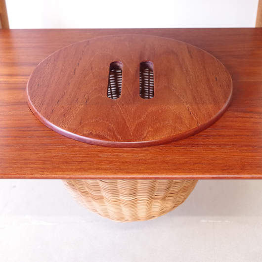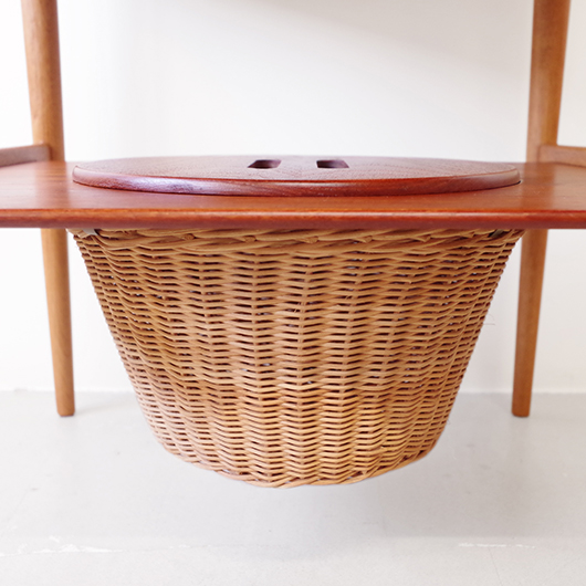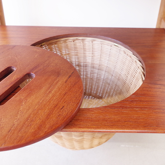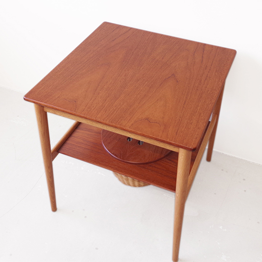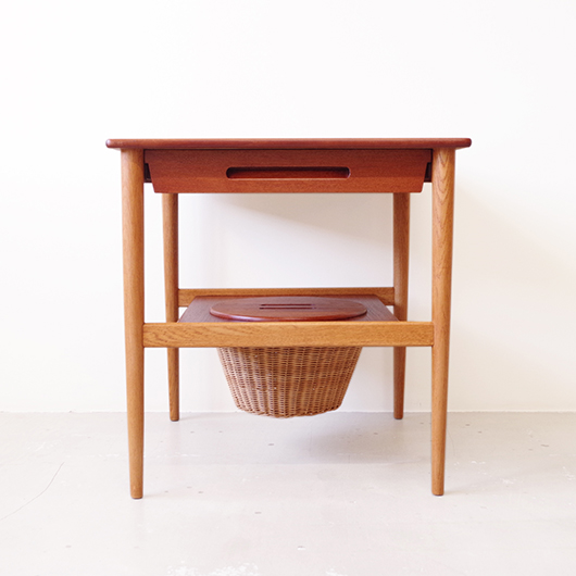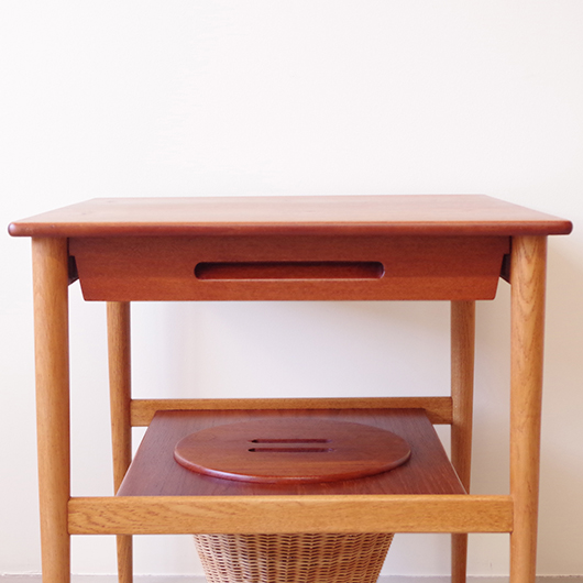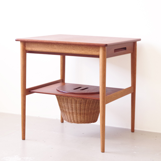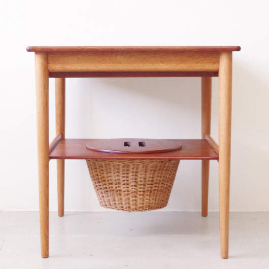 1950〜1960年代デンマーク製のヴィンテージ ソーイングテーブル。 チーク材を用いた正方形の天板にオーク材の脚部フレームを合わせることで、色のコントラストを効かせた一台です。天板下には浅めの引き出しが備わり、左右どちらからでも開けることができます。内部は仕切りによって5つの縦長の部屋に分かれております。 一番の特徴はその下の棚板部分で、中心には厚みのあるチーク無垢材による円形の蓋が付き、まるでボタンのような愛らしいフォルムがやわらかさを添えています。その下にはラタン製バスケットが備わり、北欧ヴィンテージ家具ならではの素材使いです。 夜の長い北欧諸国では裁縫が盛んなゆえ、裁縫道具をひとまとめに収納できるこのような家具が作られたのではないでしょうか。ただ今回のデザインは引出し内部もソーイング専用の作りではないため、文具などよくある小物を収納するのに向いています。引出は左右、または前後に引き出すことができる便利な構造です。ソファの脇に置いてサイドテーブルのようにお使いいただくのもおすすめです。 丁寧な修復を行い、全体的に綺麗な状態です。天板にごくうっすらとした何かを長い間置いていた日焼けと思われる跡が見られますが、光の角度によって見える気にならない程度かと思います。ただ、それを考慮したお値段とさせていただいております。引出底板のフェルトは張り替えを行いましたので綺麗な状態です。引出内の仕切りは一枚外された状態です。そのほか細部の状態などは、画像をご参照ください。