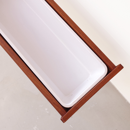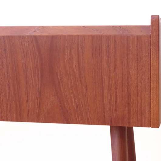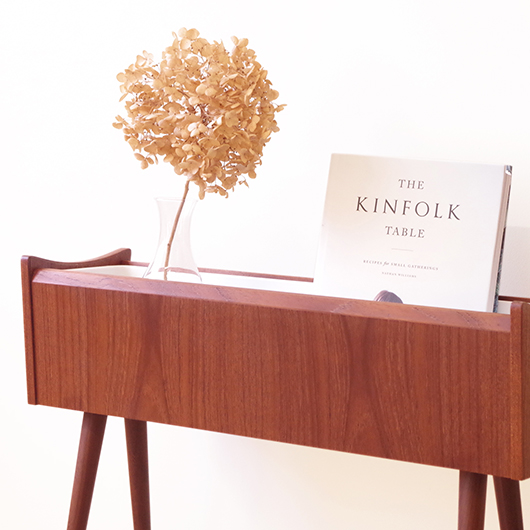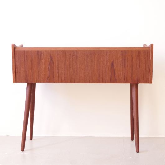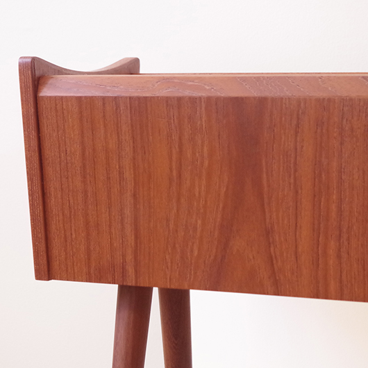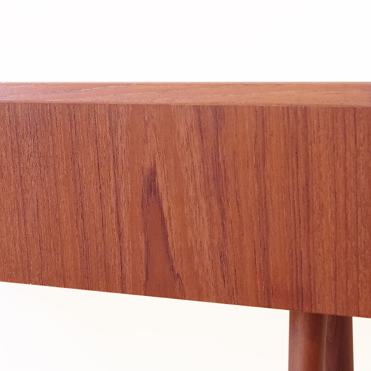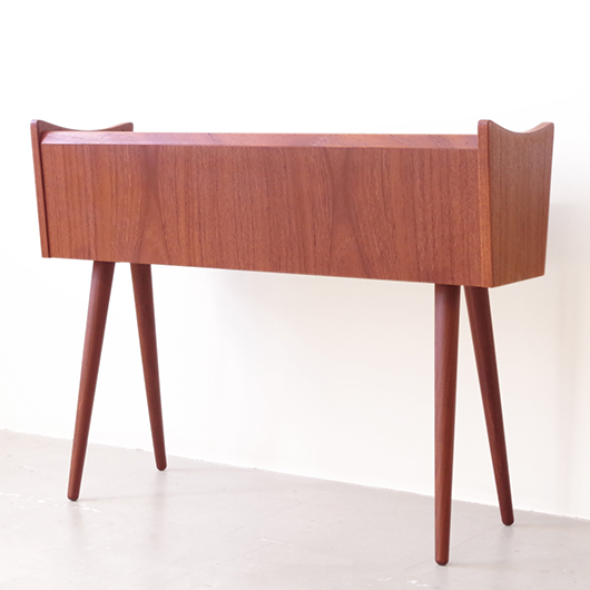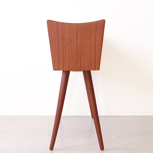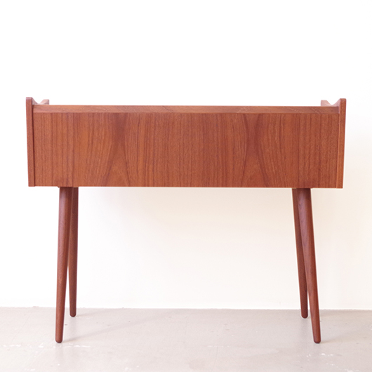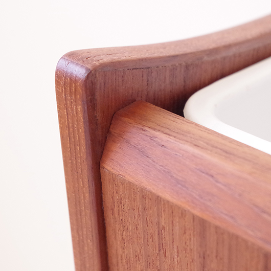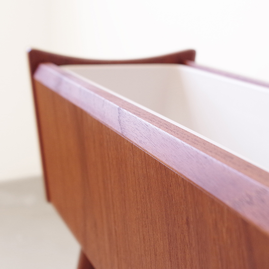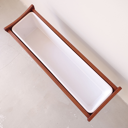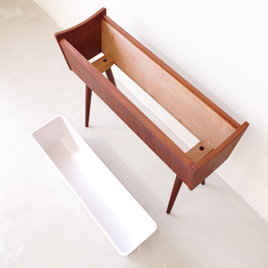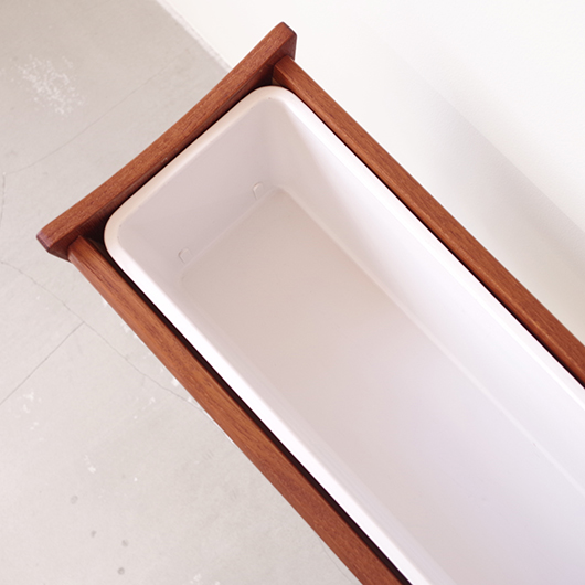 1960年代デンマーク製の、ヴィンテージプランター。 美しい木目のチーク材が用いられた本体から、脚先に向かうにつれて細くなるテーパードレッグの丸脚が末広がりに伸びています。上方へとつまみ上げたような側面のデザインが印象的です。 内部は取り外し可能なプラスチック製の内箱が付属しており、水漏れの心配もなく中に鉢を入れることが可能です。すっきりとしたフォルムで、チーク材の素材の良さもお楽しみいただけます。 窓際や玄関などに置いてお部屋の雰囲気づくりに一役買ってくれる、存在感のある一台です。また植物と合わせて書籍などを入れてマガジンラックのようにご使用いただいても、雰囲気のあるコーナーができそうです。 丁寧な修復を行い、全体的に綺麗な状態です。そして状態の良いプラスチックボックスも、現地でもほとんど見かけることのない希少なものとなりました。そのほか細部の状態などは、画像をご参照ください。