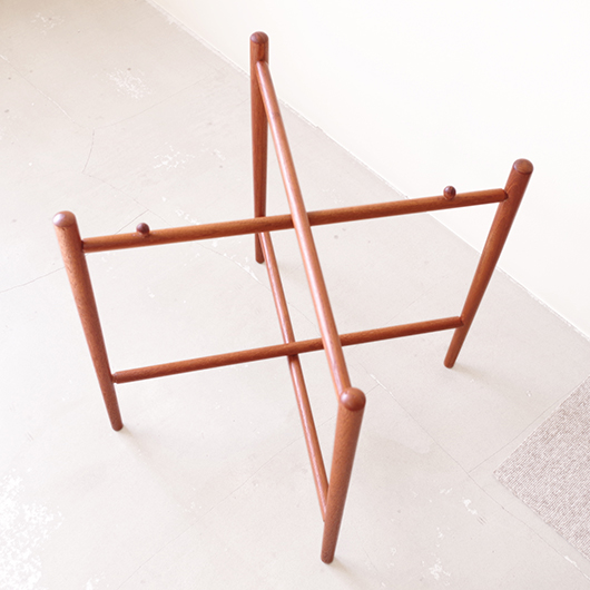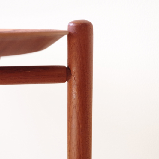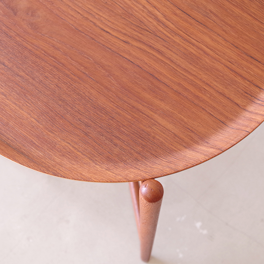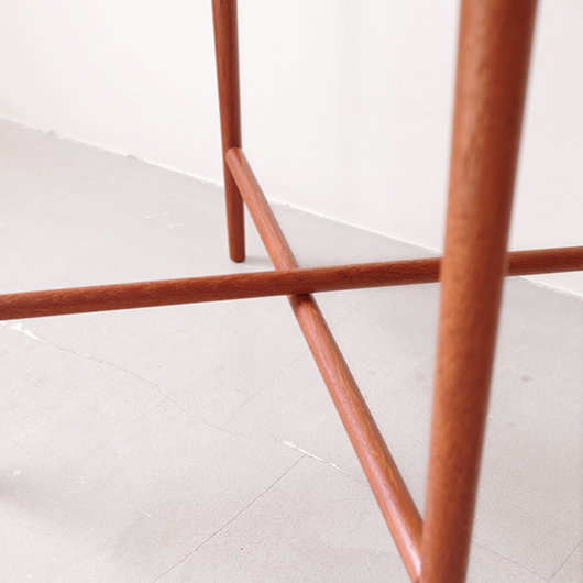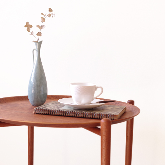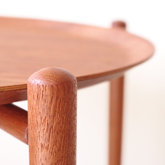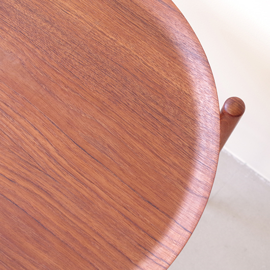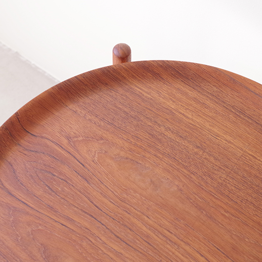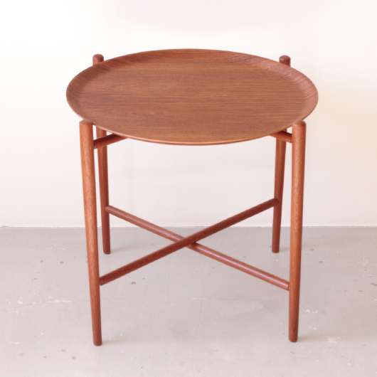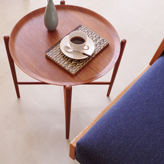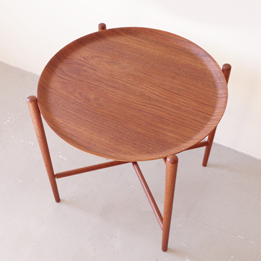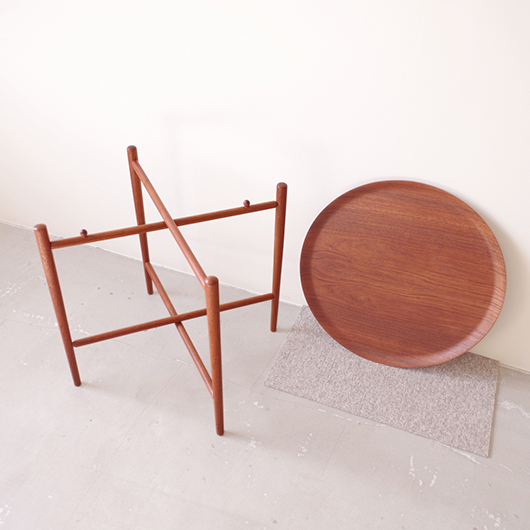 1950~60年代デンマークBROSTROM製のヴィンテージフォールディングコーヒーテーブル。 チーク材の丸い天板は縁が立ち上がっており、プライウッドの特製を生かしたやわらかな曲線が印象的です。脚部は先に向かうにつれて細くなるテーパードレッグで、長い丸脚は北欧ヴィンテージらしさを感じるものです。 一番の特徴は天板がトレイとなっており脚部フレームに載せることでテーブルとなる構造です。キッチンでコーヒーや軽食をトレーに用意してそのままソファ脇に設置したフレームに載せるだけというとても便利な使い方ができます。さらに脚部フレームは折りたたみ式のため、コンパクトに収納が可能。 軽量で簡単に持ち運びができるため、リビングやテラスなどその日の気分で場所を変えて、リラックスタイムのお供に寄り添ってくれることと思います。また折りたたんで省スペースで収納ができるため、必要な時にサッと出せるサブテーブルとしても活躍してくれます。 丁寧な修復を施しまして、全体的に綺麗な状態です。そのほか細部の状態などは、画像をご参照ください。