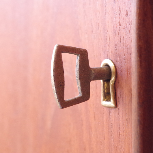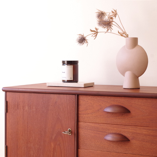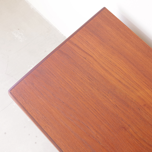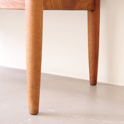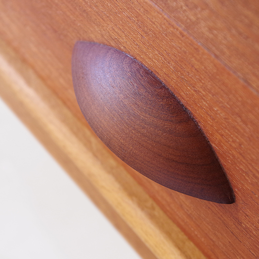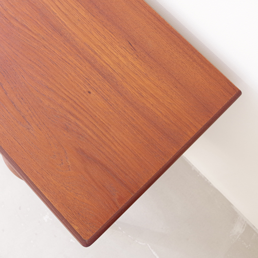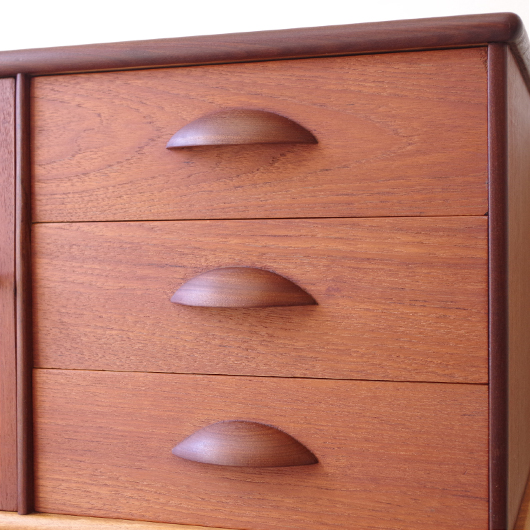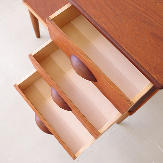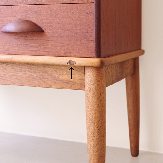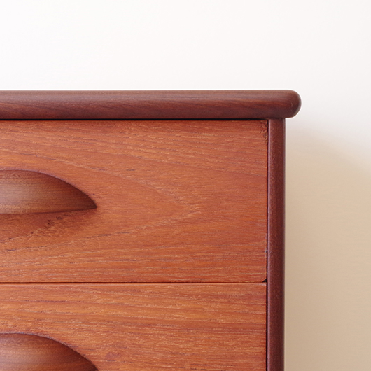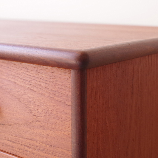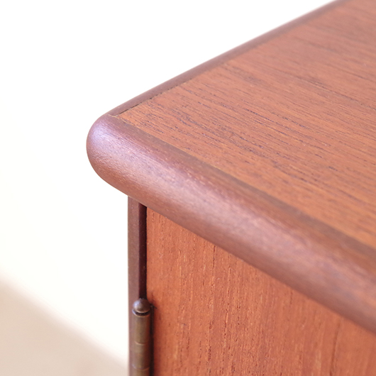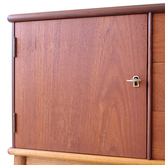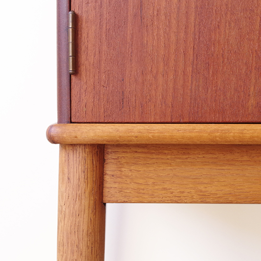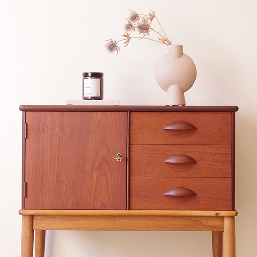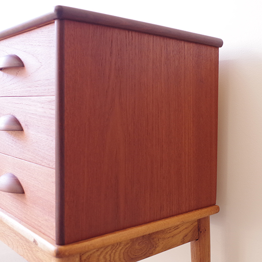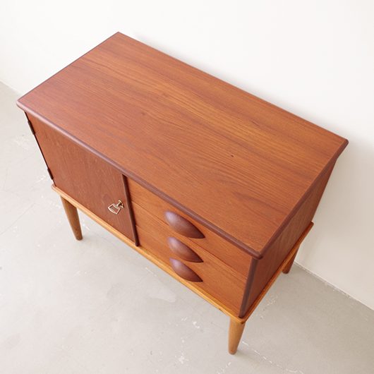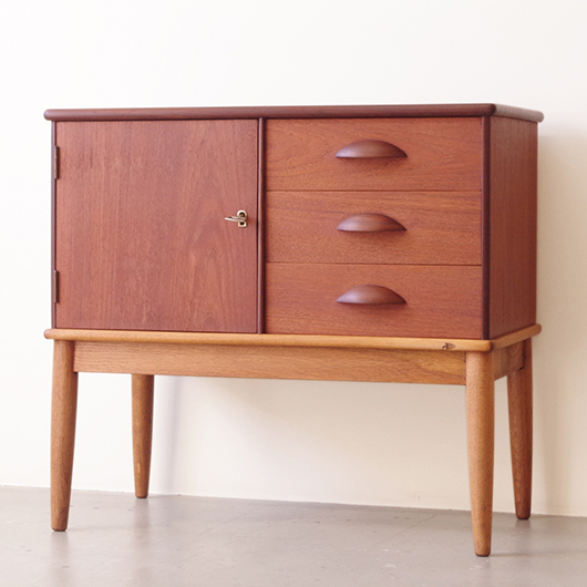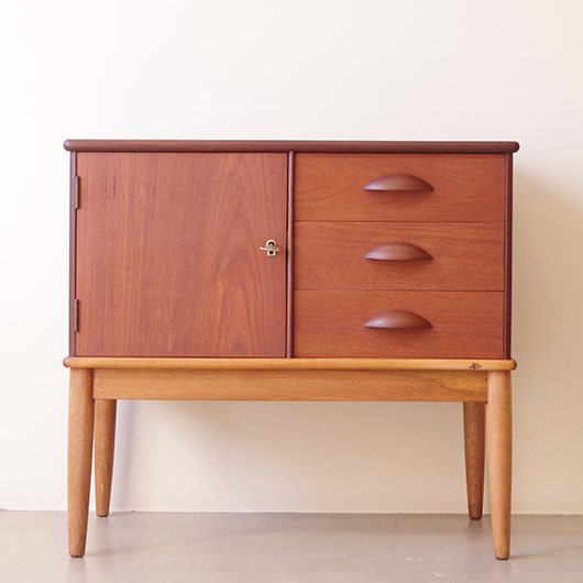 1950年代デンマーク製のヴィンテージ キャビネット。 右側には奥行きのある3段の引出しが付き、アーモンド型の大きめの取っ手がポイントとなっております。左側は雰囲気ある鍵を取っ手にして開くと、高さのある収納部が現れます。天板エッジや脚部など全体的に丸みがあり、やわらかな雰囲気を出しています。 本体にはチーク材、脚部にオーク材と異なる樹種が用いられ、軽やかさを感じます。そしてエッジや取っ手にはチーク材の中でもやや色味の深いアフリカンチーク(アルフロルモシア)として、全体の引き締め役になっているようです。 小ぶりなキャビネットということで、ベッド横に置いてテーブルランプや時計を置いても良さそうです。 丁寧な修復を施しまして綺麗な状態です。引出の底板は新しく交換しているため、気持ちよくお使いいただけます。小キズなど見られますが、雰囲気を損ねない程度かと思います。そのほか細部の状態などは画像をご参照ください。
