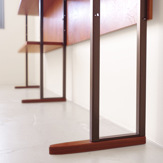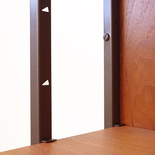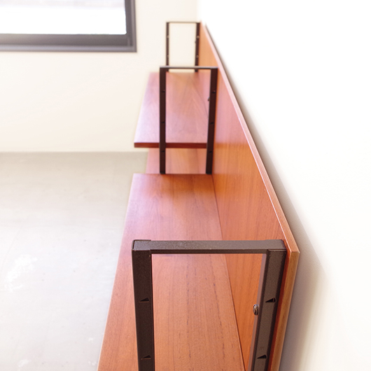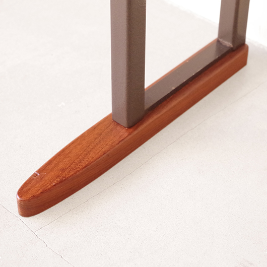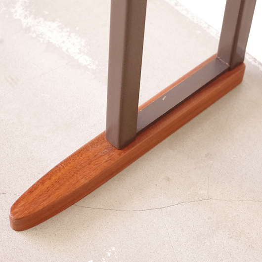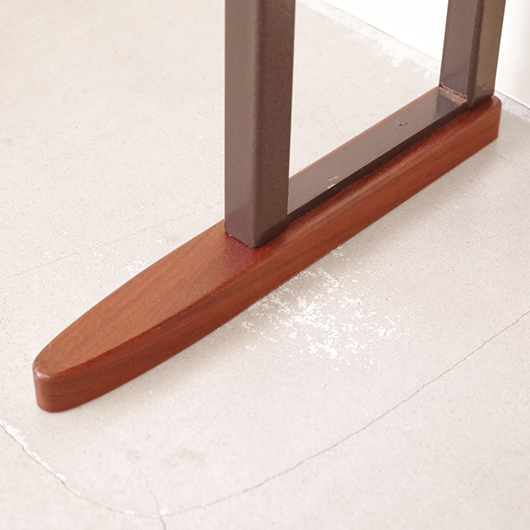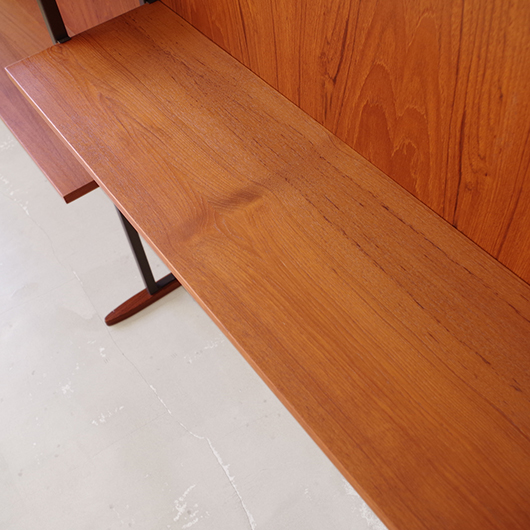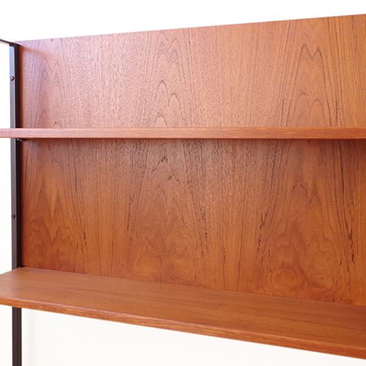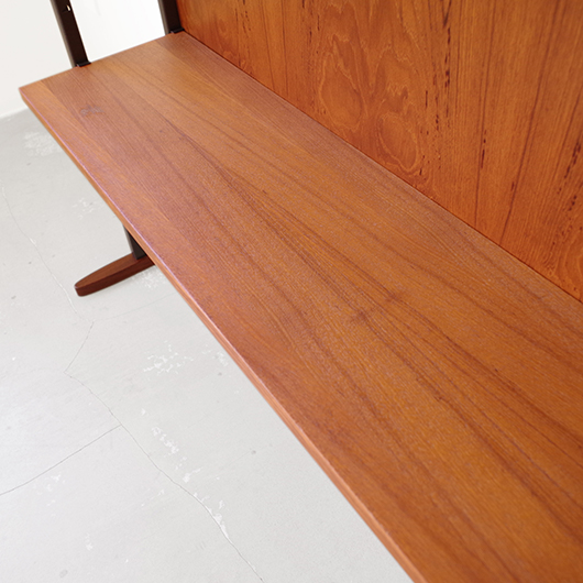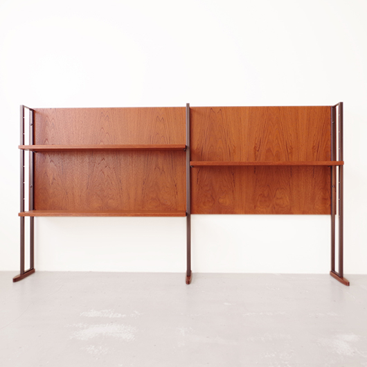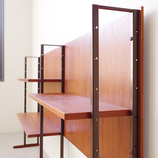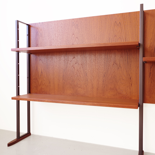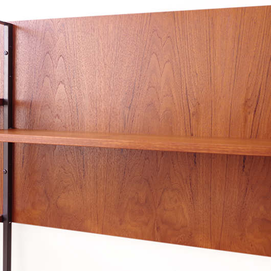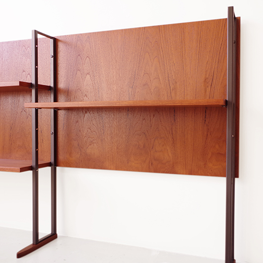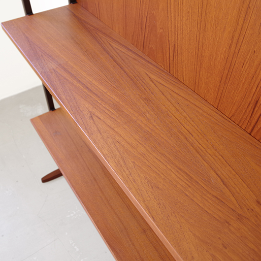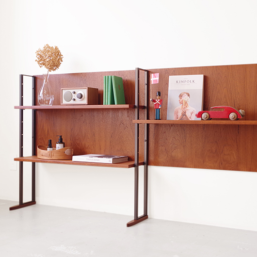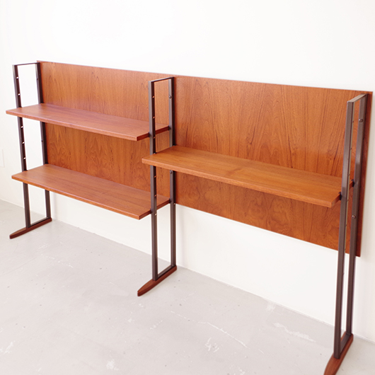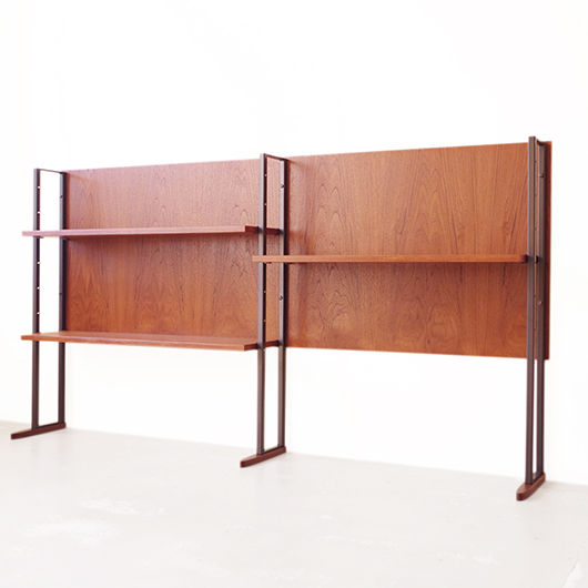 1950年代スウェーデン製のヴィンテージシェルフ。 横長の背板に支柱が3本付き、それぞれに棚板が2枚と1枚備わっています(棚板の位置は固定)。フレームはブラックペイントされたスチール製で、チーク材ともよくマッチしてモダンな印象を与えてくれます。そして支柱の先端にチーク無垢材による脚部を合わせることで、デザイン性を高めているようです。また、背板の下方がオープンになっていることで抜け感のある軽やかな印象です。 本棚としてはもちろん、チーク材の背面は置いたものを際立たせてくれるため、飾り棚として一般のご家庭やショップの店舗什器としても活躍してくれそうです。まるで壁付のウォールユニットが自立したような初めて見るデザインのため、当時どこかの店舗什器としてオリジナルで製作されたのかもしれません。 丁寧な修復を施しまして全体的に綺麗な状態です。そのほか細部の状態などは、画像をご参照ください。