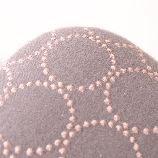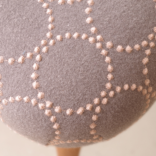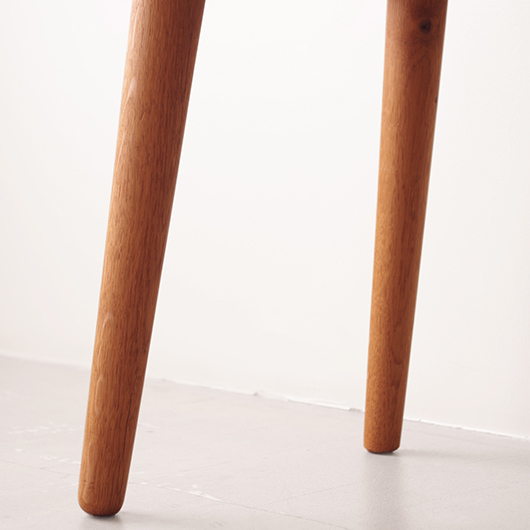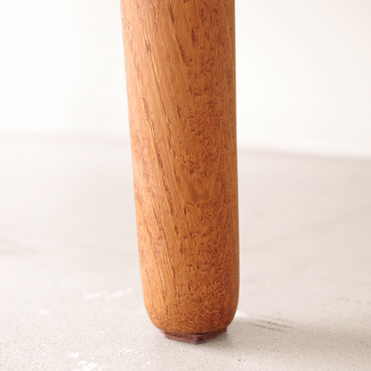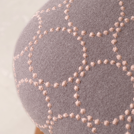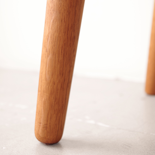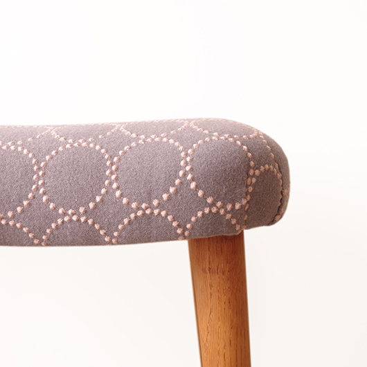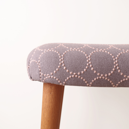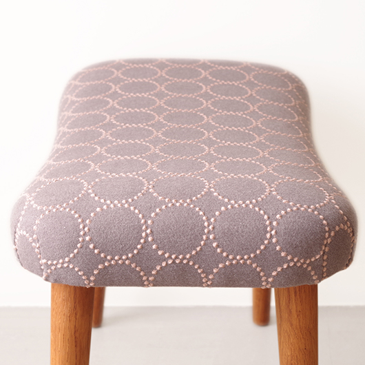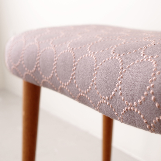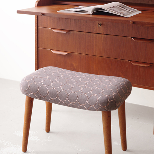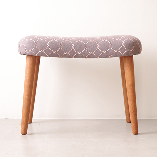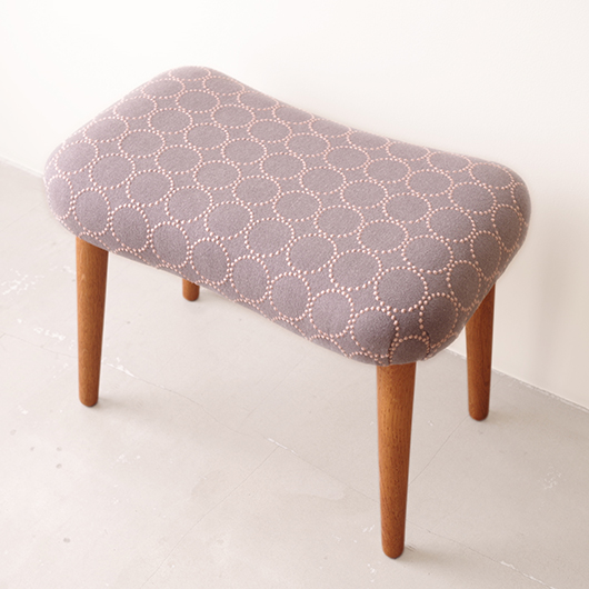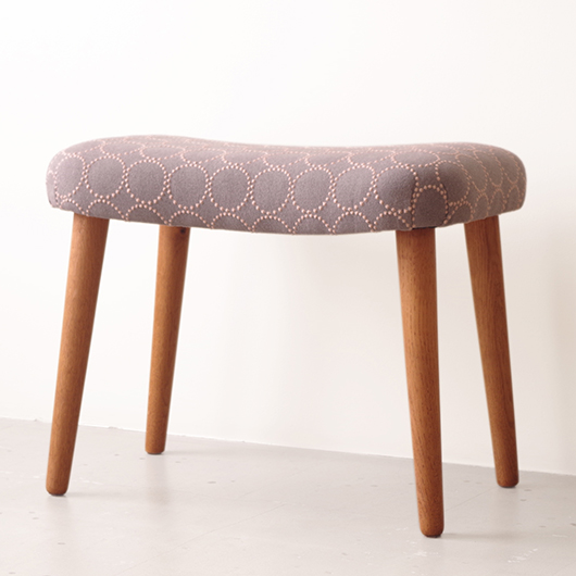 1960年代デンマーク製のヴィンテージスツール。 丸みを帯びた座面は長辺それぞれの中心にくびれを持たせた有機的なフォルムが特徴で、やわらかな雰囲気を作り出しています。座面は緩やかなアールを描いており、座った際にすっと体にフィットしてくれます。そしてその下からオーク無垢材を用いた丸脚が末広がりにスッと伸びています。 座面はmina perhonen dop tambourineを用いて張り替えを行いました。グレー地にベビーピンクで円形のに刺繍が施された生地で、物語性のあるファブリックのやわらかな雰囲気がフレームともよくマッチしています。 玄関先に置いて靴を履く時に使用したり、ソファに合わせてオットマンとして利用したりと、日々の暮らしの中で幅広く活躍してくれることと思います。 丁寧な修復を行いまして全体的に綺麗な状態です。張替えの際には座枠に張られたウェービングテープも合わせて交換しておりますので、座り心地も良好です。そのほか細部の状態などは、画像をご参照ください。