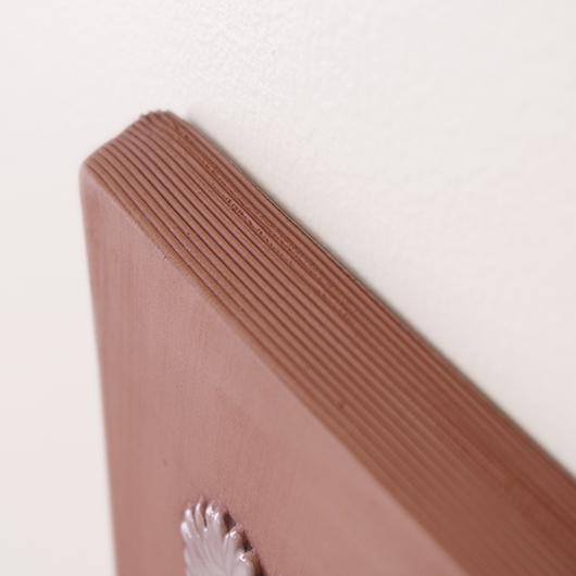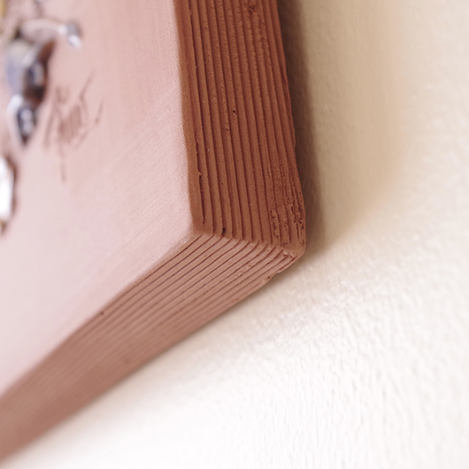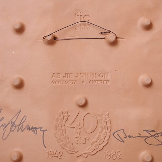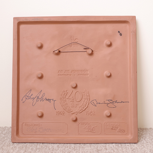 1942年に開窯したスウェーデンのJie Gantofta窯で製作された、Aimo Nietosvuoriデザインのヴィンテージ陶板。 ヒナゲシやヤグルマギク、カンパニュラなどの花々を、緑色のリボンで束ねたブーケが描かれています。テラコッタ色の素地の上には朱色や紫色、山吹色と色鮮やかな花を散りばめ、30cm角という大きめのサイズで存在感のある一枚です。 1942年にJohn Ewert JohnsonがAB Jie Johnsons Keramiska Fabrikという名で創業し、2年後に南スウェーデンのGantofta村に移ったことで社名をJie Gantoftaへと変えました。この陶板はそんなJieの40周年を記念して作られたもの。裏面には限定250枚のうちのシリアルNo.229、Siriさんへの贈答と書かれています。そのため販売用ではなく顧客などへ送られた記念品だったのではないでしょうか。 フックなどに引っ掛けて壁掛け飾りとして、または皿立てなどを用いるとチェストなどの天板に置くことも可能です。リビングや玄関などにさっと飾るだけで、周りを華やかにしてくれそうです。 大きなチップなどなく、綺麗な状態です。素地部分にやや経年感が見られますが、それらを含めてヴィンテージらしい味わいを出しています。そのほか細部の状態などは、画像をご参照ください。
