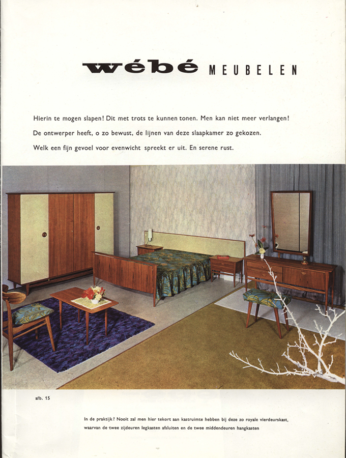 これは家具工房Webe Meubelenの1960年のカタログで、当時工房のチーフデザイナーとして活躍していたLouis Van Teeffelenのデザインした家具が掲載されています。 ベッドの左側に置かれているのが今回のキャビネットで、同シリーズの2段チェストと組み合わせてナイトテーブルのセットとなっています。サイズはまったく同じなので対のナイトテーブルとして引き出しの仕様が異なるものがセットになるのが面白いですね。