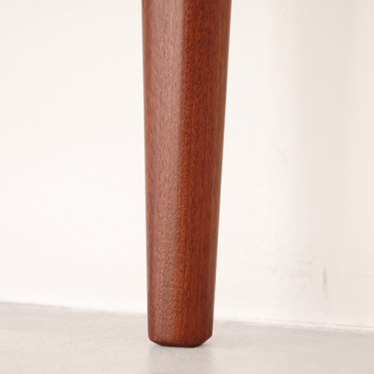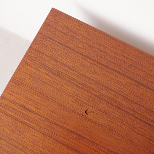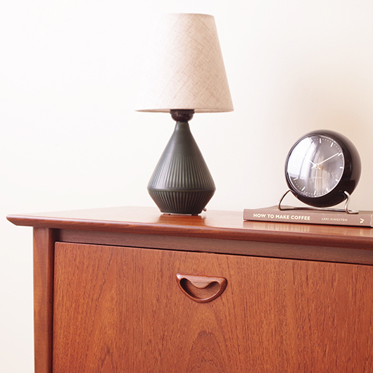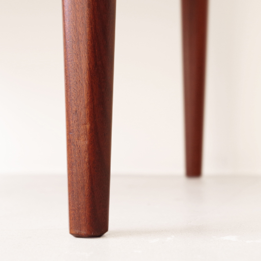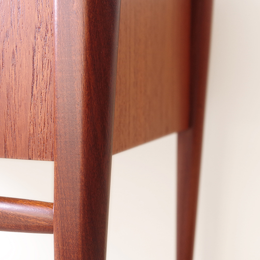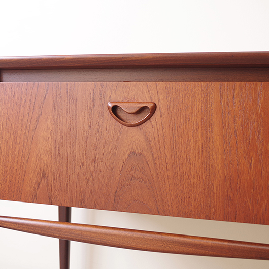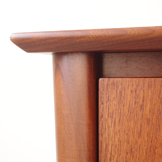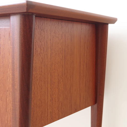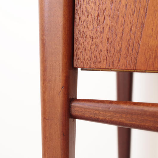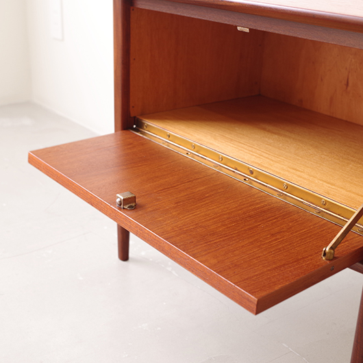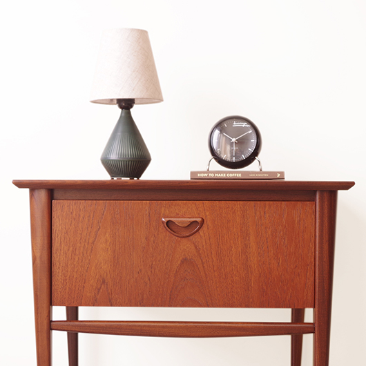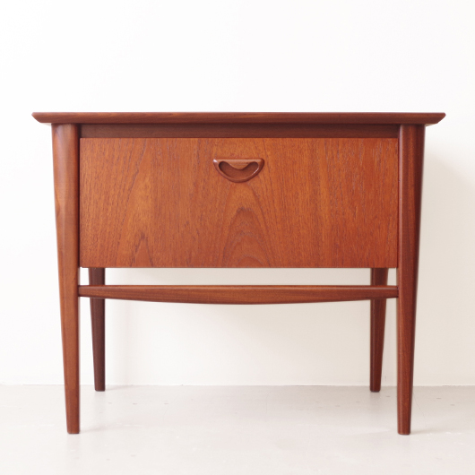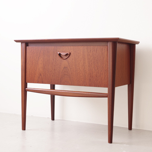 デンマークで買い付けました1960年Louis Van Teeffelenデザインの、オランダWebe Meubelen製のヴィンテージ ベッドサイドキャビネット。 チーク材の天板のエッジにはテーパーがかけられ、四隅を支える脚部は下方へ向うにつれて楕円から丸へと滑らかに変化していきます。 一番の特徴となっているのは扉の仕様で、正面の取手を手前に引くフリップ式となっております。チーク無垢材を用いた取っ手は彫刻的なデザインで指がかりもよく、内部は広い収納部が現れます。 当時のデザインの最先端であったデンマークのモダン家具は周囲の国にも影響を与えており、このWebe Meubelenの1960年のカタログを見てもデンマークスタイルの家具としてオランダ国内や隣国へも輸出されていたそうです。 ナイトスタンド、ナイトテーブルとも呼ばれるこちらは、ベッドの横に置いて目覚まし時計などを乗せて使用するものですが、もちろんその他玄関先やリビングでも活躍してくれそうです。当時のカタログではベッドサイドに置き、テーブルランプと合わせてディスプレイされていました(下記参考資料ご参考)。 丁寧な修復を施しまして全体的に綺麗な状態です。収納部に極僅かに化粧品の匂いが残りますが気にならない程度と思います。そのほか細部の状態などは、画像をご参照ください。