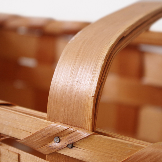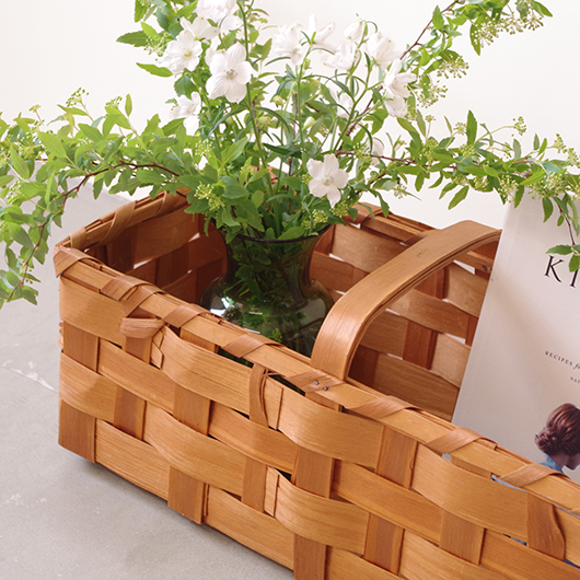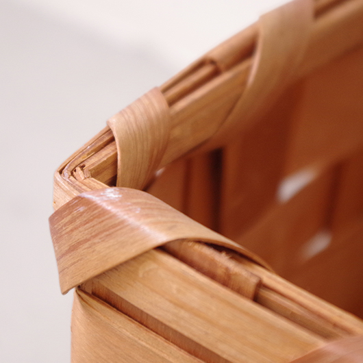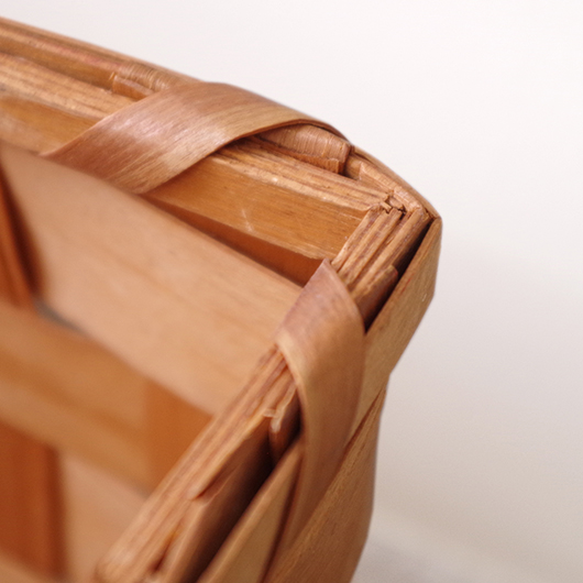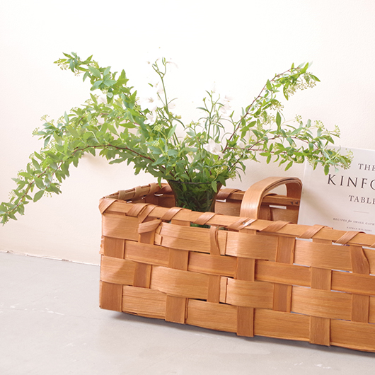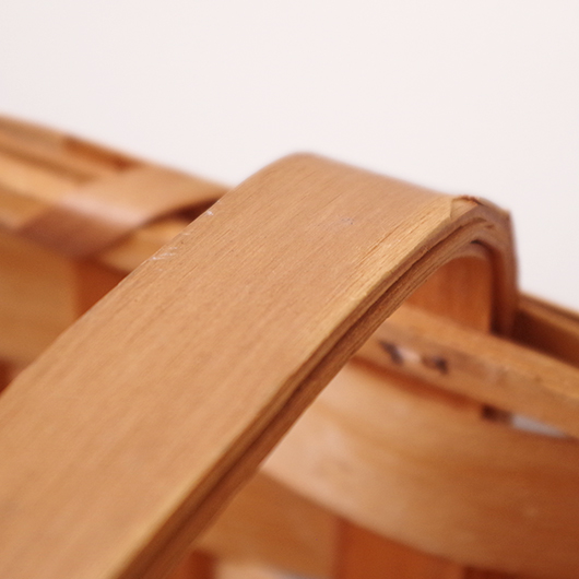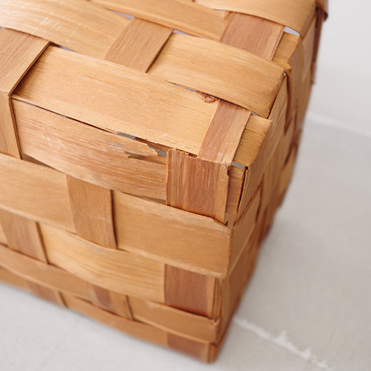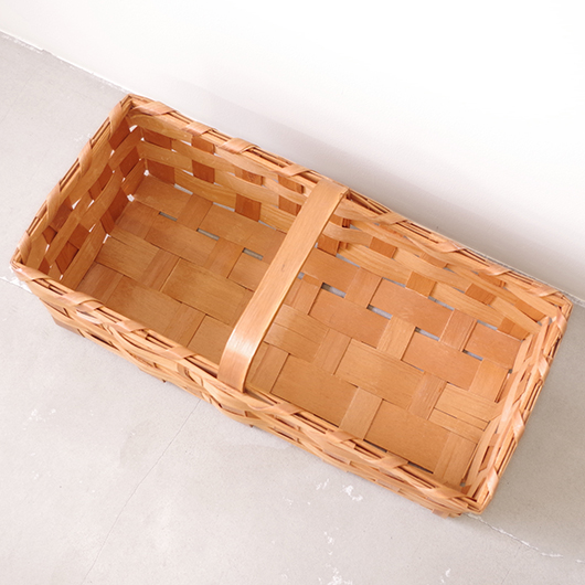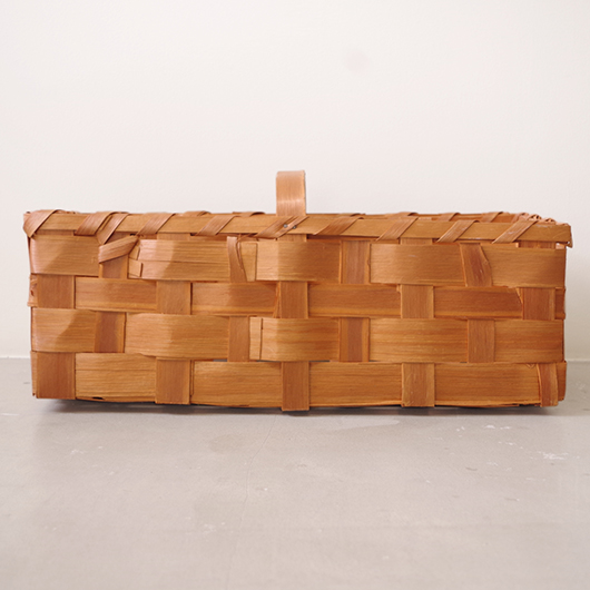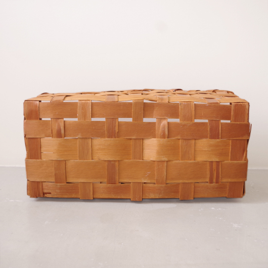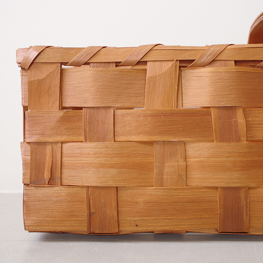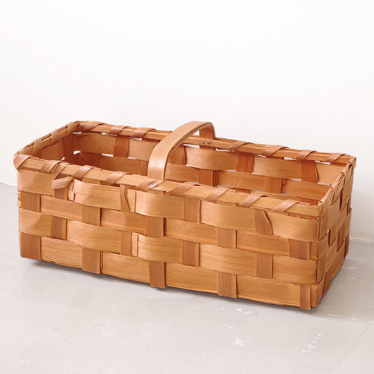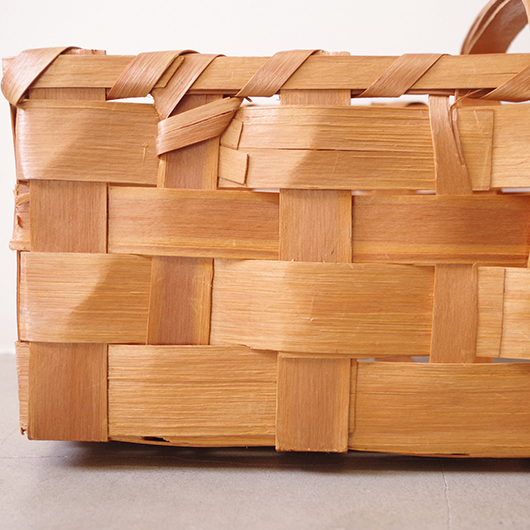 スウェーデン・ダーラナ地方で生まれた伝統手工芸品であるヴィンテージ バスケットSpånkorg。 ワイドのある横長サイズのバスケットに取っ手のついたバスケットで縦横で幅の異なる板によって編まれ、上部縁はクルクルと螺旋状に巻いでデザイン製をプラスしています。これはsvampkorgマッシュルームバスケットと呼ばれる形で、森にキノコを採りに行くお供に持っていくバスケットとして生まれました。 Spånkorg(スポーンコリ)とは、木材を薄く削いで作ったへぎ板(=Spån)を編んでバスケット(=korg )のこと。素材は北欧のパイン材が用いられています。 経年によって飴色に変化した木肌は、新品の白みの強いのものとは同じ樹種と思えないほどです。味わい深く経年変化した木肌からは、年輪に合わせてナイフで薄く削いでゆく職人の手仕事ゆえの荒々しさも感じます。 元々軽めのものを入れるために作られているため、インテリアとして室内で飾ってはいかがでしょうか。ワイドを活かして取っ手を仕切りにフラワーベースや雑誌を入れるだけでとても雰囲気よくまとまります。また麻袋などと合わせて玉ねぎなど常温保存の野菜を保管するベジタブルストッカーとしてキッチンにおいても良さそうです。 ”Loppis(蚤の市)”コーナーということで、ヴィンテージの味わいを残した仕上げとなります。下方エッジに小さなワレ箇所など所々に経年感が見られます。それらを考慮したお値段とさせていただいておりますが、雰囲気を損ねる程ではないと思います。全体としては良好な状態を保っています。そのほか細部の状態などは、画像をご参照ください。