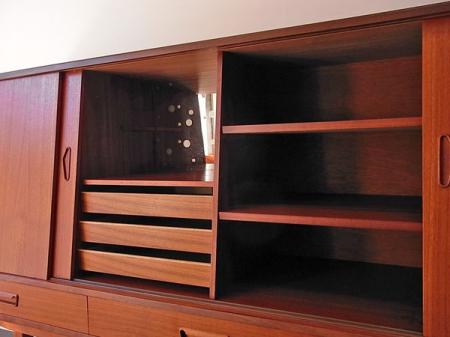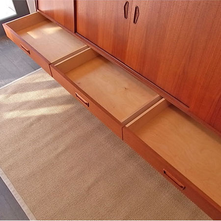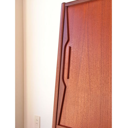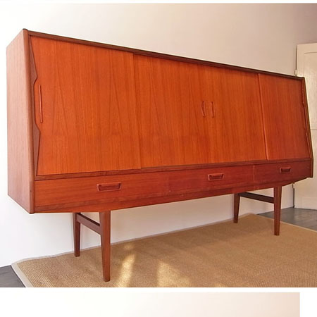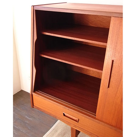 北欧より直接買い付けました、1960年代頃のデンマーク製 サイドボードです。ヴィンテージの古いものですが綺麗で良好な状態を保っています。 出品前にクリーニング済みで仕上げはオイルフィニッシュです。天板の目立たない輪染みや、鏡に曇りといった経年感があります。 中央左扉のレールの受けと、鏡の前に付く棚板が付属していませんが、使用に問題はございません。
