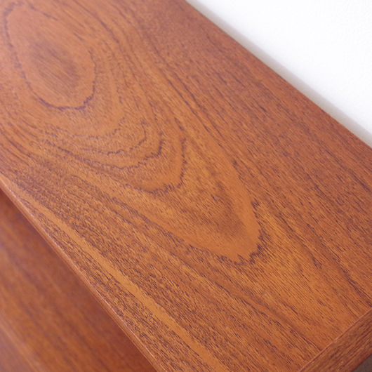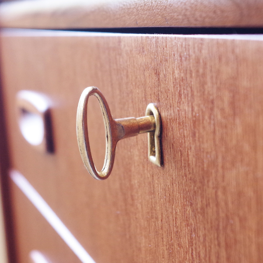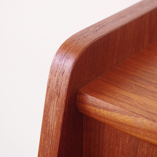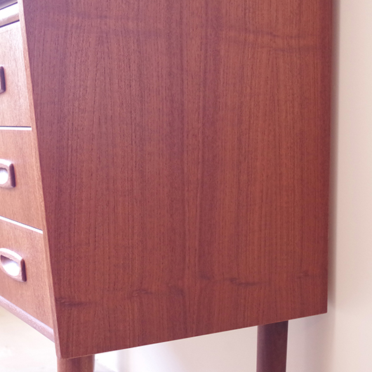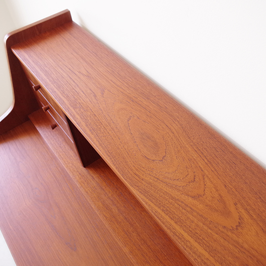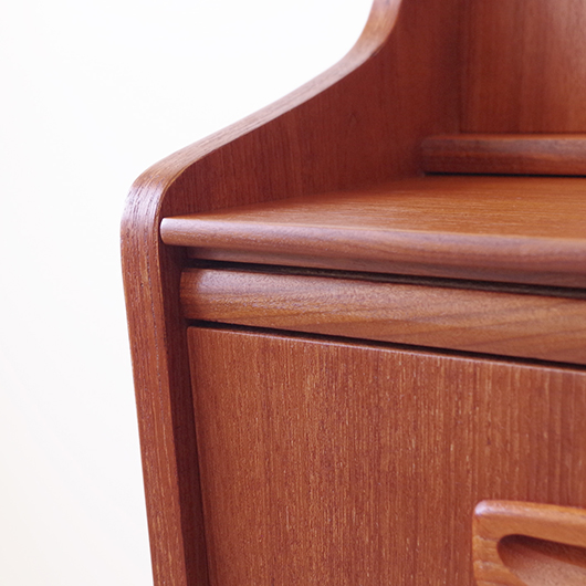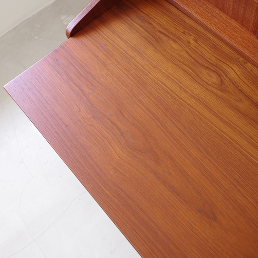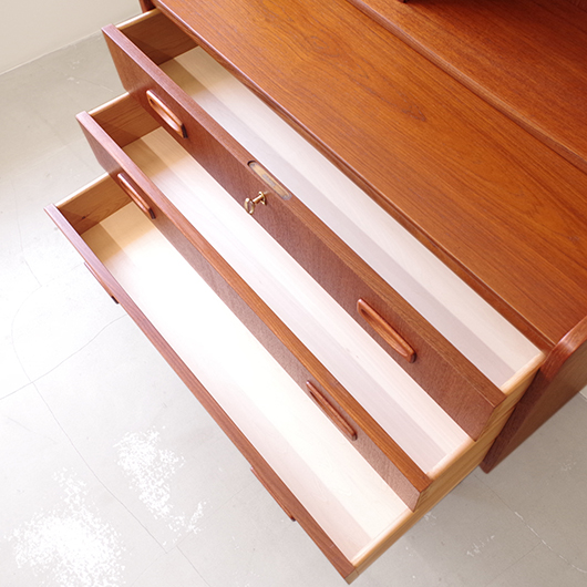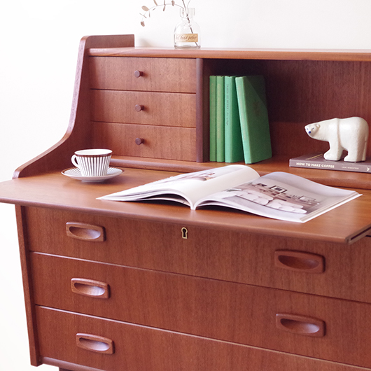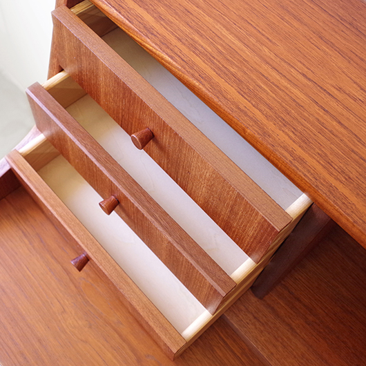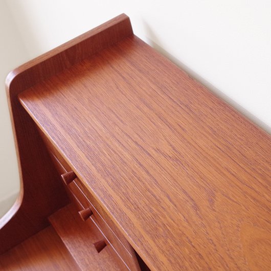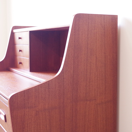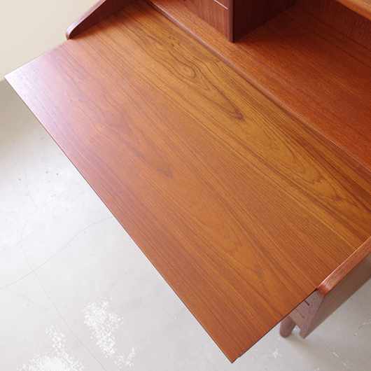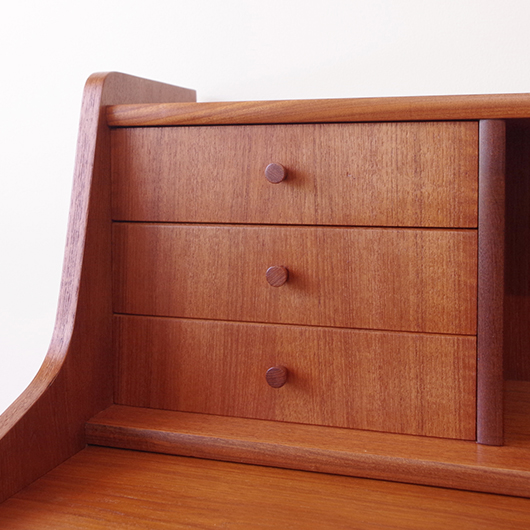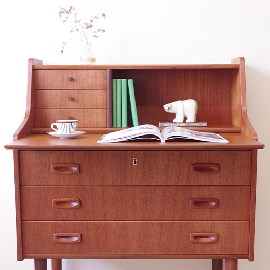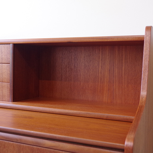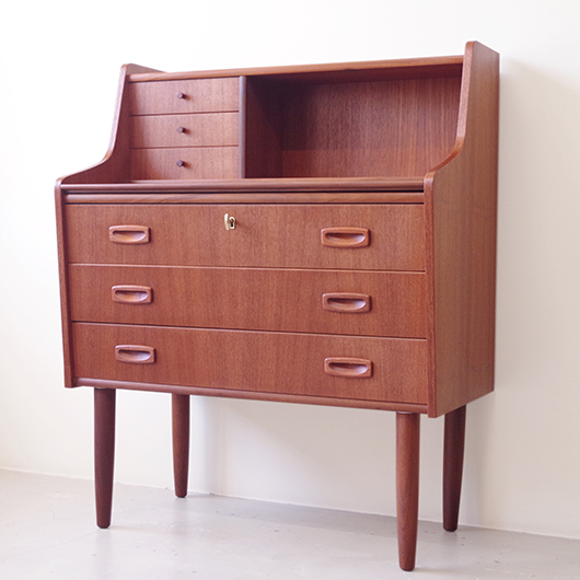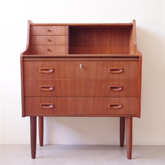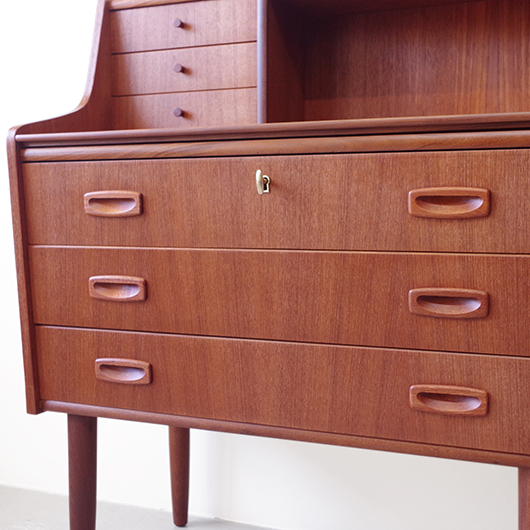 1960年代デンマークHanbjerg Møbelfabrik製のライティングビューロー。 天板を引き出すとデスクに、下側は3段のチェストとなる便利な一台。上部左側には小引出しが3段、右側は広いオープンスペースが備わります。 天板下は3段チェストとなっており、チーク無垢材の刳り貫きによる取っ手がデザイン性をプラスしています。そして最上段には雰囲気のある鍵が付属し貴重品などの保管にも良さそうです。このチェスト部分は下に向かうにつれ奥行きが狭まっており、デスクとして使用する際に膝が当たりにくい設計となっています。さらに引出し正面エッジにテーパーを掛けることで陰影が生まれるような細かな意匠であったりと、細部にまで丁寧に作られた一台です。 お気に入りの雑貨をディスプレイしたりパソコン机として使用したりと、様々な使い方が想像できます。リビングの脇に置いても、落ち着いた佇まいで他のインテリアとも馴染むことと思います。 丁寧な修復を行い、全体的に綺麗な状態です。引出し底板は全て新しく交換済みで、清潔にお使いいただけます。そのほか細部の状態などは、画像をご参照ください。