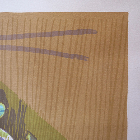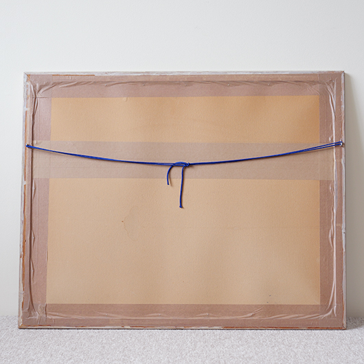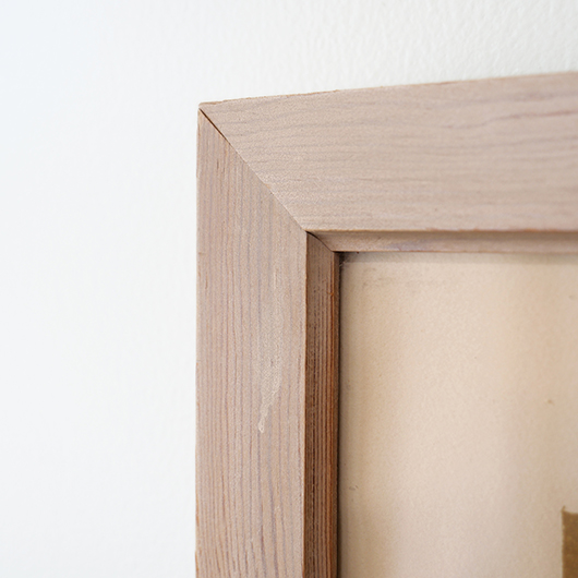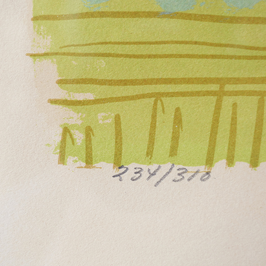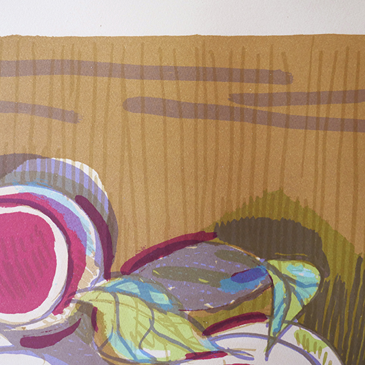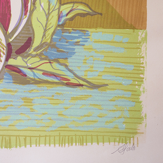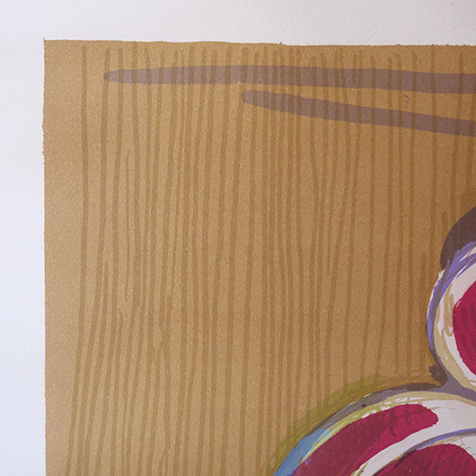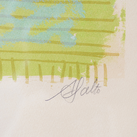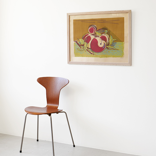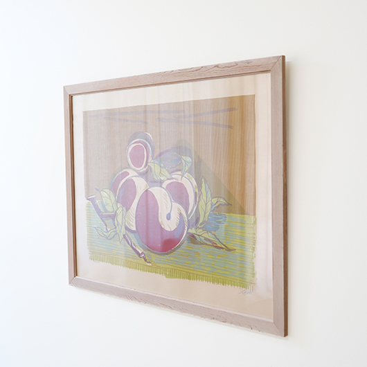 デンマークを代表する芸術家、Axel Saltoによる多色刷りのLithograph 。 台の上に枝と葉のついた桃が4個描かれています。紫色を帯びたワインレッドのような深みのある色味の桃は、果肉のしっかりとしたヨーロッパの桃らしさを感じます。置かれている台も葉と同様の若草色にスカイブルーを乗せ、背景は明るめの土色を。全体的にはっきりと大胆な色合わせであるにもかかわらず、彩度を低く抑えて落ち着きのあるトーンで纏めあげています。 同様の構図で描かれた木版画の荒々しさと比較すると、華やかさのある作品となっております。サイズも幅70cmほどと大きめのため、サイドボードの上部などに合わせても十分な存在感を発揮してくれます。 Royal CopenhagenやBing&Grondahlに在籍していたため陶芸家としての印象の強いSaltoですが、パリ留学から戻った1920年代にはVilhelm Lundstromら同年代を生きた画家4人でグループを組みグループ展を開催するなど、芸術家としての様々な顔を持っています。 印刷を手掛けたのはChr. Sorensen工房。Saltoだけでなくデンマーク20世紀を代表する画家Vilhelm Lundstromなどの版画作品や美術館のアートポスターも手掛けた名工房です。 左下にはエディションナンバー、右下にはサインが書かれています。 木製の額は作品とマッチした当時のオリジナルで、気にならない程度の若干の経年感はあるものの、とても雰囲気がありまだまだお使いいただける良好な状態を保っています。そのほか細部の状態などは、画像をご参照ください。