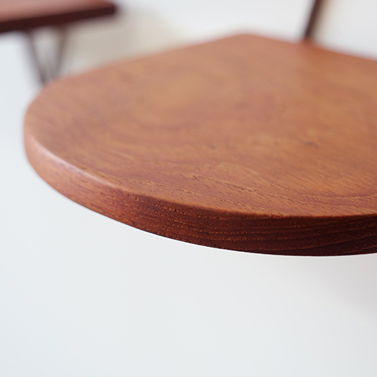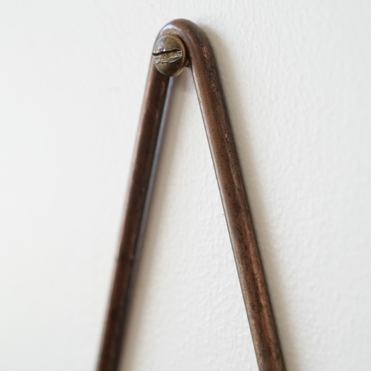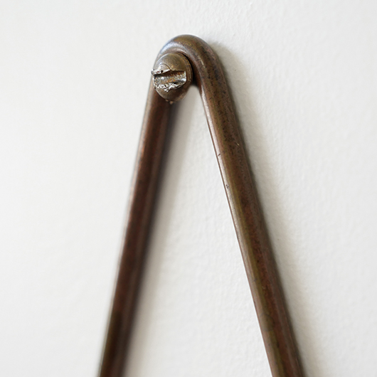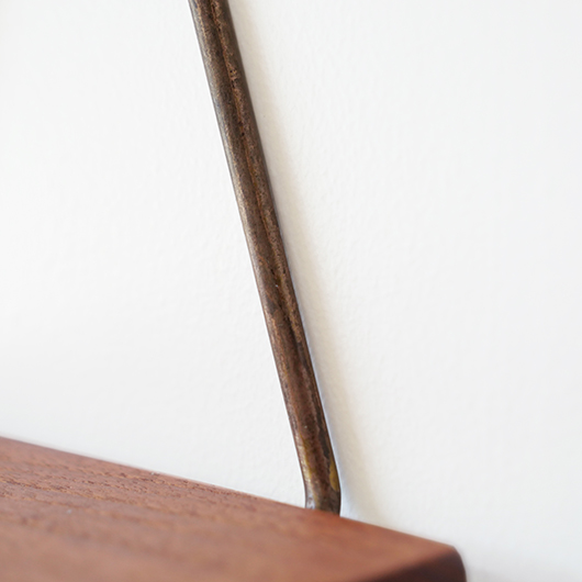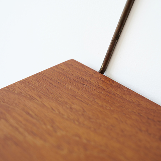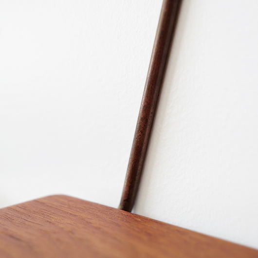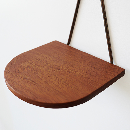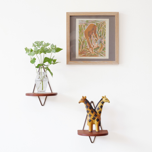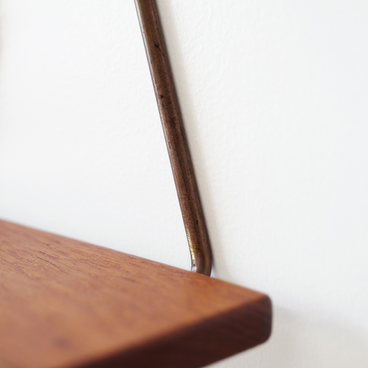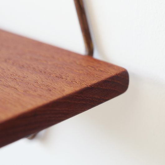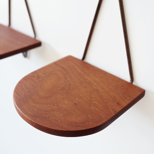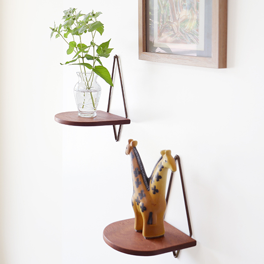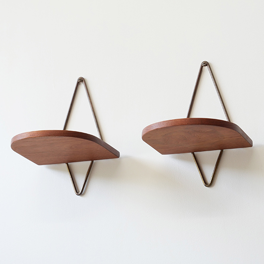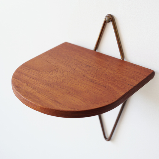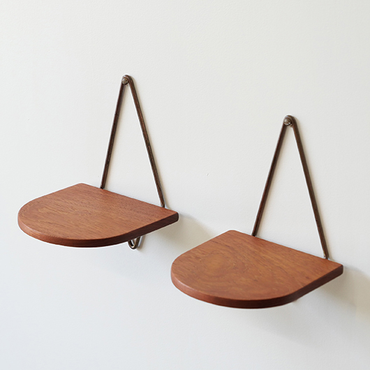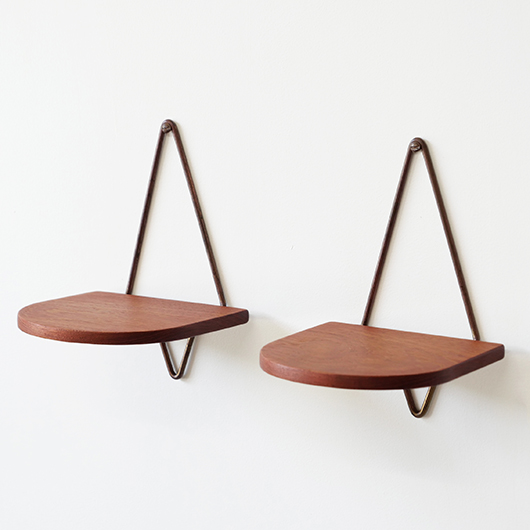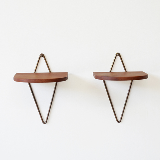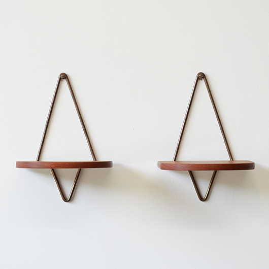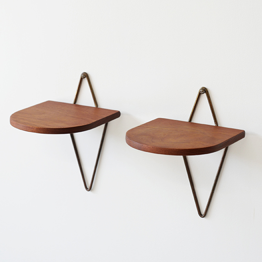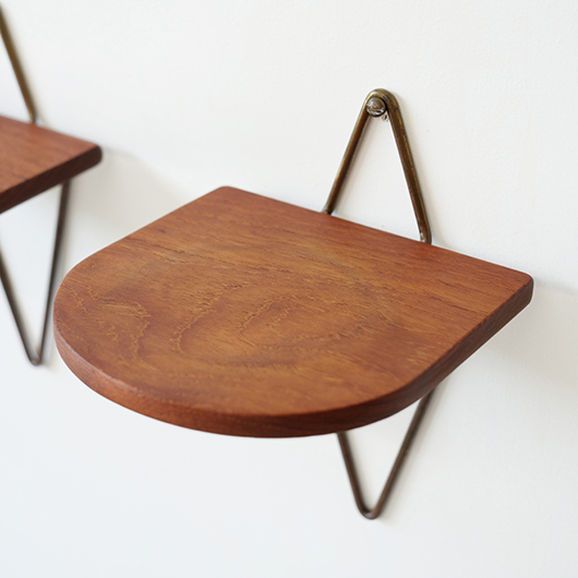 1960年代デンマーク製のヴィンテージスモールウォールシェルフのセット。 チーク無垢材によるかまぼこ形の小さな棚板に、サイズの異なる三角形のフレームが上下に付いています。フレームの真鍮は経年によって深みのある鈍い色合いへと変化し、チーク材ともよくマッチしています。 同じサイズのものが2点セットになっているため、横に並べたり段違いにしたりと場所に合わせて飾る創造力が膨らみます。お気に入りの小物やフラワーベースなどを棚板に乗せ、絵画やミラーを組み合わせたりと、ディスプレイの幅を広げてくれることと思います。 三角形のフレームはどちら上にしても使用できるリバーシブルな構造のため、お好みの方でお使いください。 丁寧な修復を行いまして、全体的に綺麗な状態です。2台のうち1台の棚板に、撮影時に裏面にした側にうっすらとした輪ジミが見られます。そのほか細部の状態などは、画像をご参照ください。g ※壁に直接取り付けるタイプとなりますので、下記の注記をご覧ください。