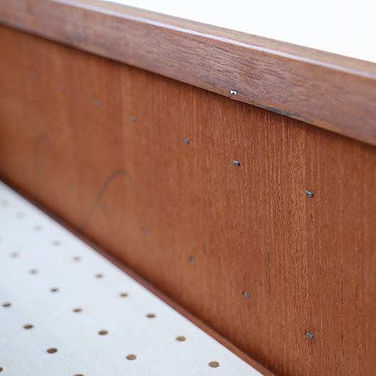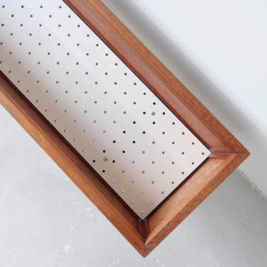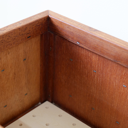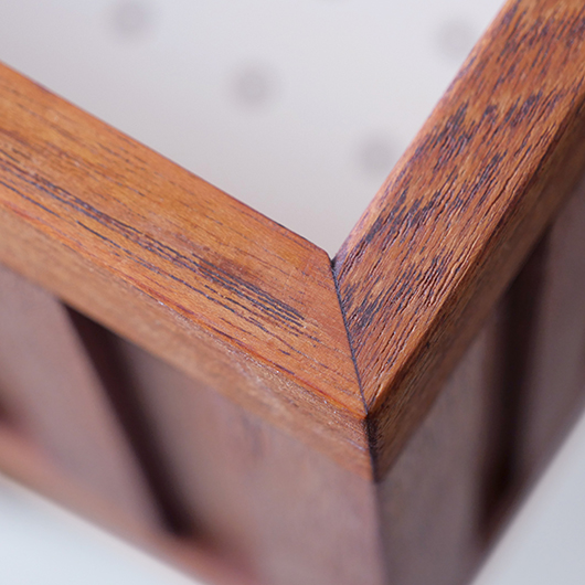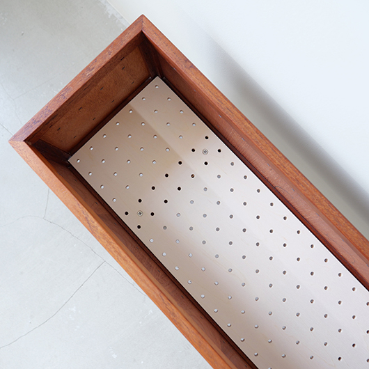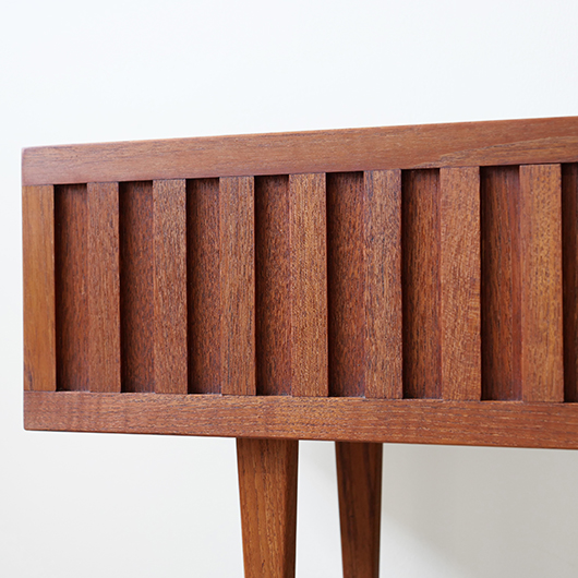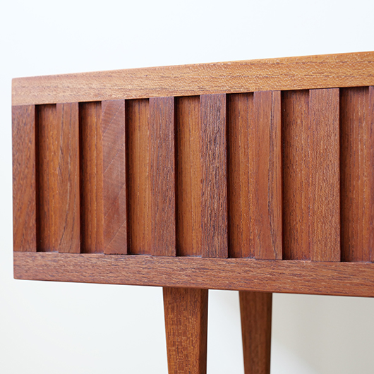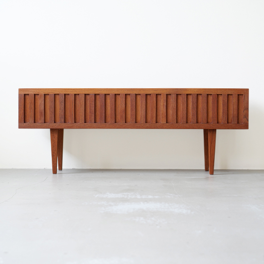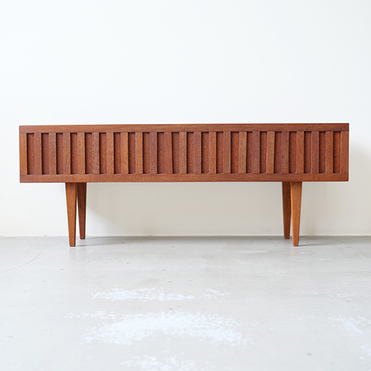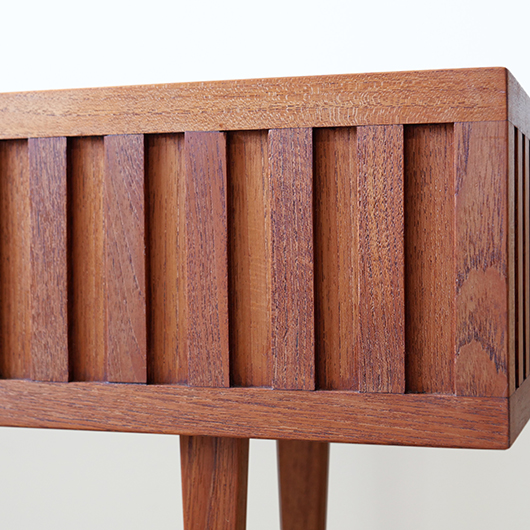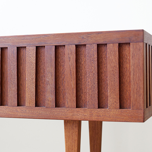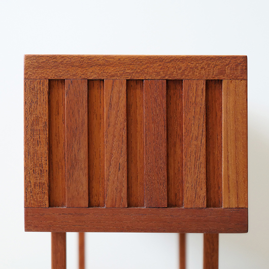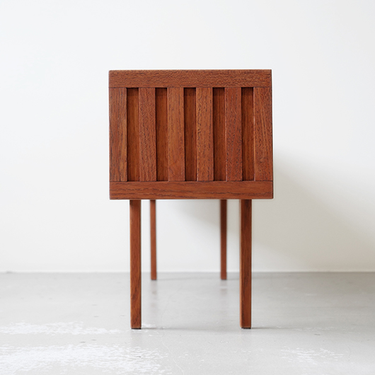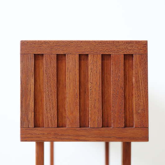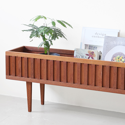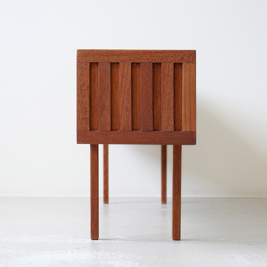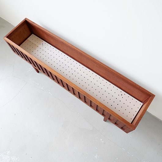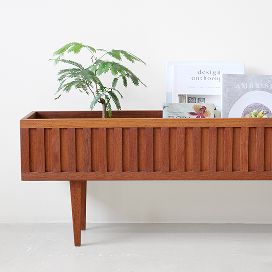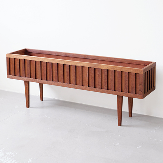 1960年代デンマーク製のヴィンテージプランター。 チーク材の本体外側から同素材の無垢材のスティックを全ての面に取り付け、格子状の装飾を施すという手の込んだ作りです。こうすることで陰影を生み出し深みが出るようです。 一番の特徴は幅90cmのワイドサイズであること。奥行きのない細長いフォルムは、脚部を短めにすることで重心を下げて安定感のあるデザインとしています。 窓際や玄関などに置いてお部屋の雰囲気づくりに一役買ってくれる、存在感のある一台です。また植物と合わせて書籍などを入れてマガジンラックのようにご使用いただいても、雰囲気のあるコーナーができそうです。また、飲食店などで緩やかに空間を仕切る使い方もおすすめです。 丁寧な修復を行い、全体的に綺麗な状態です。本体底板は新しく交換しております。そのほか細部の状態などは、画像をご参照ください。