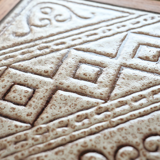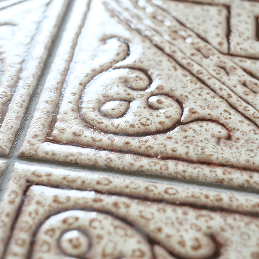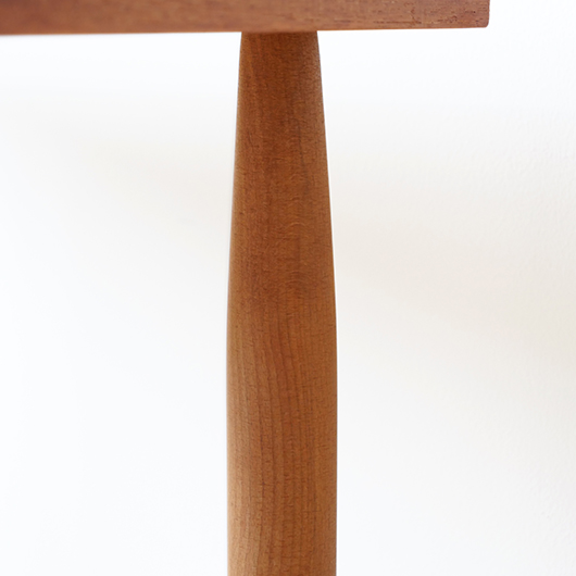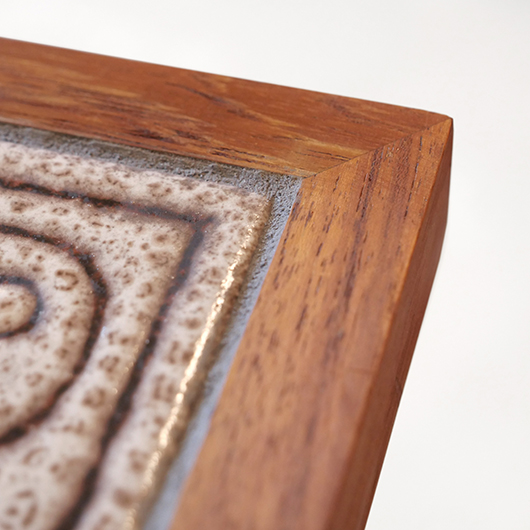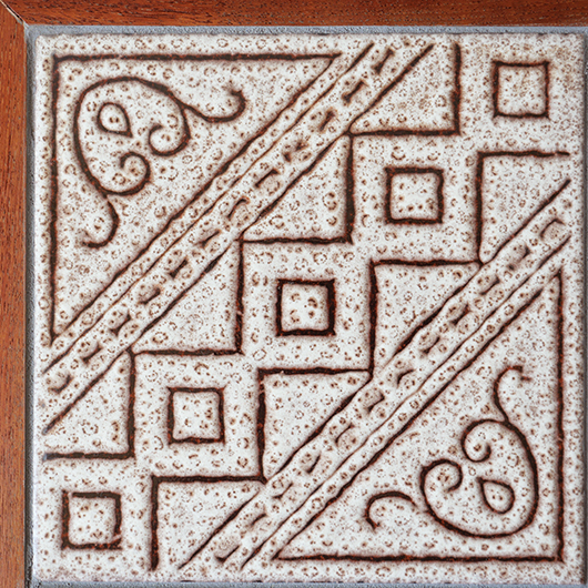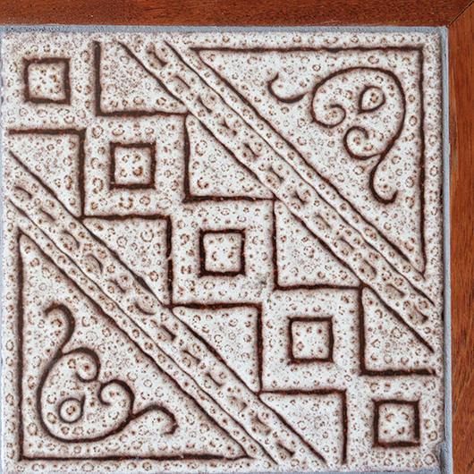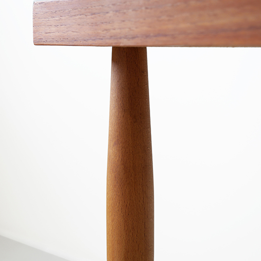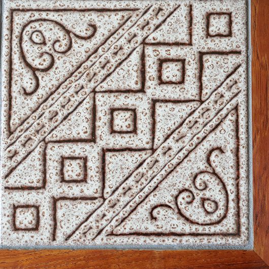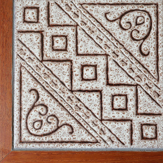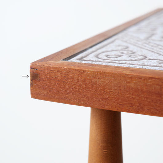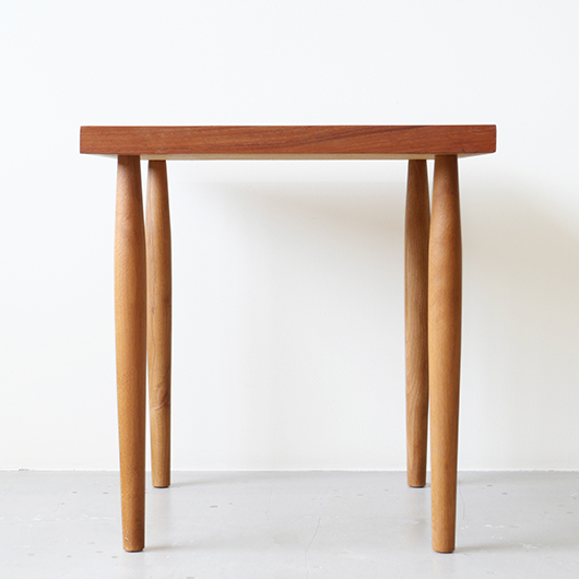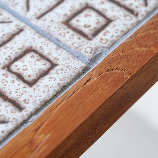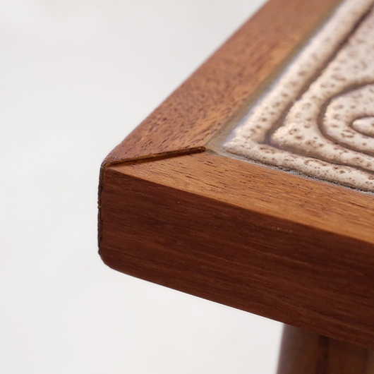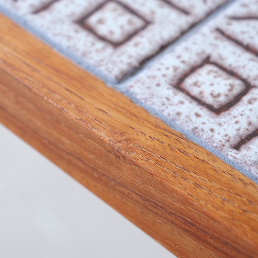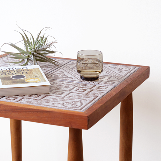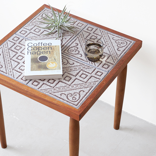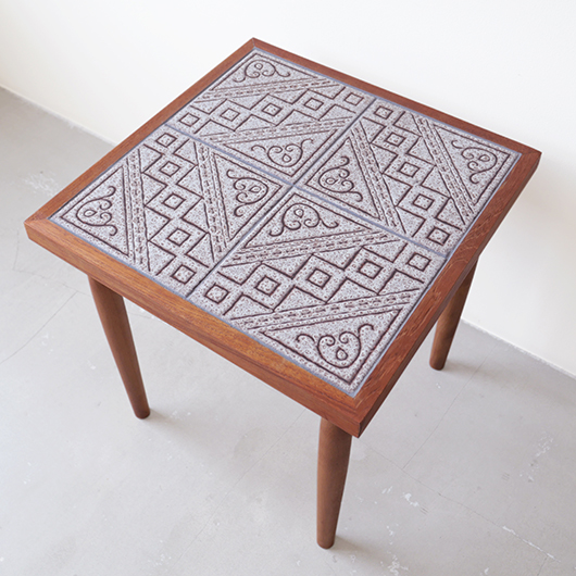 1960年代デンマーク製のヴィンテージタイルトップテーブル。 幾何学模様のタイルを、シンメトリーに4枚組み合わせた天板のモダンなデザインが印象的です。タイルはせっ器質の素地に釉薬をかけたもので、鈍い艶のある表面に触れると凹凸を感じるテクスチャーです。 天板エッジにはチーク材が用いられ、アーシーカラーのタイルにもマッチして北欧ヴィンテージらしいあたたかみを感じます。脚部は上下両方にテーパーをかけた丸脚で、スラリとした姿を優雅に見せてくれます。 置く場所を選ばない45cm角の小ぶりなサイズのため、ソファやラウンジチェアなどの横に置いてコーヒータイムのお供にいかがでしょうか。またリビングや玄関のコーナーに置いてテーブルランプと合わせても良さそうです。 状態はフレーム接合部の一か所に僅かな段差が見られますが、製品クオリティとしてご了承ください。全体として綺麗な状態です。そのほか細部の状態などは、画像をご参照ください。