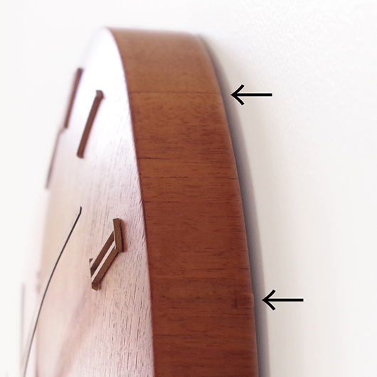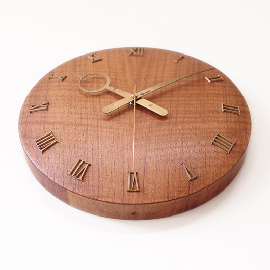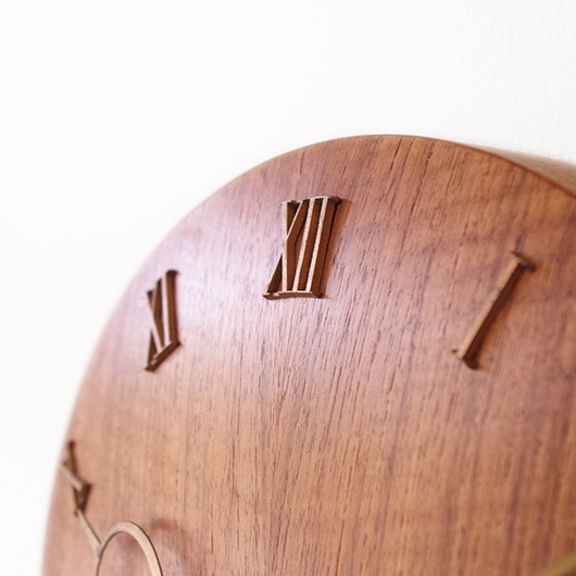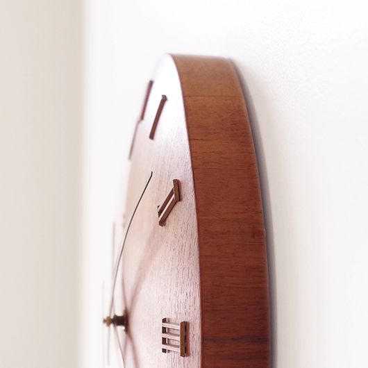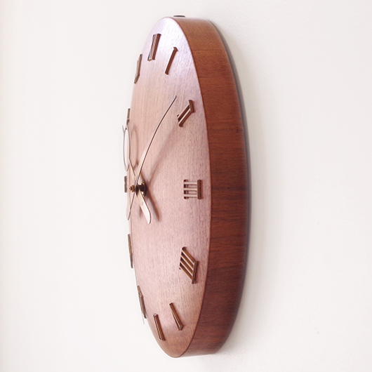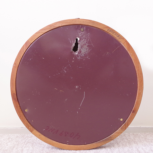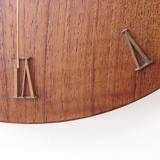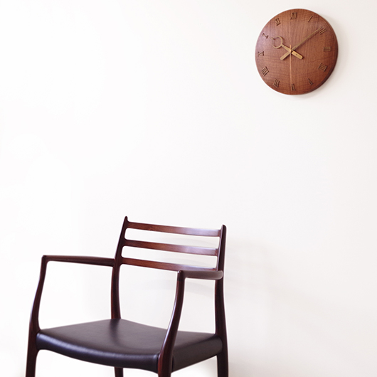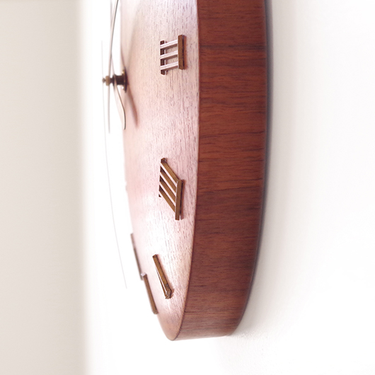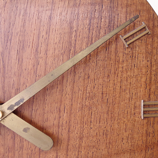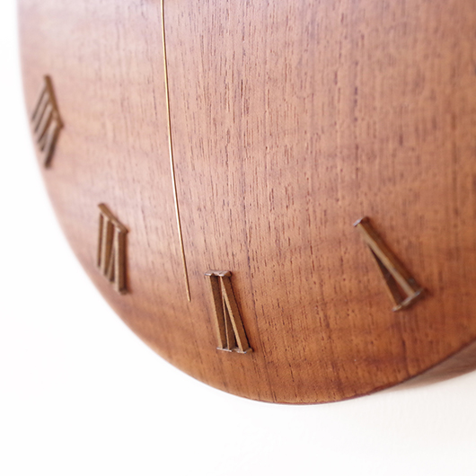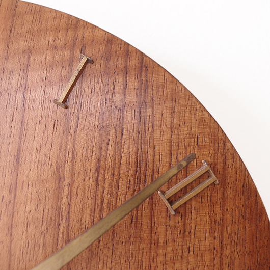 1940〜1950年代デンマーク製のヴィンテージ壁掛け時計。 チーク材が用いられた本体には縁に沿うように線の細いローマ数字のインデックスが付き、中心からデザイン性の高い特徴的な2本の針が伸びています。インデックスと針はともに真鍮製で、木部同様に美しく経年変化した鈍い艶をたたえています。 一番の特徴は凸レンズのように球面となっている本体で、時計の針なども本体の曲面に合わせすべてが曲線を描いたとても手間のかかるフォルムとなっています。本体の曲面に合わせて突板を左右対称のブックマッチに美しく貼り合わせる高度な技術に驚かされます。また上部側面に開いた穴はコードのあった電気時計だった名残で、ヴィンテージらしい物語りを感じるポイントです。修復時に単三電池1本を使用するクォーツ式ムーブメントに交換済みのため新品同様の使い心地です。 現地では新古典主義そしてデンマークモダニズムを代表する建築家Kaj Gottlobのデザインによるものとして取り引きされており、現地の信頼のおけるディーラーからも彼の作品として買い付けております。 そこにあるだけで存在感のある美しい一台で、壁面を印象的に彩ってくれることと思います。 ヴィンテージの味わいを損ねないように注意しながら、丁寧な修復を行いました。側面に僅かな経年感など見られますが、まず気にならない程度のものかと思います。全体として綺麗な状態です。そのほか細部の状態などは、画像をご参照ください。