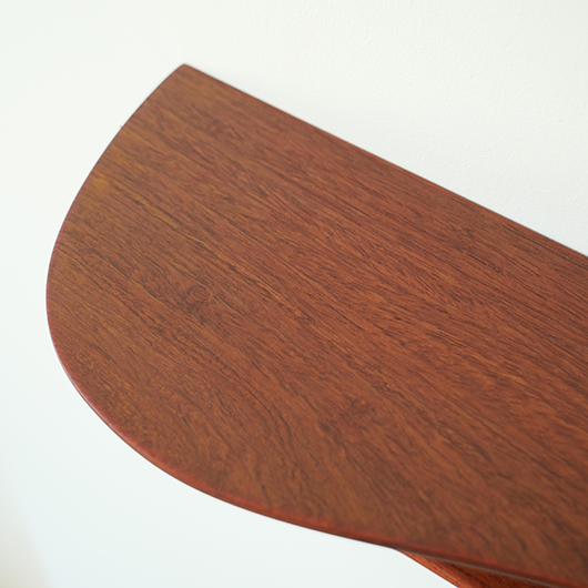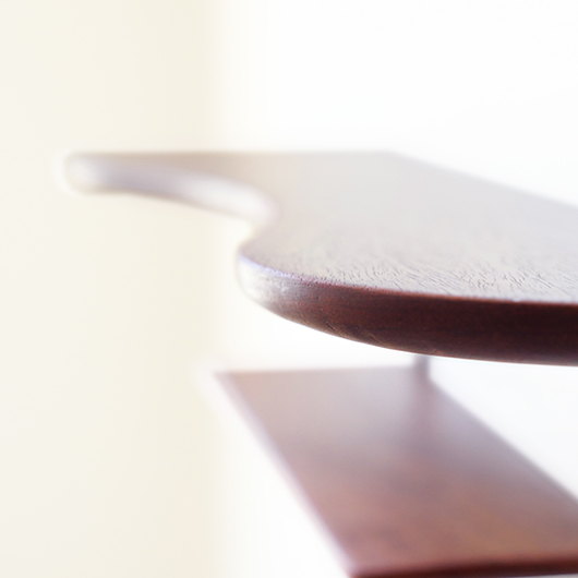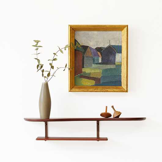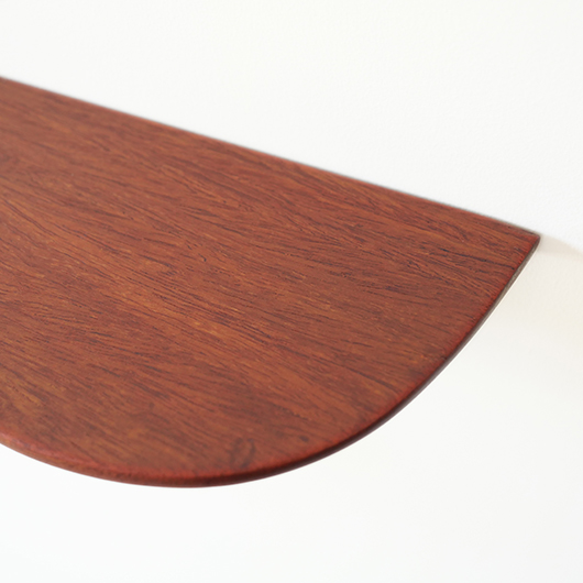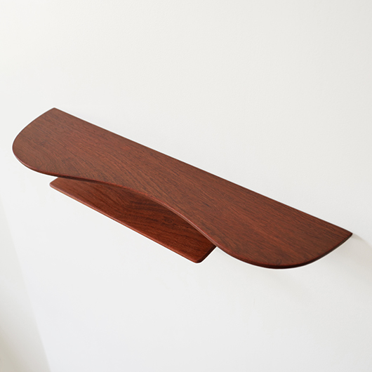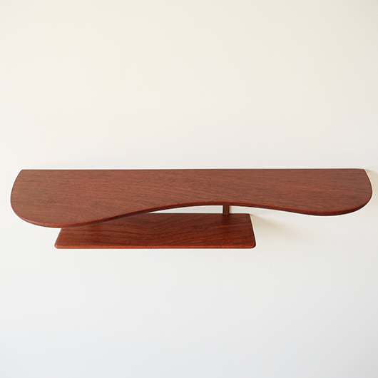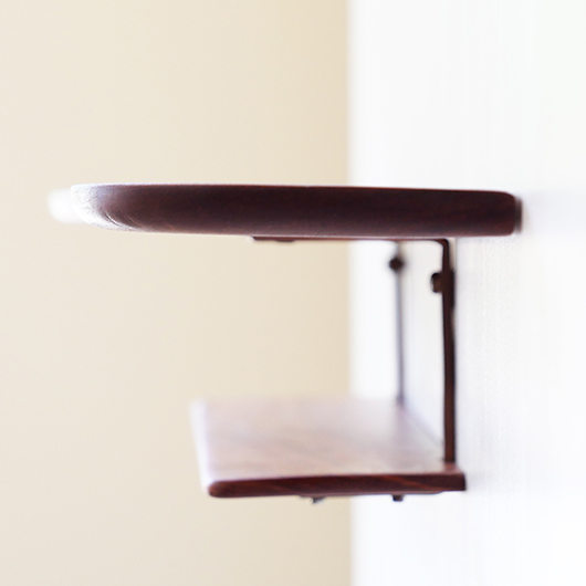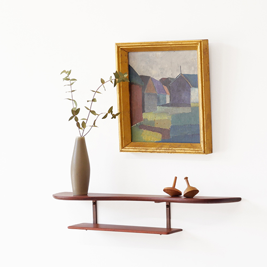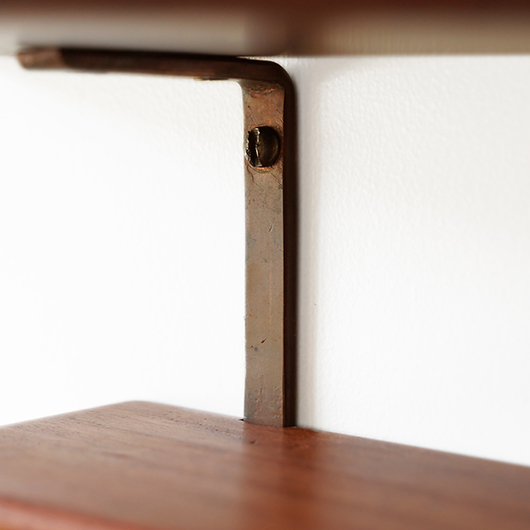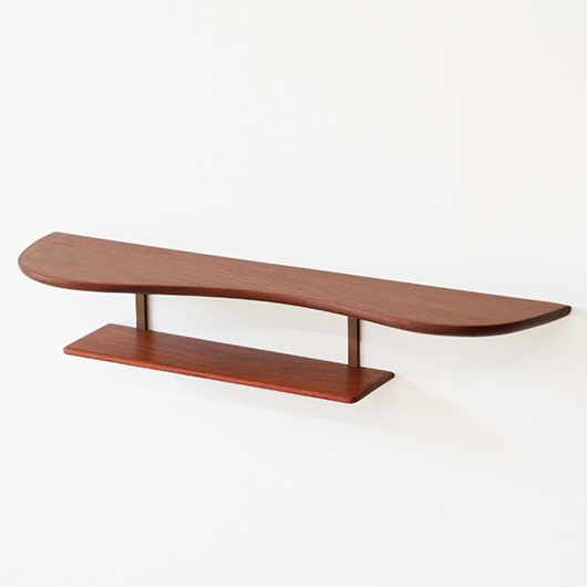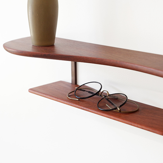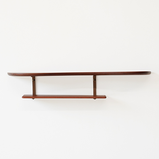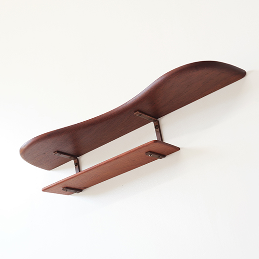 1950年代デンマーク製のヴィンテージウォールシェルフ。 波打つような曲線を描く天板はチーク無垢材によるもので、丸みを持たせたエッジとともにやわらかな雰囲気を出しています。その下側には同じくチーク無垢材による長方形の棚板が備えられ、難しいアシンメトリーのフォルムをバランスよくまとめています。それら2枚の板を繋げているのは真鍮製の金具で、経年によって深い色合いに変化したチーク材と馴染む鈍い艶を湛えています。 とても小ぶりなサイズのため、玄関や寝室に設置して、鍵やアクセサリーなどの小物の定位置としてはいかがでしょうか。一輪挿しや小さな絵画などを合わせると雰囲気も増すようです。 丁寧な修復を行いまして、綺麗な状態です。そのほか細部の状態などは画像をご参照ください。 ※壁に直接取り付けるタイプとなりますので、下記の注記をご覧ください。