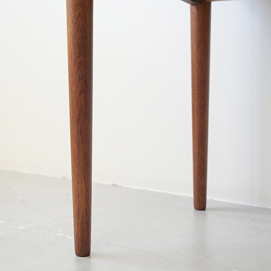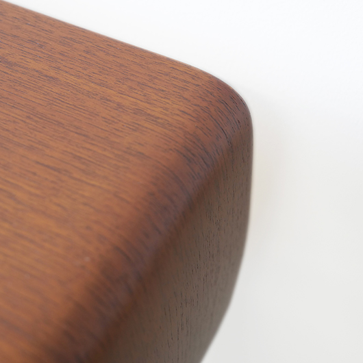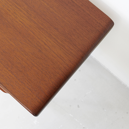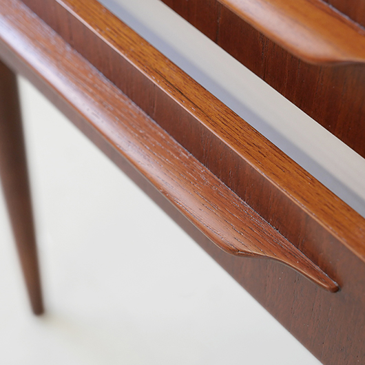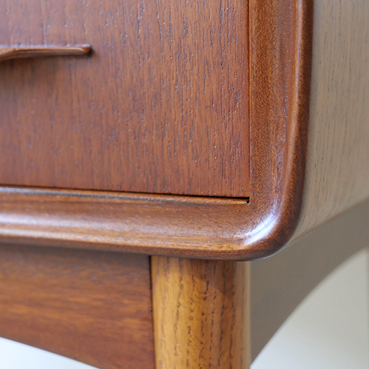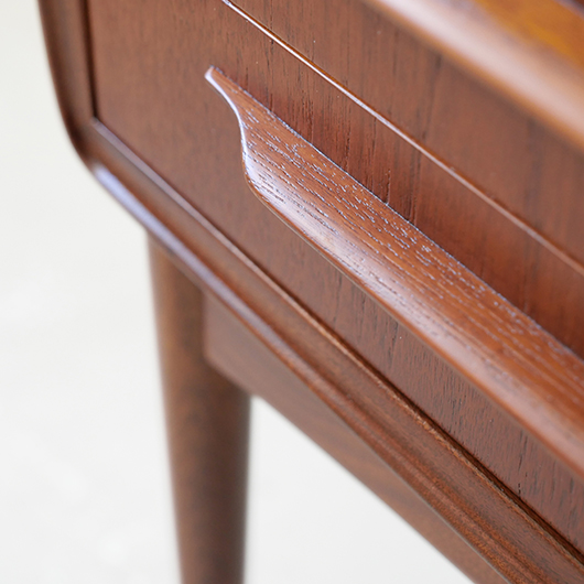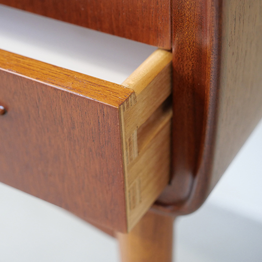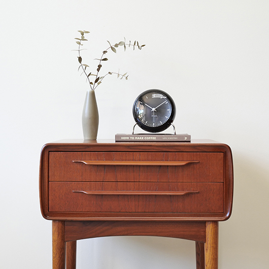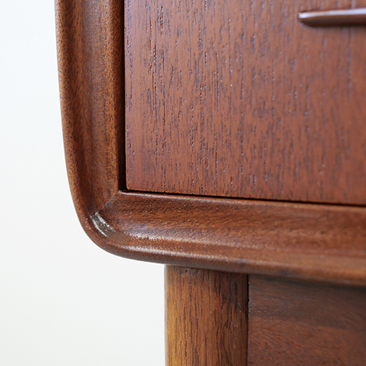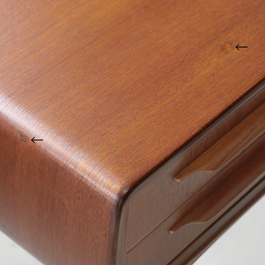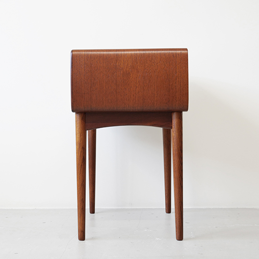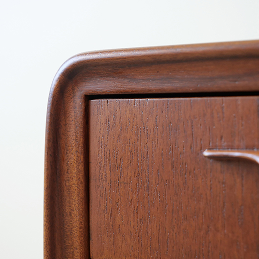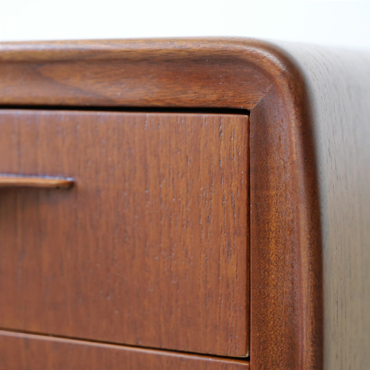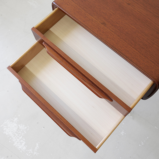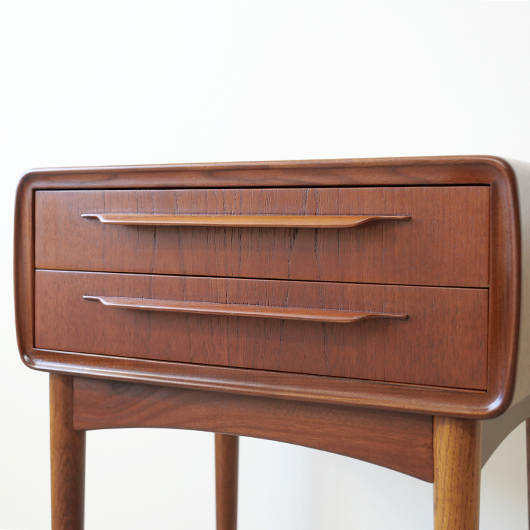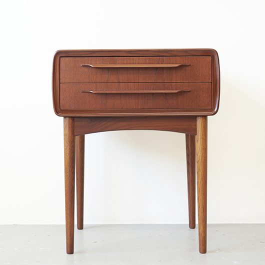 1960年代Johannes Andersenのデザインによる、デンマークC.F. Christensen Silkeborg製のヴィンテージ2段チェスト。 天板から両側面下までを曲げ加工により一枚で作り上げるという、プライウッドの特性を見事に活かした他に見られないデザインに目を奪われます。デザインの特徴でもあるアールを描く取っ手は指掛りも良く使い勝手も考えられています。 チェアやテーブルなど彼のデザインする他の家具をみても、やわらかな曲線を用いて一線を画すデザインを生み出していることが分かります。そして実用的なチェストも彼の手にかかれば、優美な曲線を持つスペシャルな一台へと昇華させてしまうのは流石の一言です。 寝室のベッドサイドに置いて目覚まし時計やテーブルランプを乗せたり、ソファ横で収納付きのサイドテーブルとしてなど、小ぶりながらに存在感のあるデザインを様々なシーンでお楽しみいただけるかと思います。 全体を丁寧にサンディング(研磨)を行った後に再塗装を行い、自然な艶の綺麗な状態に仕上がりました。引出しの底板は新しく交換しておりますので、清潔に気持ち良くお使いいただけます。天板に小さな補修箇所と僅かな凹みが見られます。雰囲気を損ねない程度のものですが、それらを考慮した価格設定となっております。全体としては非常に綺麗な状態です。そのほか細部の状態などは、画像をご参照ください。