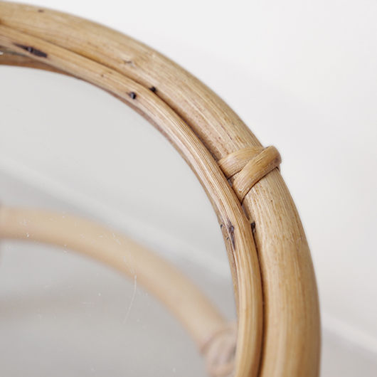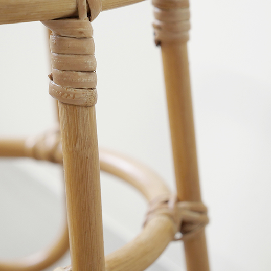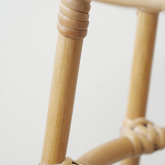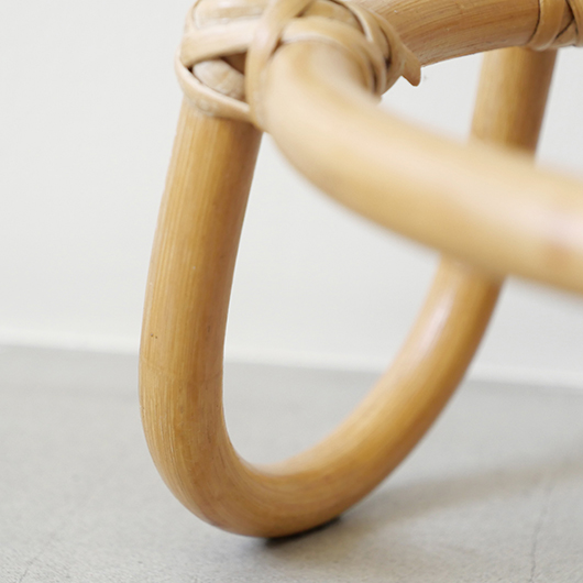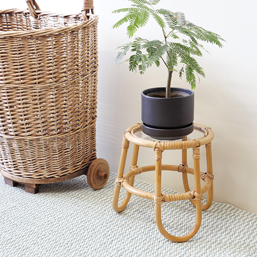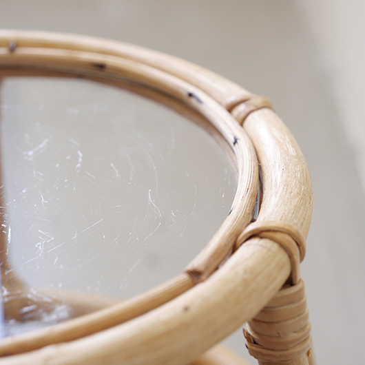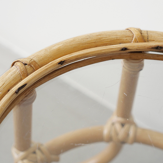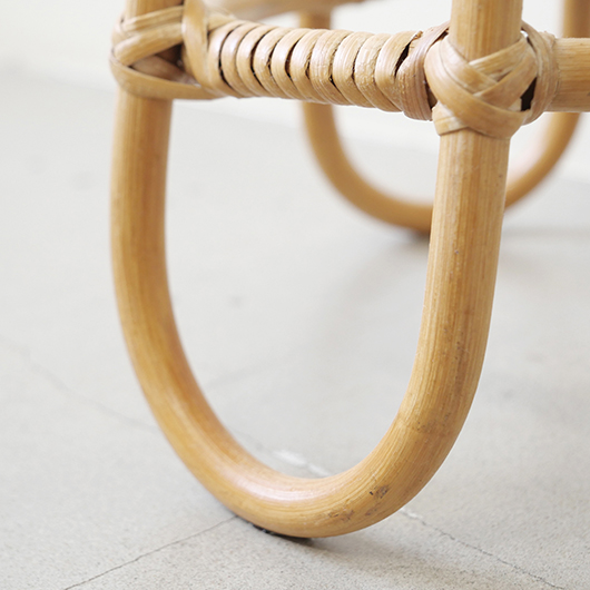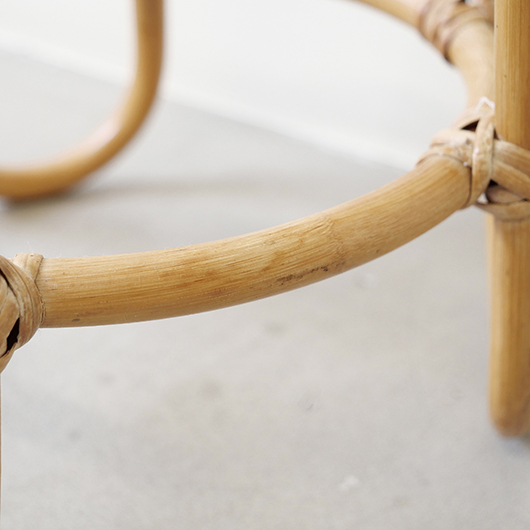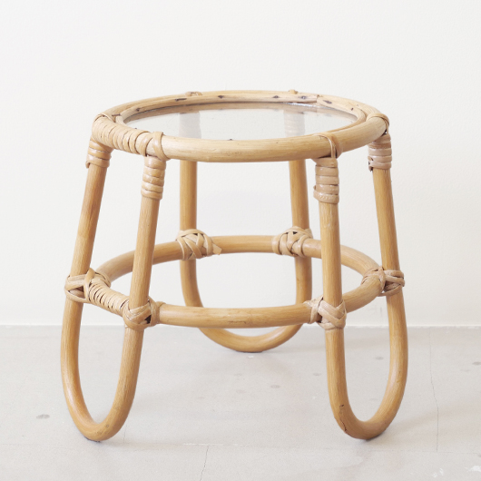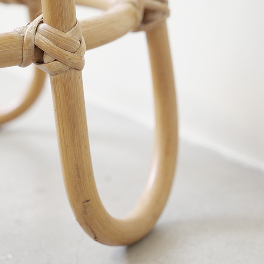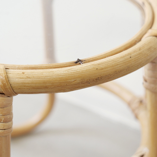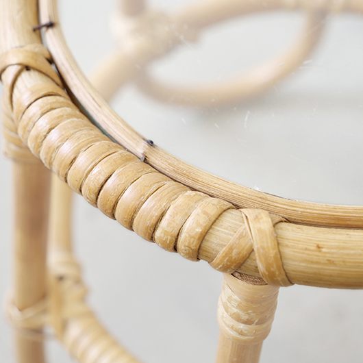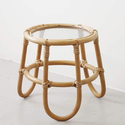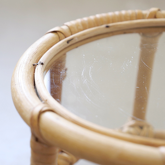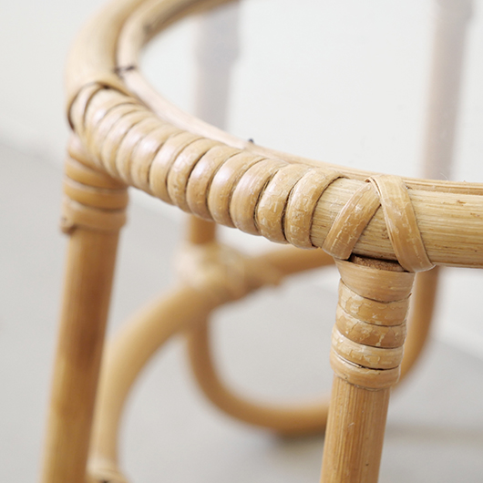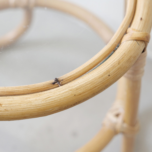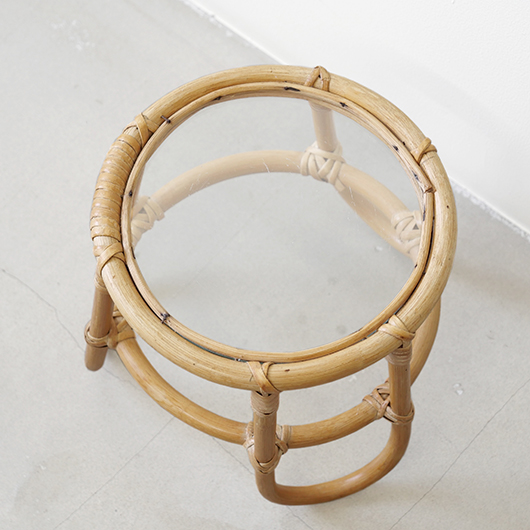 デンマークで買い付けました、ヴィンテージ フラワースタンド。 ラタン製の円形フレームにガラスをはめた天板と、その下からU字脚部が伸びた、やわらかな雰囲気の花台です。フレームにはラタンの皮付きの太めのものを、接合部分にも同じラタンのやわらかな皮籐が用いられ、200種類もあると言われるラタンをうまく組み合わせて作られています。丈夫でよくしなる特徴を生かした3本脚がデザインのポイントとなっております。 デンマークの一軒家には広いサンルームがよくあり、ラタン製のパーソナルソファやサイドテーブル、花台などが置かれているのを見かけます。その雰囲気を取り入れて、窓際やインナーテラスで小さな植木鉢を置いて飾ってはいかがでしょうか。もちろんソファに合わせてサイドテーブルとしても活躍してくれることと思います。 ”Loppis(蚤の市)”コーナーということで所々に気にならない程度の経年感が見られますが、それを含めてヴィンテージらしい味わいだと感じます。全体として良好な状態を保っています。そのほか細部の状態などは、画像をご参照ください。