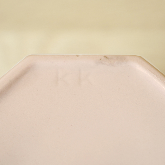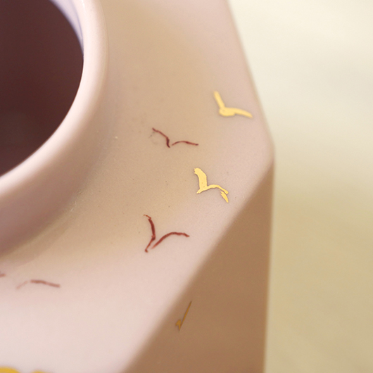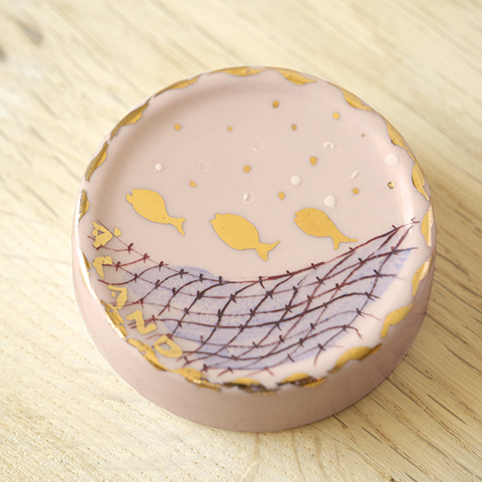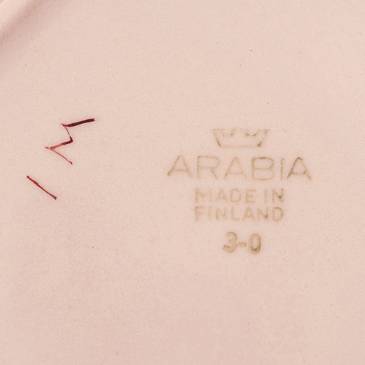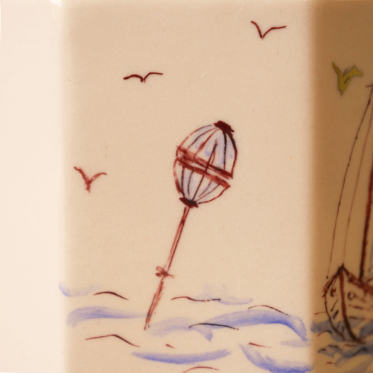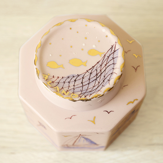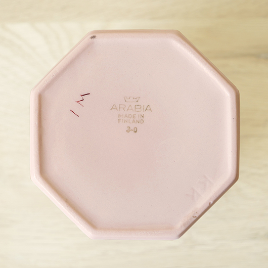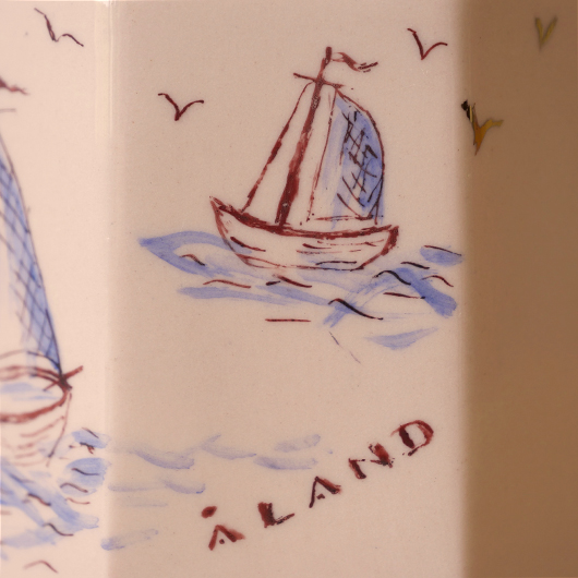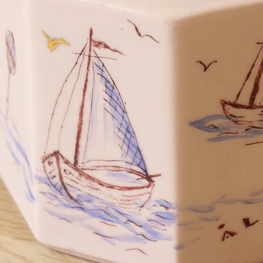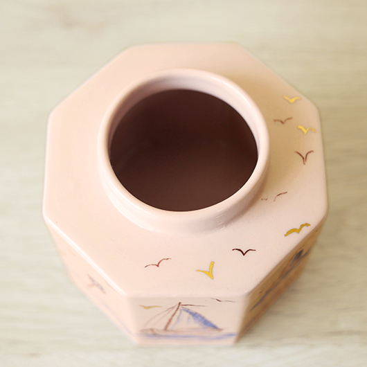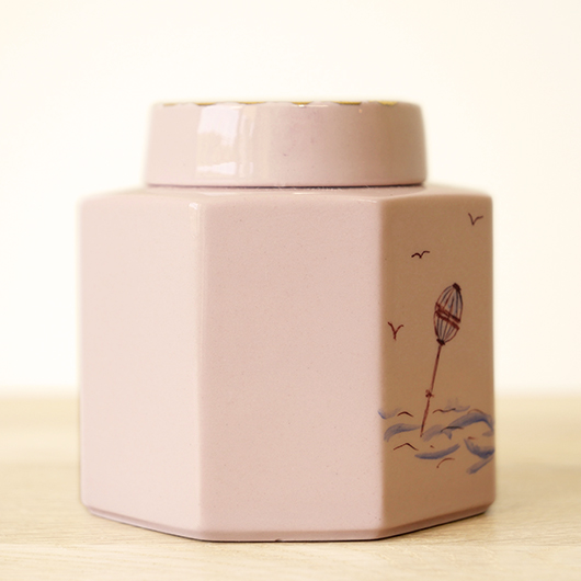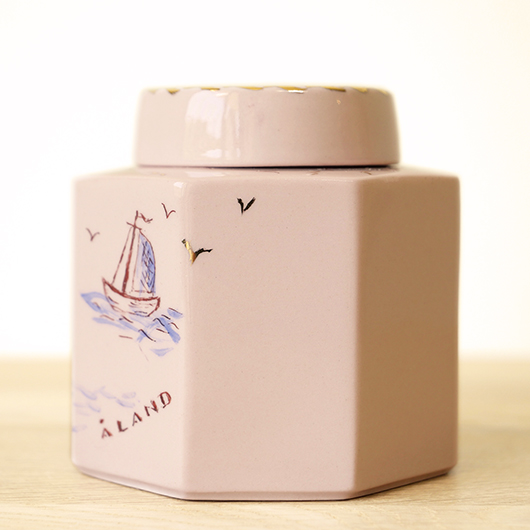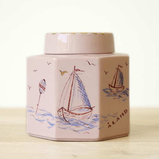 1949年〜1964年に製造されたフィンランドARABIA製のヴィンテージ キャニスター"Åland"。 八角柱のボディと上部には円形の蓋がついた愛らしいフォルムです。帆に風を受けて進む木造ボートと、周囲には群れをなして舞うカモメがどこか楽しげに描かれています。蓋には漁で使う編みから逃れるように3匹の魚が跳ねています。絵付けは焦茶色の線で描いたものにコバルトブルーで色付けされています。本体の色味はアラビアの器に時折見られるやわらかな桃色で、部分的に金色のアクセントが付いているため素朴なテーマの中に華やかさを添えています。 ”Åland(オーランド諸島)”はバルト海に浮かぶフィンランド自治領で、6,700もの島々へはボートやカヤックで渡ることもできるそう。こちらもそんな日々の暮らしで見るボートの風景なのでしょう。 デザイナーを調べ切ることができませんでしたが、現地でも初めて見たもののため、市販されていたものではなく自治体や会社などのノベルティとして少量製造されたものなのかもしれません。 サニタリールームでコットンや綿棒を収納したりキッチンでグロッサリーなどを入れたりと、日常よく使うものを見せながら収納してはいかがでしょうか。置いておくだけで目を楽しませてくれる一台です。 目立ったキズなどなく綺麗な状態です。そのほか細部の状態などは、画像をご参照ください。