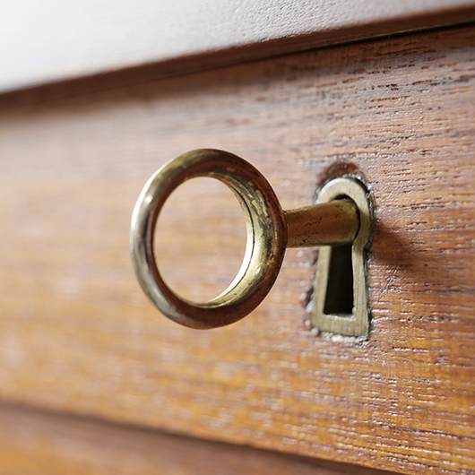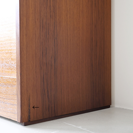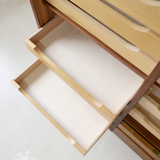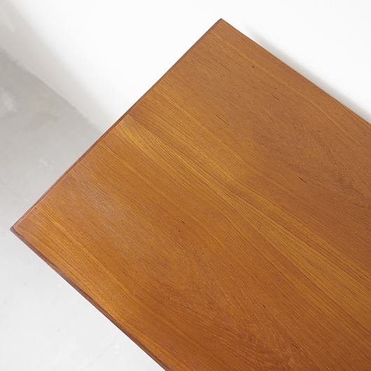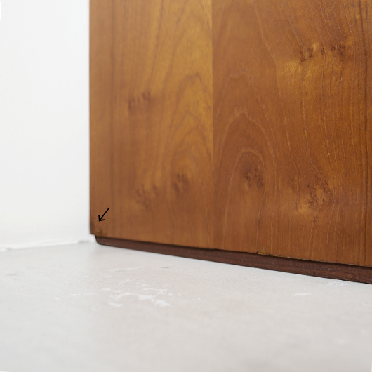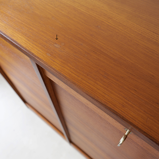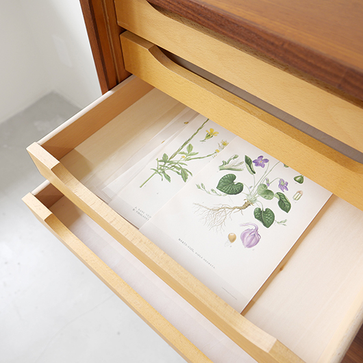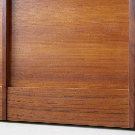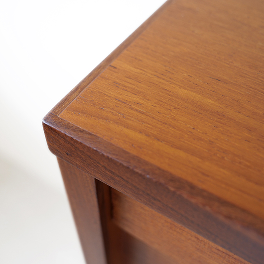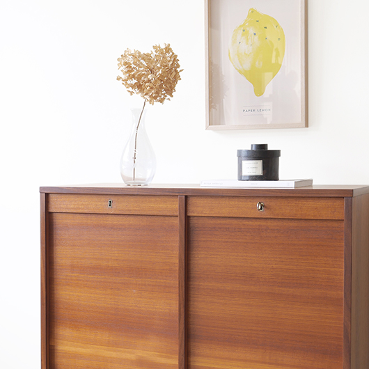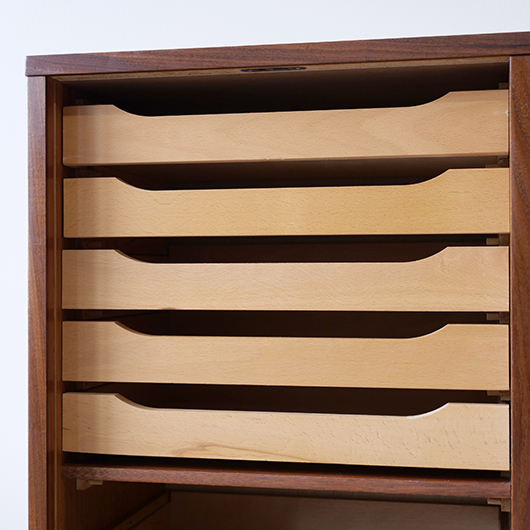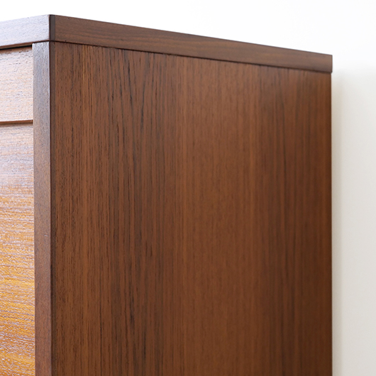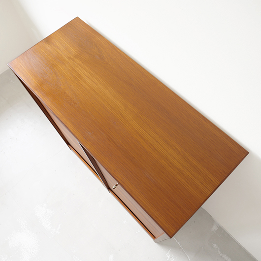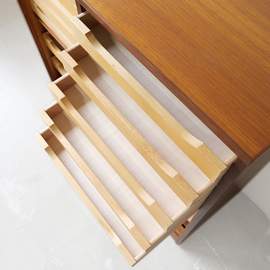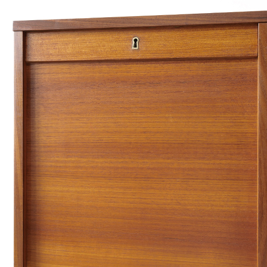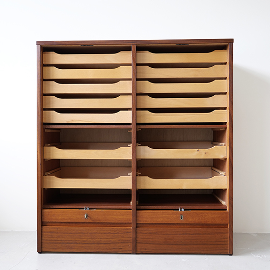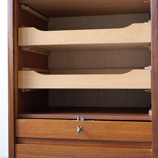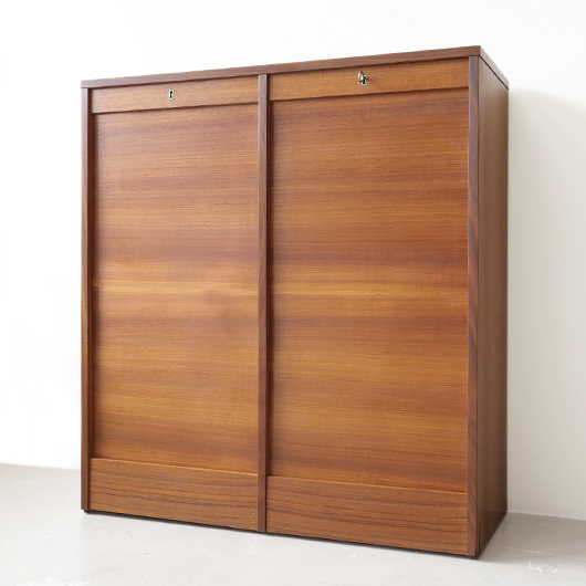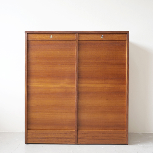 1960年代デンマーク製のヴィンテージロールフロントキャビネット。 蛇腹扉が2つ横並びになったようなスペシャルなサイズ感で、シングルタイプの倍以上の容量があります。正面のチーク材の美しい木目をよく見ると細かなスリットが入っており、鍵を回すと下側にサッと巻き込まれていく縦型の蛇腹式扉となっています。近くで見ても分からないほどの細かなスリットは楽しい驚きを与えてくれるとともに、丁寧で高度な技術であることが伺えます。そして、もうひとつユニークなのが扉の施錠で、アナログな作りながら下から上に押し上げるだけで自動でロックが掛かる便利な構造です。 扉を閉じた状態では花瓶などを置く花台など、高さのある天板上にお気に入りの小物をディスプレイしてお楽しみいただけます。細かく仕切られた内部ケースには書類はもちろんのこと、切り抜きや布などのコレクションなどを分かりやすく種分けしたりと、実用的な一台として活躍してくれそうです。(引き出し内はA4サイズを横向きで入れることができます) 丁寧な修復を施しました。本体背板や収納ケースの底板はすべて新しい板に交換しておりますので、清潔にお使いいただけます。側面下側などに経年感が残るため、それらを考慮した値段となっております。全体としては綺麗な状態です。そのほか細部の状態などは、画像をご参照ください。