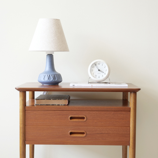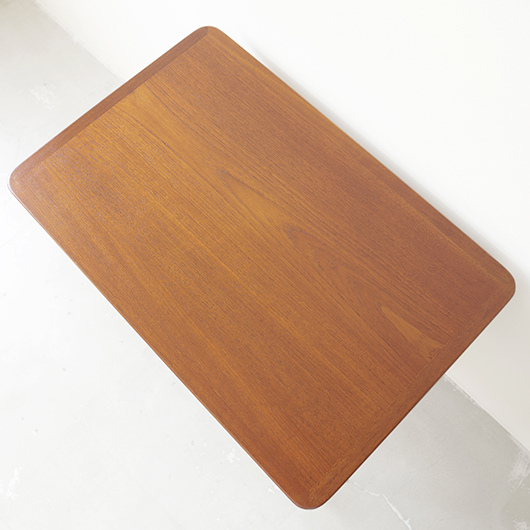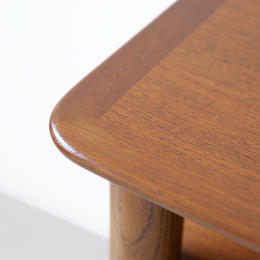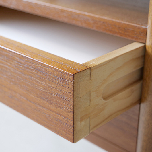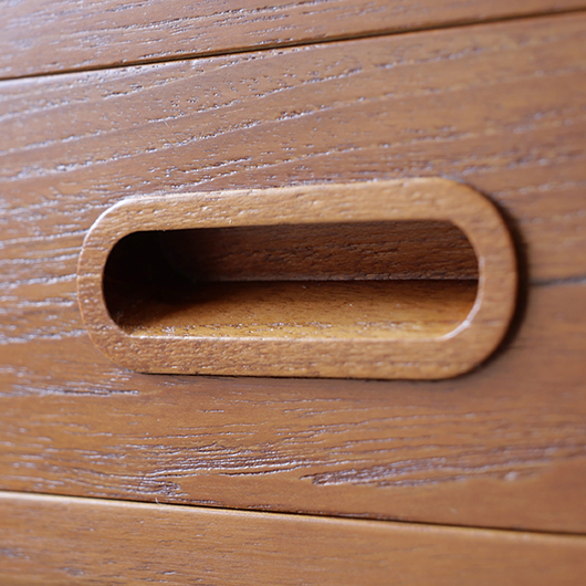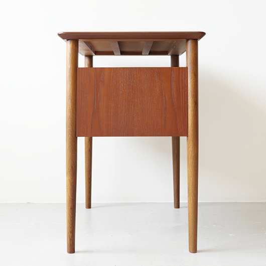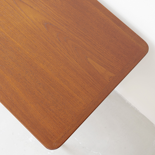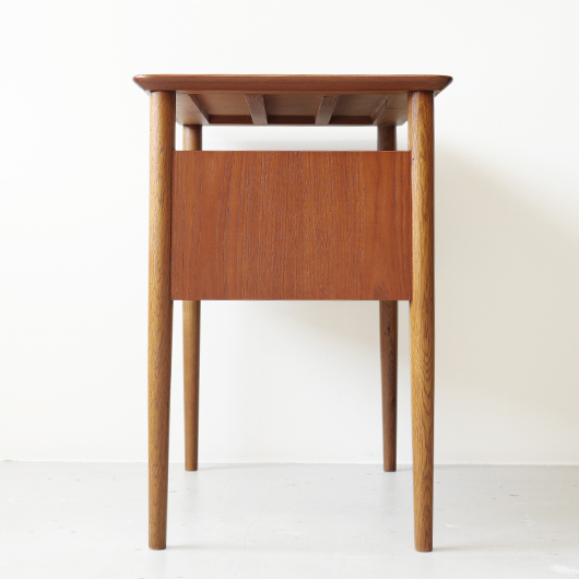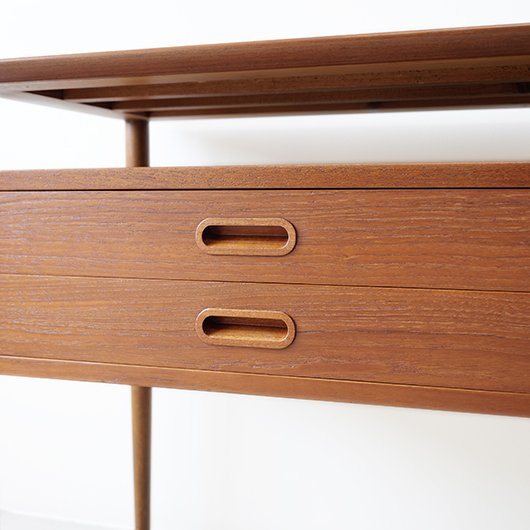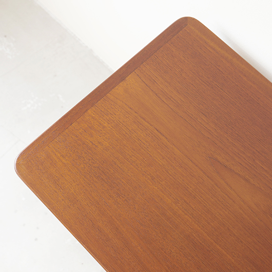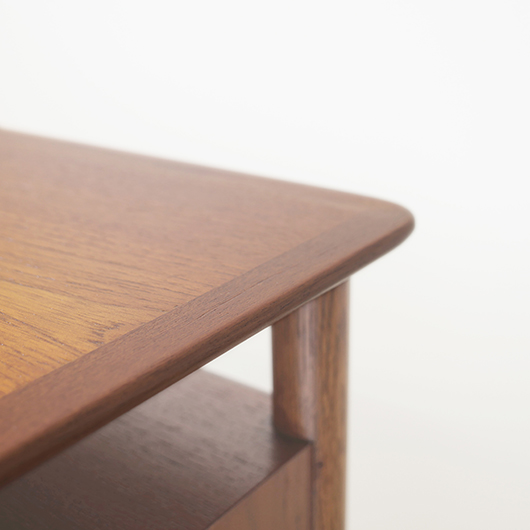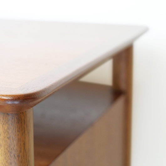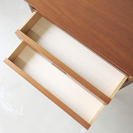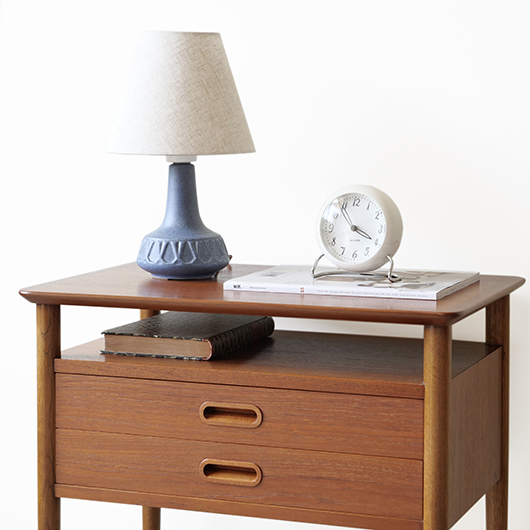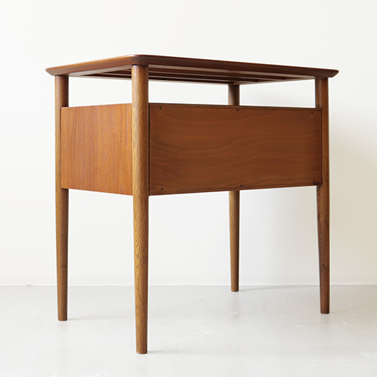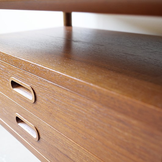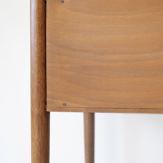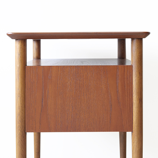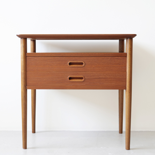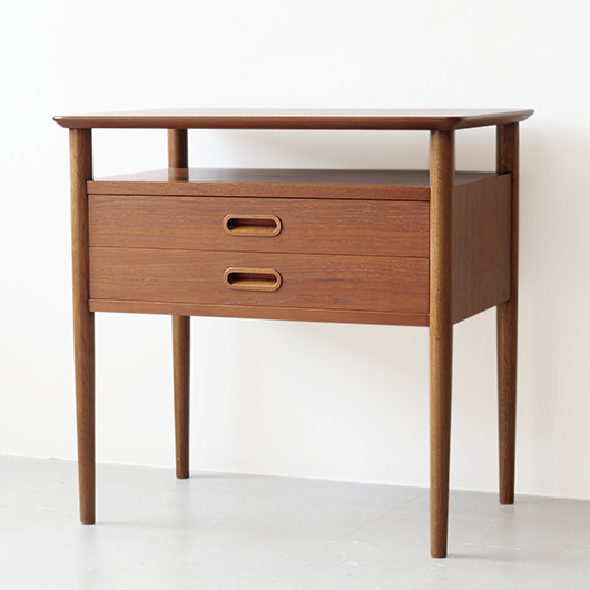 1960年代Kaj Winding のデザインによるヴィンテージベッドサイド チェスト。穏やかな木目の天板はエッジにテーパーがかけられ、スラリとした脚部へと繋がっています。その下には2段の引出しが付き、Kaj Windingのデザインによく見られる楕円形の内部を鋭角にくり抜いた特徴的な取っ手が見られます。 天板とチェスト部分の間にスペースがあることにより、抜け感のある軽やかな印象を受ける作りです。そして脚部と一体となるように箱部分の四隅を丸くくり抜き脚部をはめ込むという、非常に手の込んだ構造です。 ナイトテーブルとも呼ばれるこちらは、ベッドの横に置いて使うように設計されました。テーブルランプや目覚まし時計を乗せ、間のスペースには読みかけの雑誌などを収納したりと使い勝手の良さが伺え、玄関先などさまざまな場所で活躍してくれそうです。 丁寧な修復を施しまして、非常に綺麗な状態です。引出し底板は新しいものに交換しましたので、清潔にお使いいただけます。僅かな小キズはございますが、気にならない程度かと思います。そのほか細部の状態などは、画像をご参照ください。