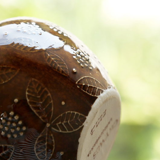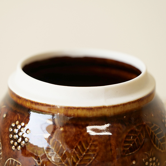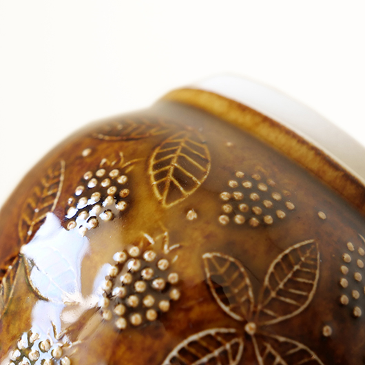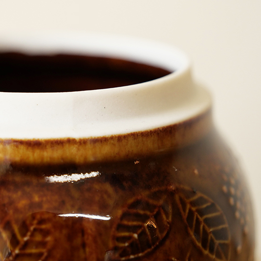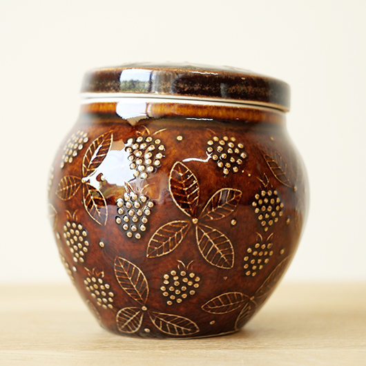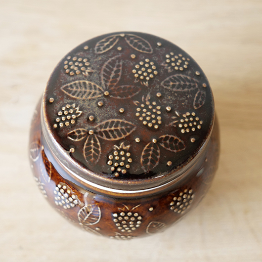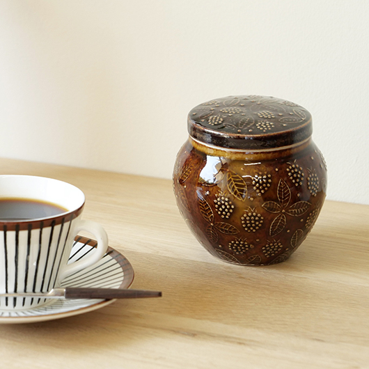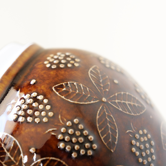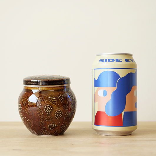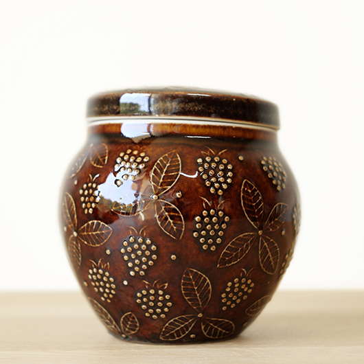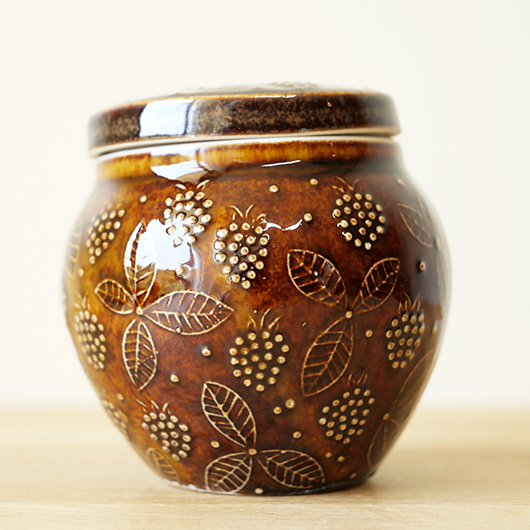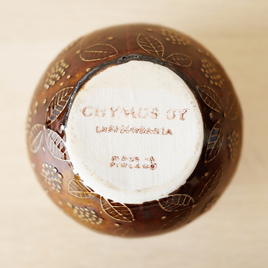 1906年創業のフィンランドの老舗菓子メーカーCHYMOS OyがARABIA社に別注した1960年代Ulla Procopeデザインのヴィンテージ キャンディポット。 上方がぷっくりと膨れた愛らしいフォルムに、蓋がついています。外側にはたわわに実ったブラックベリーと特徴的な葉っぱが描かれており、飴色の深い色味の釉薬により凹凸となった絵柄が浮かび上がっています。内部には同じく釉薬が掛かり、素焼きのものが多い中でより使い勝手が良いものです。 CHYMOS Oyは赤白ストライプの包装紙で包まれたミントチョコキャンディーの"Marianne"を筆頭に、ジャムやチョコレート、ジュースにリキュールなどを幅広く手がけていました。1993年にFazer社に菓子部門が売却された後も”Mariannne"は現在も残るベストセラーとなっています。このポットはキャンディーなどを入れるための販促品として作られたもののようです。 バックスタンプには社名の”CHYMOS Oy”と工場のあった街の名”LAPPEENRANTA”と記されています。 小ぶりなサイズ感でチェストなどに置いておくだけで絵になります。キッチンで個包装になったグロッサリーをしまったり、食品にとらわれずに文具など小さなもの入れても良さそうです。 ワレ・カケなどなくとても綺麗な状態です。蓋にわずかな歪みが見られますが、製品クオリティとしてご了承ください。そのほか細部の状態などは、画像をご参照ください。