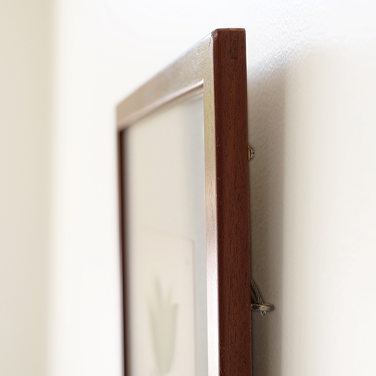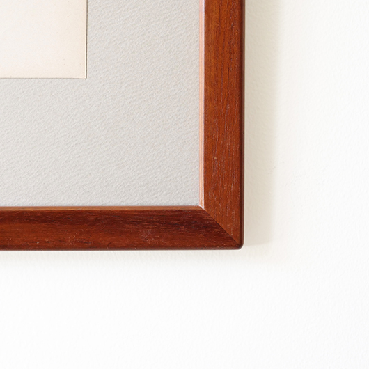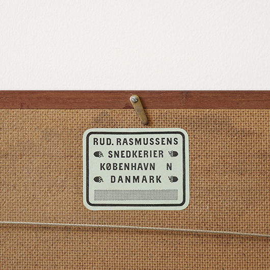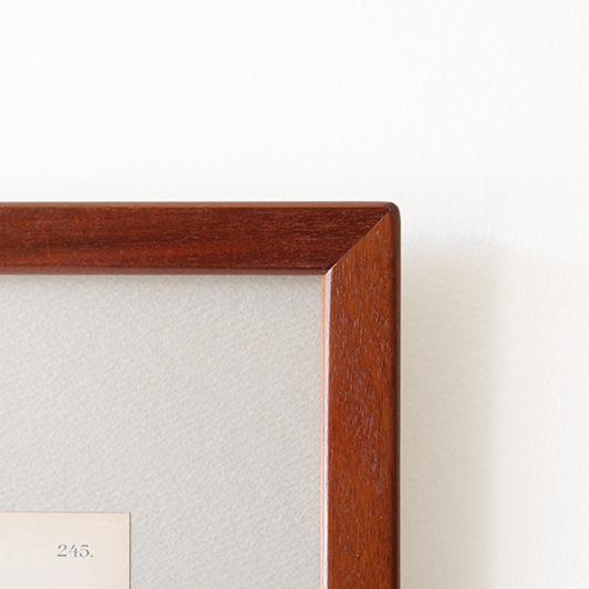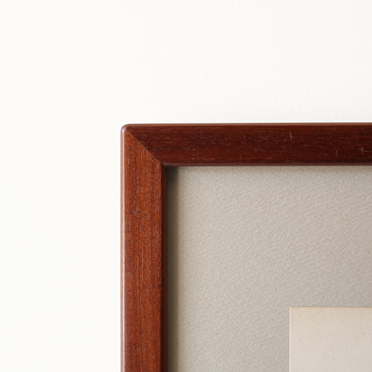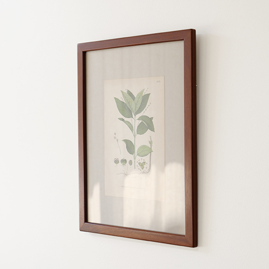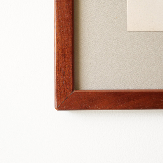 1869年創業のデンマーク最古のキャビネットメーカーRud. Rasmussen製のヴィンテージ ピクチャーフレーム。 フレームの切り口はすべて角を落として当たりをやわらかにし、エッジは木口を45度にカットして組み合わせる留め継ぎによるもので、とても丁寧に作られています。裏面はトンボと呼ばれる金具で裏パネルを押さえているため、中の作品も容易に入れ替えることができます。そのトンボには真鍮が用いられており普段見えない箇所にまでこだわりを感じます。 素材はマホガニー材の中でも幻の材と呼ばれる希少なCuban Mahoganyが用いられており、緻密な木目と美しい色合いで素材の持つ存在感が見事です。 こちらはRud. Rasmussenの4代目Jørgen Rud. Rasmussenの共同経営者であるHelge Kurt Hansenが自邸で使用するため特注で作らせたもので、そうでなくとも技術の高い自社の職人がより丹精込めて制作したことが想像できます。そして長きに渡りHelge Kurt Hansen邸に飾られていたワンオーナー品のため、状態の良さはもちろんのこと非常に希少性の高い1枚となります。 額の中には気軽に飾ることができるようアンティーク(1920年代)のリトグラフを挟みました。スウェーデンの画家Carl Lindmanによるボタニカル画”Bilder ur Nordens Flora”で、繊細なタッチと淡い色合いが印象的です。ご希望によりオリジナルで入っていたリトグラフ(画像16枚目ご参照)もお付けします。 メンテナンスを施し全体的に綺麗な状態です。フレームには僅かな小キズなど見られますが気にならない程度と思います。そのほか細部の状態などは画像をご参照ください。