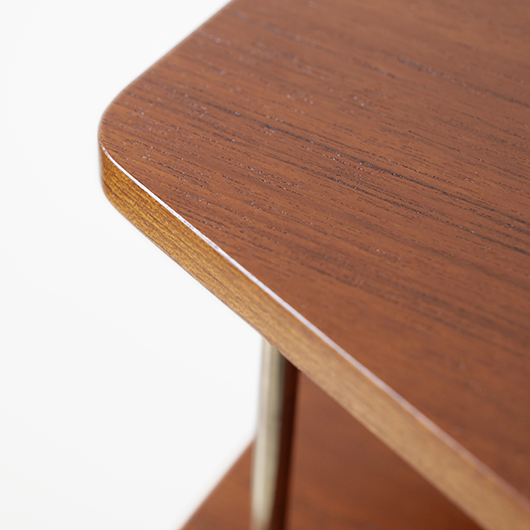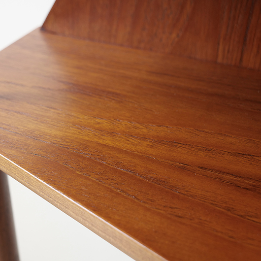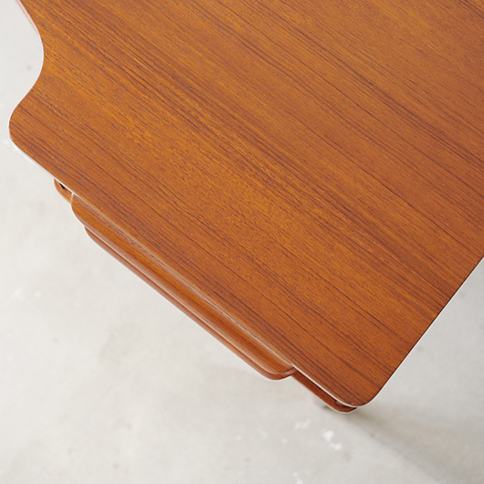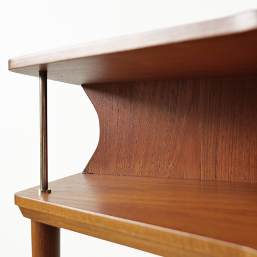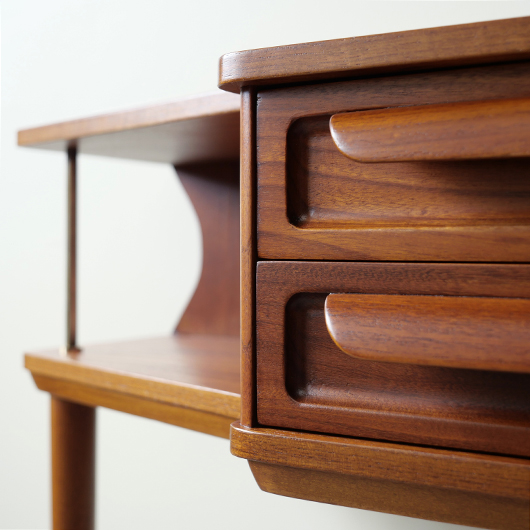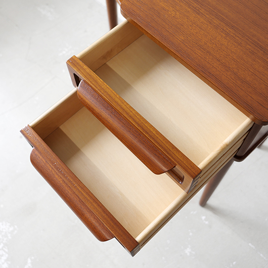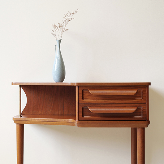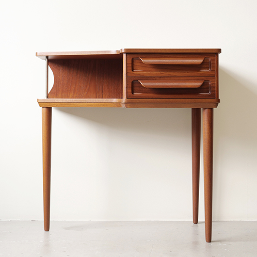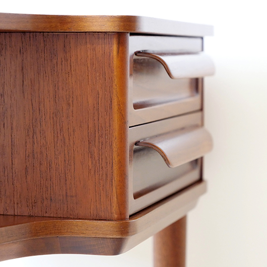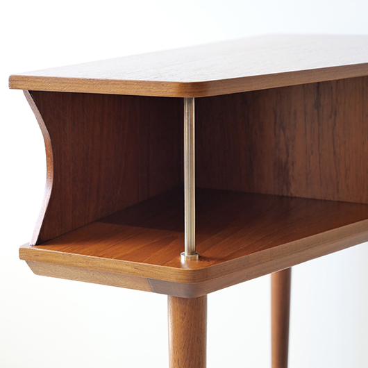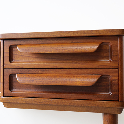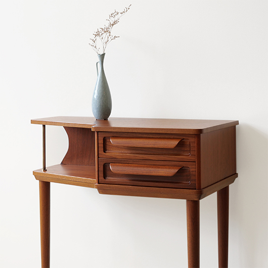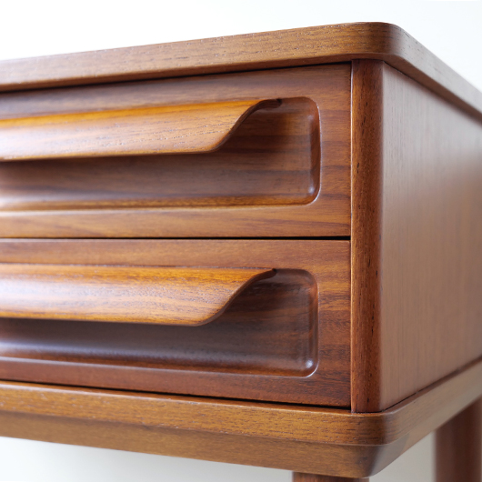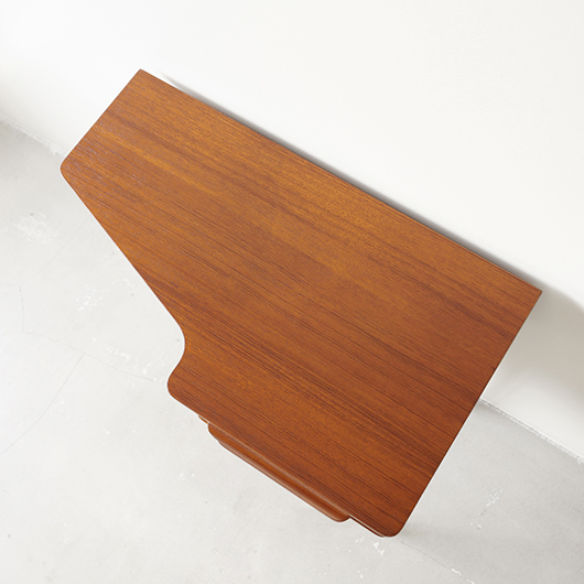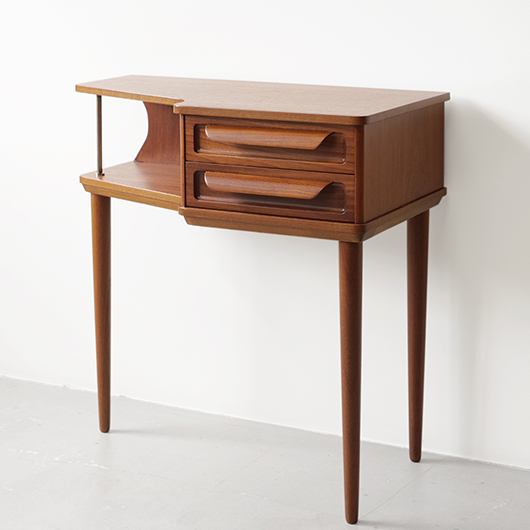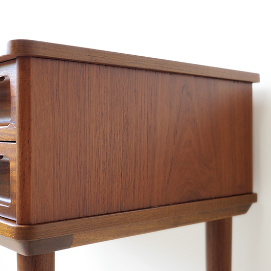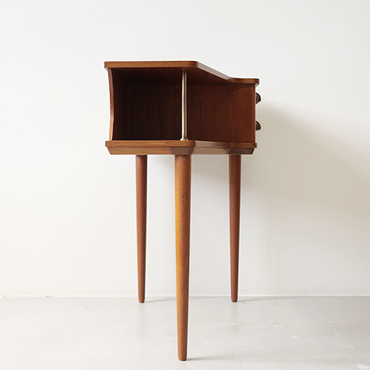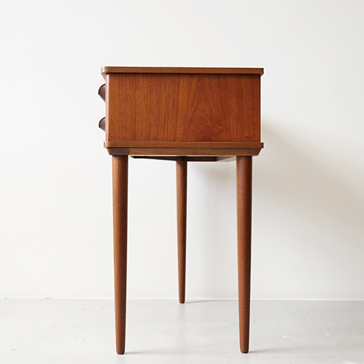 1960年代 デンマークC.F. Christensen 製のヴィンテージキャビネット。Johannes Andersenデザインの作品としてデンマークにて買い付けました。 多角形をした天板の下には右側に引き出しが2段備えられ、左側はオープンスペースとなったアシンメトリーな作りで、その下からは華奢でテーパーのかかった3本脚が伸び、フォルムのエレガントさを際立たせています。 引出しの前板には細やかな造形がなされ、チークの無垢材を長方形に深くくり抜いてからプライウッドの特性を生かしたアールを描く取っ手が取り付けられています。 左側は真鍮の柱1本で支える浮遊感あるデザインで、まるで建造物のピロティ構造のような開放感があります。さらに背板も弧を描くように切り取られており、すべての部分に気を配りこだわりを持ってデザインされていることが伺えます。 そんな唯一無二のデザインを形にしているのは、Johannes AndersenはもとよりWikkelsoなど数々のデザイナーと組んだ工房のC.F. Christensen。実用的であることを念頭に優れたデザインの家具を得意として、ソファやテーブルなど多くの名作を生み出しました。(本体裏面にスタンプが確認できます。) エントランスホールで花器を置き、上部に絵画やウォールミラーを合わせるだけで、空間をより上質なものへと高めてくれそうです。長い脚部により高さもあるため、コンソールテーブルとしても最適です。ソファの脇やベッドサイドなど様々なシーンで活躍してくれます。 全体を丁寧にサンディング(研磨)を行った後に再塗装を行い、自然な艶の非常に綺麗な状態に仕上がりました。引出しの底板は新しく交換しておりますので、清潔に気持ち良くお使いいただけます。僅かな小キズなどが見られますが、気にならない程度かと思います。全体として非常に綺麗な状態です。そのほか細部の状態などは、画像をご参照ください。