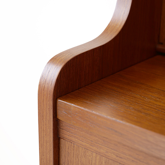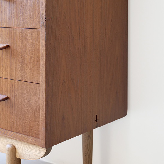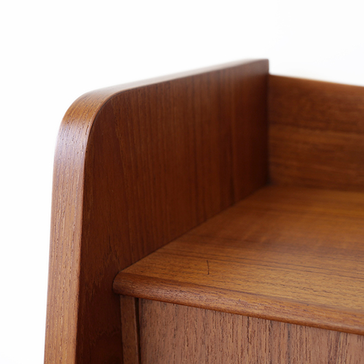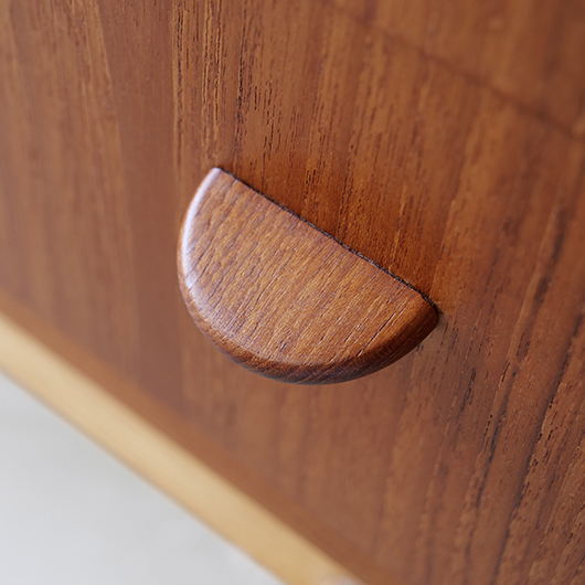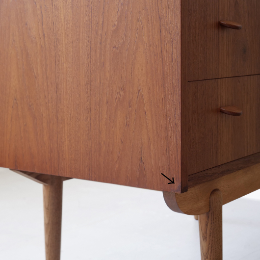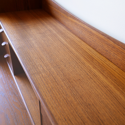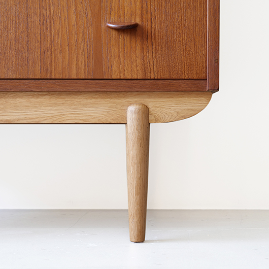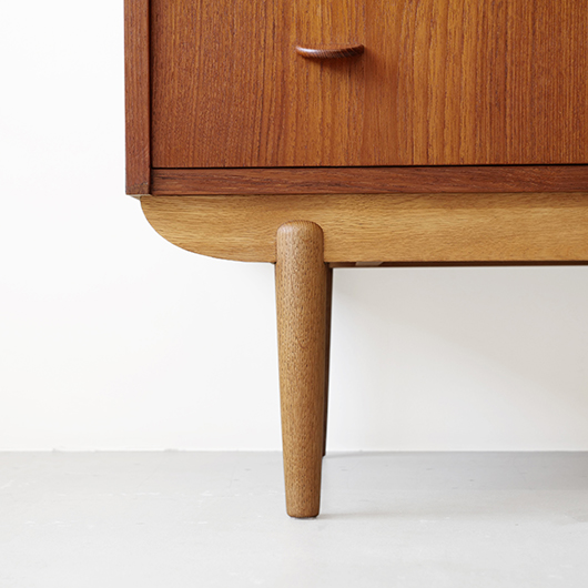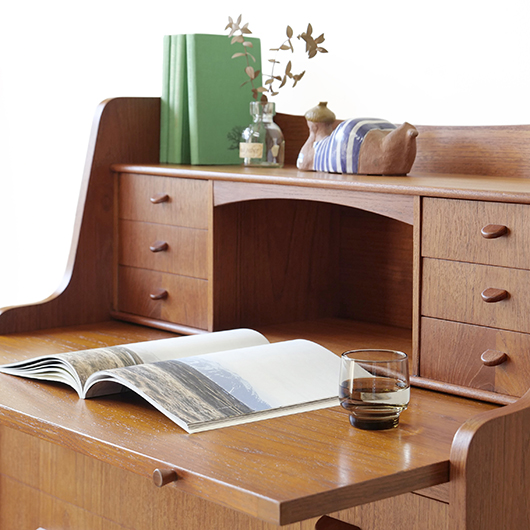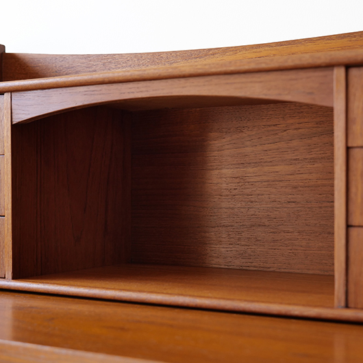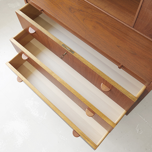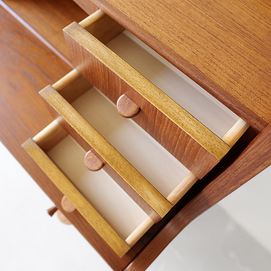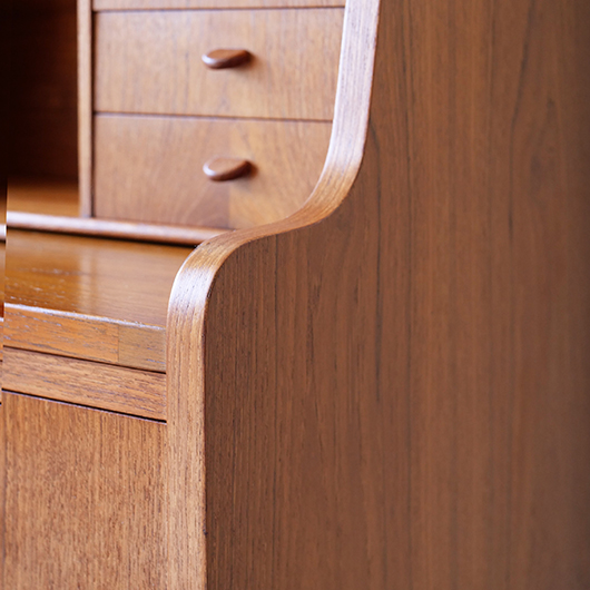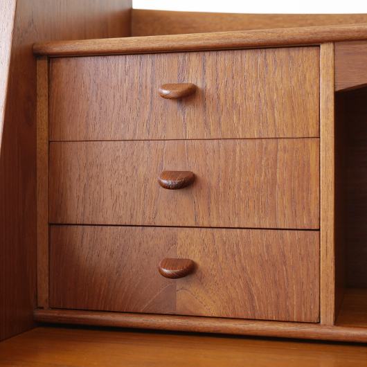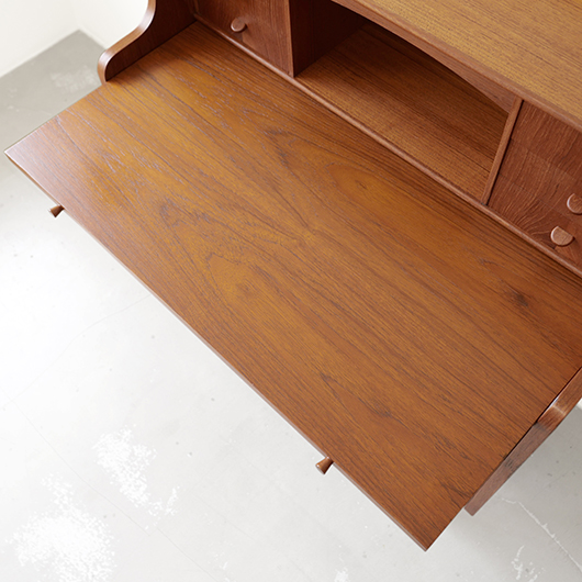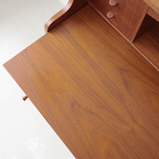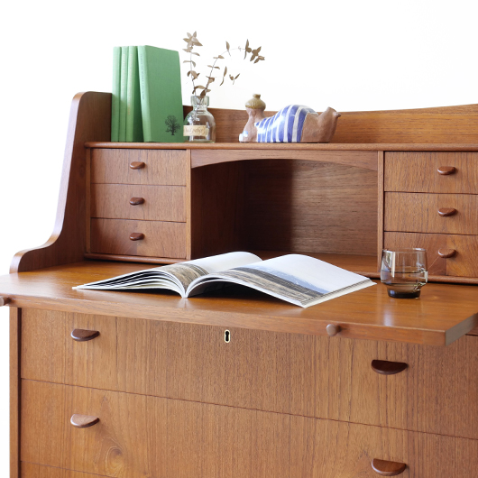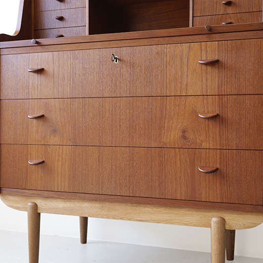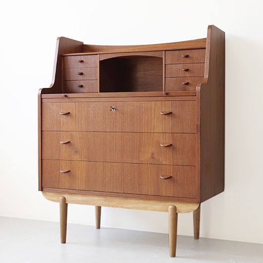 1960年代デンマーク製の、ライティングビューロー。 天板を引き出すとデスクに、下側は3段のチェストとなる便利な一台。上部は左右それぞれに小引出しが3段備えられています。その上の最上段には両サイドに立ち上がりがあるため、本を立てかけたりと使い勝手が良さそうです。下側チェスト上段には雰囲気のある鍵が付属しており、貴重品などの保管にも良さそうです。また正面から見て上下に揃った木目も、丁寧に作られたデンマーク製のヴィンテージらしさのひとつです。 上下の引き出しに共通するのはピョンと飛び出したチーク無垢材の取っ手、半円状のつまみが並ぶ様はとても愛らしく感じます。素材には本体にチーク材、脚部にオーク材が用いられ、色味の異なる樹種を用いたコントラストが効いています。 細々とした文具を収納したりお気に入りの雑貨をディスプレイしたりと、便利にお使いいただける一台です。パソコン机としてリビングの脇に置いても、落ち着いた佇まいで他のインテリアとも馴染むことと思います。 丁寧な修復を行い、全体的に綺麗な状態です。引き出しの底板も新しく交換済みのため、清潔にお使いいただけます。所々にスレや補修箇所が見られますが、雰囲気を損なわない程度かと思います。そのほか細部の状態などは画像をご参照ください。