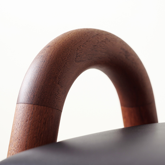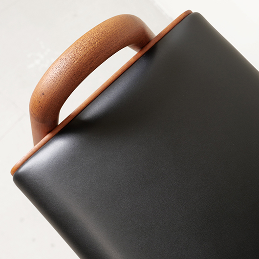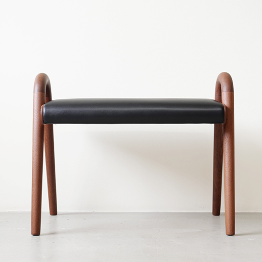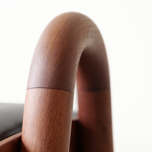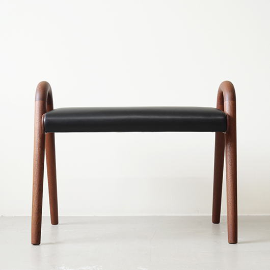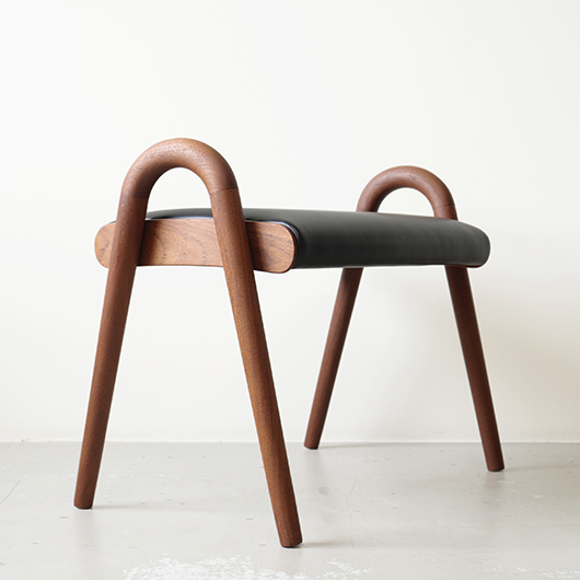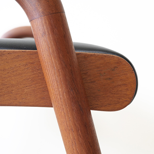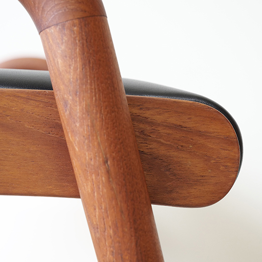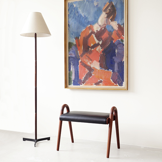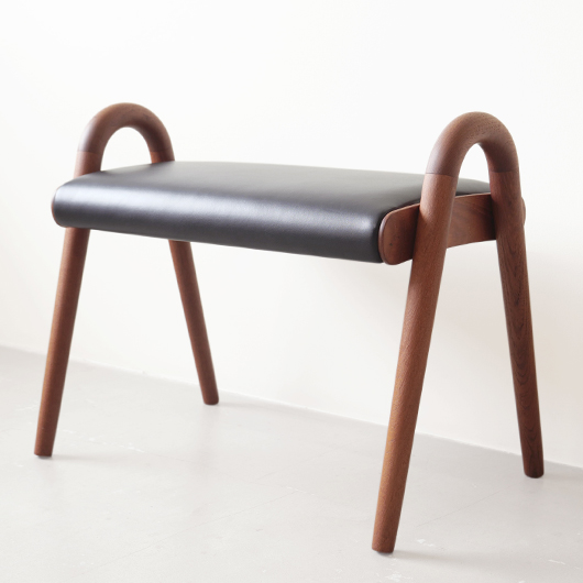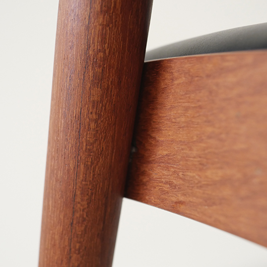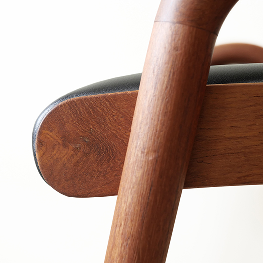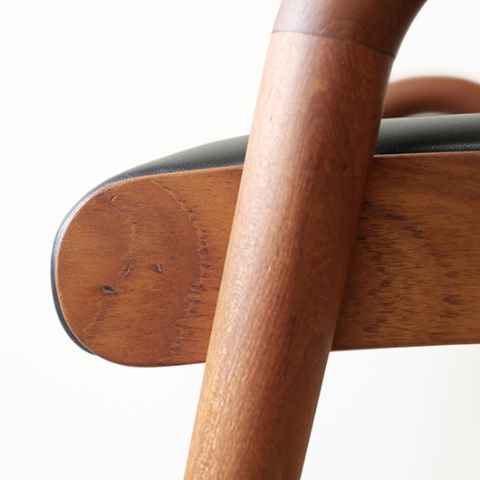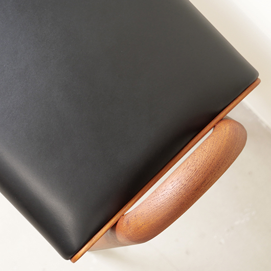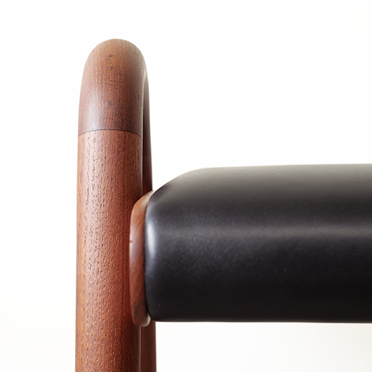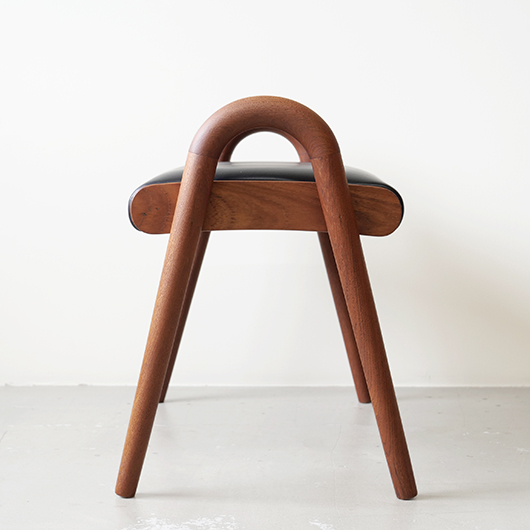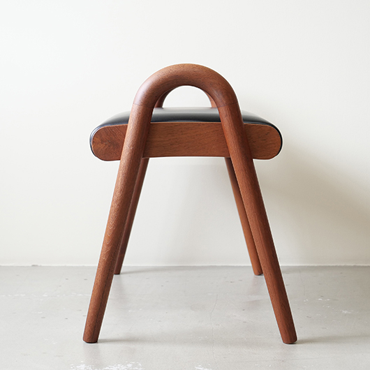 デンマークを代表する建築家 Vilhelm Lauritzenのデザインによる、Fritz Hansen 製のヴィンテージスツール。 わずかに丸みを帯びた座面を、U字の脚部が挟み込むように取り付けられた印象深いデザインです。素材にはこの時代ならではの目の詰まった上質なチーク無垢材が贅沢に用いられています。デザインのポイントとなっているハンドル部分は削り出しによるもので、ダイナミックな木目と共に高度な技術を直に感じることができます。 座面は新たにブラックレザーにて張り替えを行い、合わせて内部のウレタンも交換済です。 19世紀半ばに小さな工房からスタートしたFritz Hansen。現在ではセブンチェアを始めとするスチール脚を用いたモダンなデザインが代表的なメーカーですが、年代を遡るとこの様な工芸的な家具もさまざま生み出していました。静かな佇まいながらモノの放つ力が際立っているため、玄関先の飾り椅子としても非常に絵になると思います。 また彼の設計事務所にはFinn Juhlが勤めていたことでも知られており、自身の設計した建物に合わせてデザインした照明などプロダクトにおいても名作を残しました。特にこちらは近年現地でも出会うことが非常に難しい希少なものとなります。 丁寧な修復を行い、全体的に綺麗な状態です。サイドパネルにわずかな小キズなど見られますが、雰囲気を損ねない程度のものかと思います。そのほか細部の状態などは、画像をご参照ください。