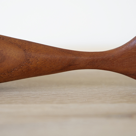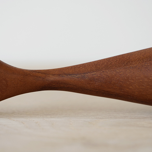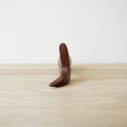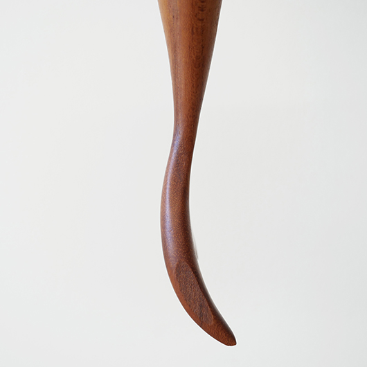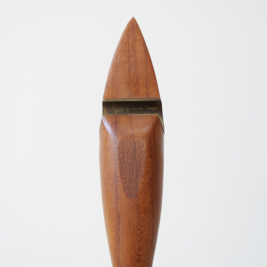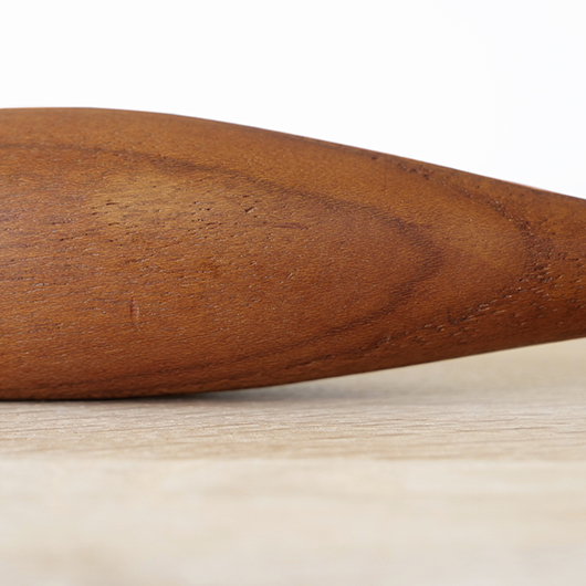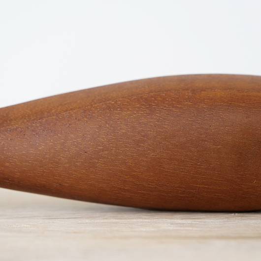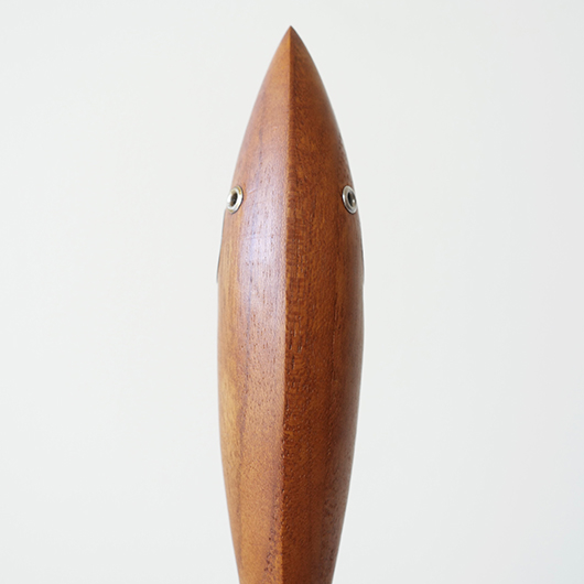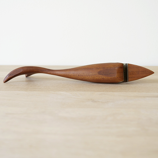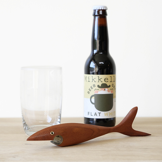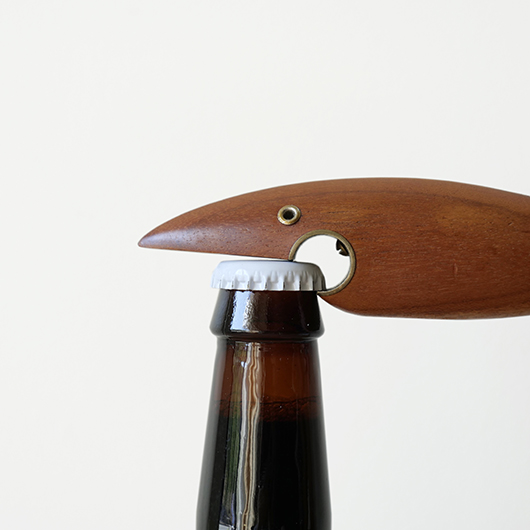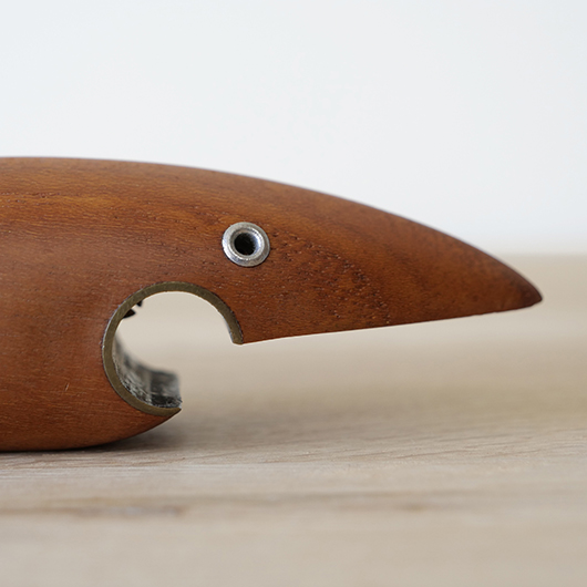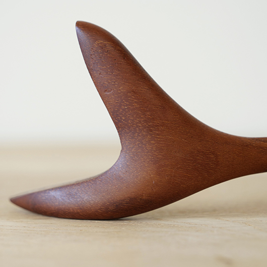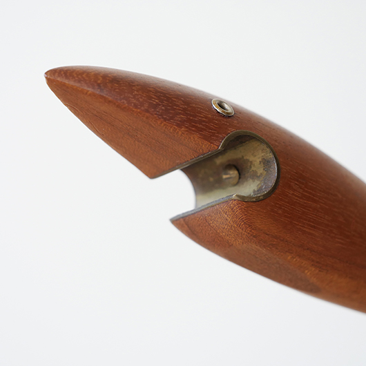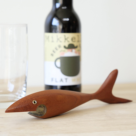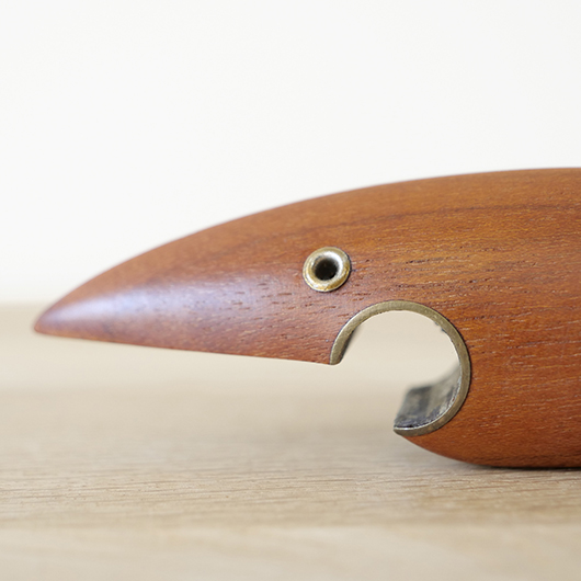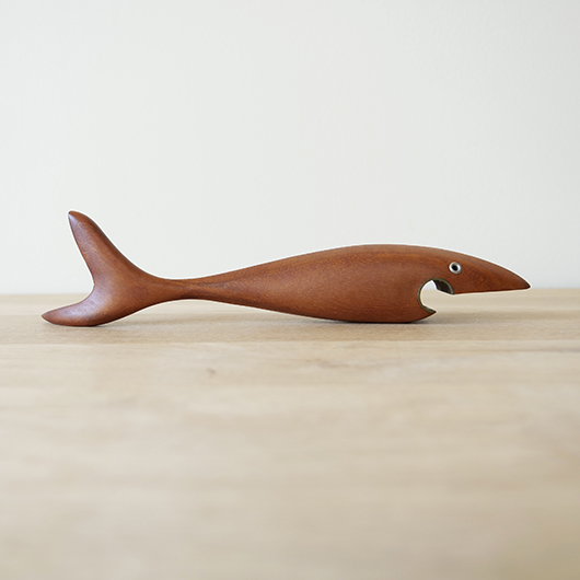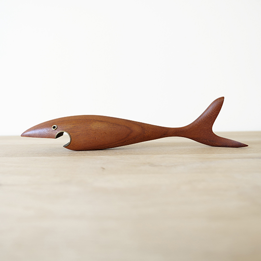 1960年代デンマーク製のヴィンテージ ボトルオープナー。 握った際に手にしっくりと馴染むように中心はややふっくらと、尾に近づくにつれてスレンダーになってゆく、上から見ると美しい流線型のフォルムです。笑っているかのような口元には真鍮金具が付いており、そこに瓶の王冠を引っ掛けて開けるボトルオープナーの役目があります。 素材にはチーク無垢材が用いられ、目の詰まった上質な素材はヴィンテージならではのもの。削り出しによって生まれたこのフォルムは、まるで彫刻のような美しさです。また口は真鍮製で、こちらも当時のデンマーク家具や小物によく見られるコンビネーションです。尾ひれのカーブなど、よく特徴を捉えています。 キッチンの飾り棚に置いておくだけでも絵になる美しい佇まいです。繊細なフォルムですが欠けなどもなく半世紀もの間丁寧に使われていたことが伺えます。 丁寧なメンテナンスを行い、全体として綺麗な状態です。小キズなど見られますが、気にならない程度かと思います。そのほか細部の状態などは画像をご参照ください。