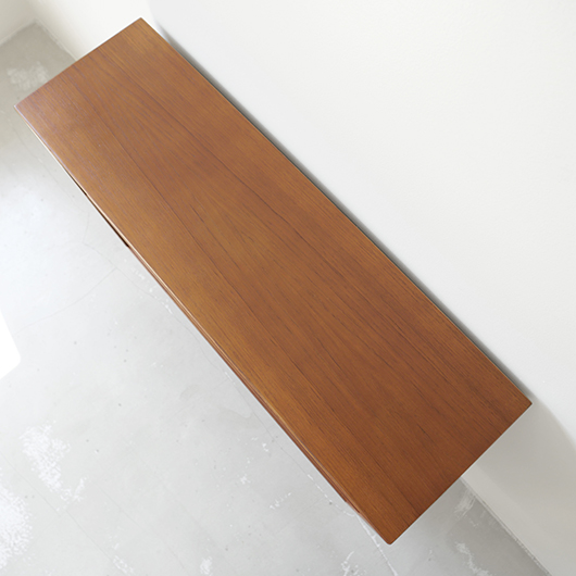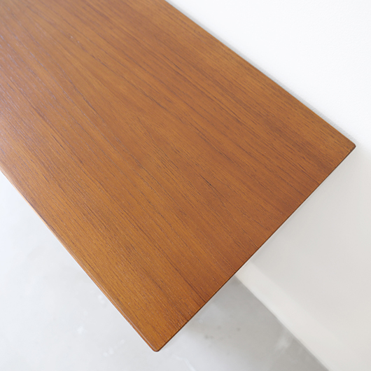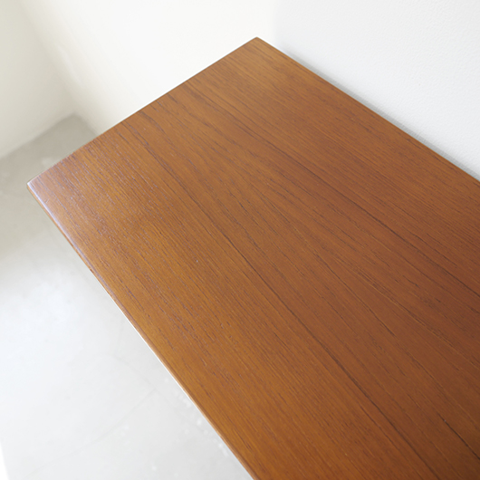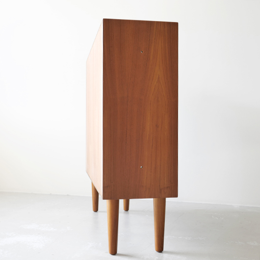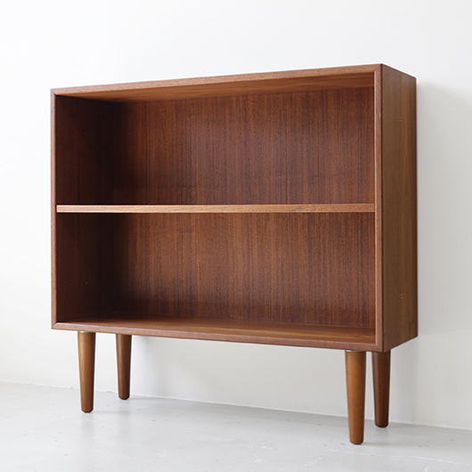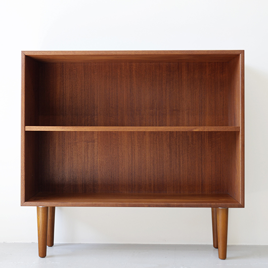1960年代デンマークHjornebo mobelfabrik製のヴィンテージ ブックケース。 すっきりとした横長サイズの本棚で、5段階に可動する棚板が一枚付属しています。四隅の接合は留め継ぎを用いており、すっきりとスマートに見せています。その下から伸びるテーパーのかかった丸脚も、北欧ヴィンテージらしい雰囲気を作り出してくれます。 高さの抑えたサイズ感のため圧迫感がなく、本棚や飾り棚として様々な場所で活躍してくれそうです。天板にお気に入りの小物や照明を置いたり、上部にポスターや絵画、ミラーなどを合わせて、お楽しみいただけます。探すと意外と見つからないサイズの本棚かと思います。 丁寧な修復を施しまして、全体的に綺麗な状態です。棚板にわずかなスレが見られますが、気にならない程度かと思います。横に並べて連続して使うことができる仕様のため、側面に連結用の穴が見られます。オリジナルの穴で後から空けられたものではありません。そのほか細部の状態などは、画像をご参照ください。