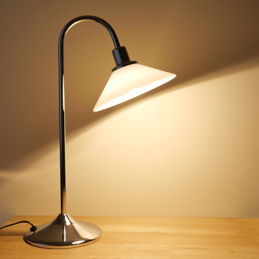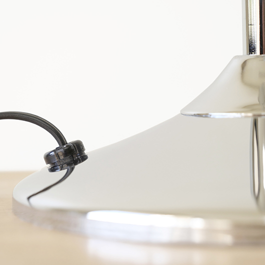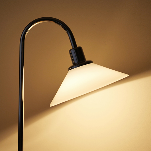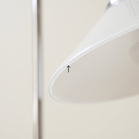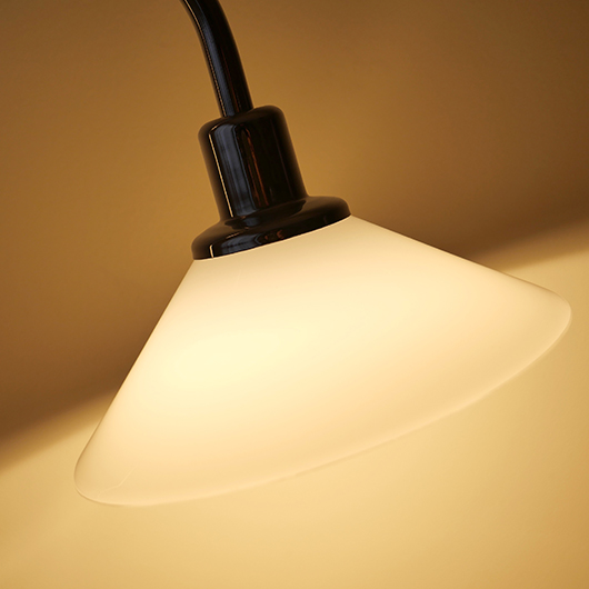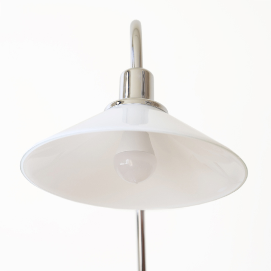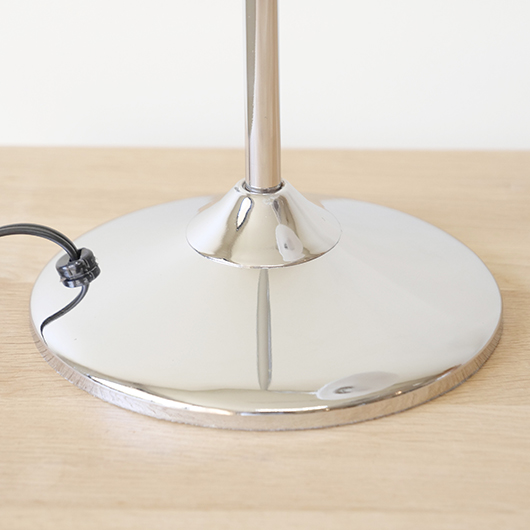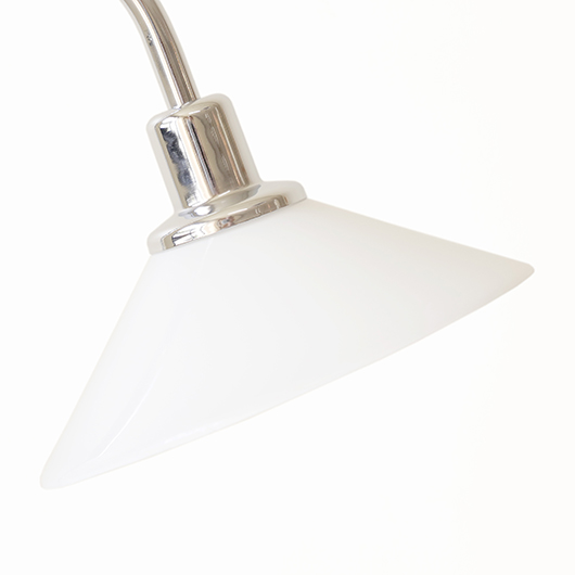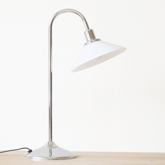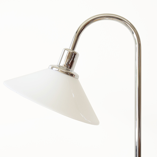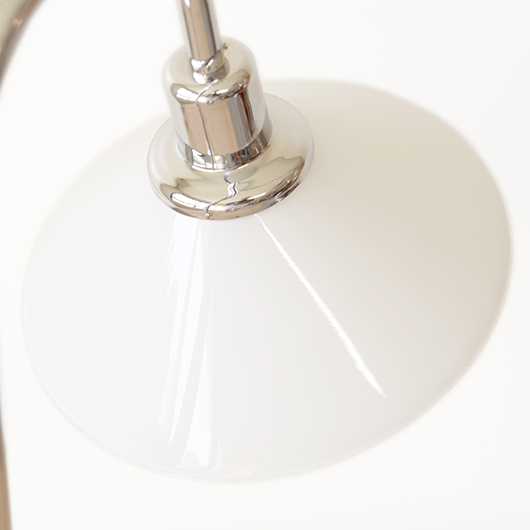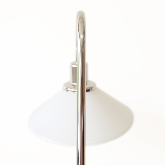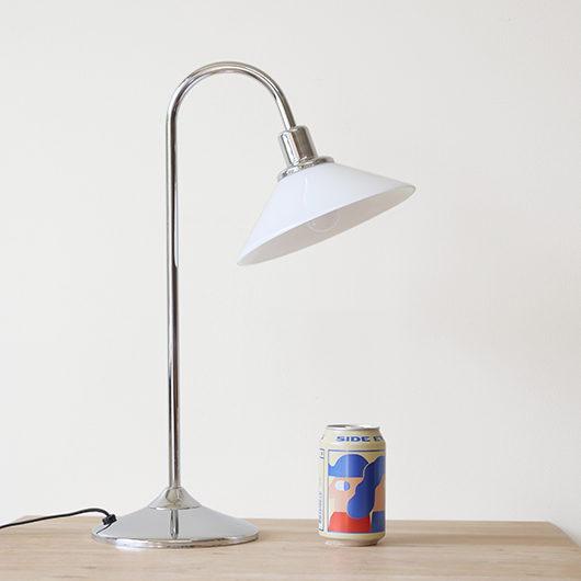 1970年代デンマーク製のヴィンテージ テーブルランプ。 艶やかな円錐形のベースからスッと伸びたアームは、その先で緩やかな曲線となり円錐形のガラスシェードへと繋がっていきます。シェードは艶のあるホワイト色で、光を灯した際に下方のみならずガラスを通して上部にまであかりを届けてくれます。スチールとガラスの組み合わせはPHランプにも見られる組み合わせで、スッキリと凛とした佇まいが印象的です。 コーヒーテーブルに置いてソファやベッドサイドの明かりとして、または玄関のコンソールテーブルに合わせても涼やかな空間を作り出してくれそうです。 電気工事士の資格を持つ職人によりソケット・配線・プラグ等の電気に関わる部分は全て交換し、電気用品安全法に基づいた点検なども行いPSEマークを表示しておりますので、新しいもの同様に安心してご使用いただけます(詳しくは下記をご覧ください)。 丁寧な修復を施しまして、全体的に綺麗な状態です。シェードのエッジに僅かなチップが見られますが雰囲気を損ねる程ではないと思います。そのほか細部の状態などは、画像をご参照ください。
