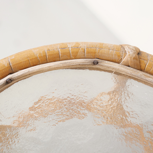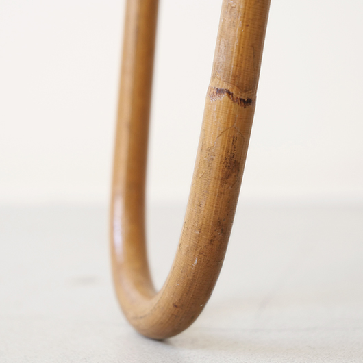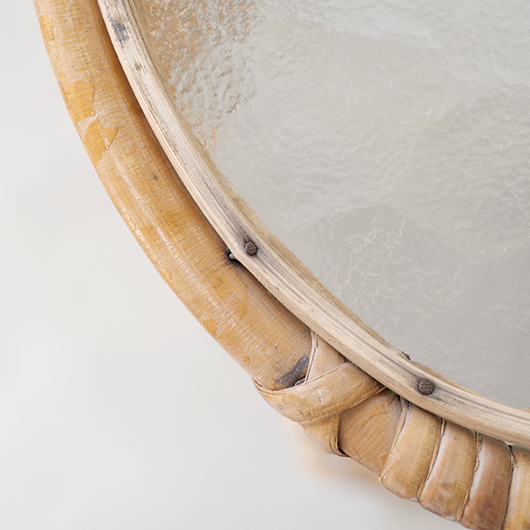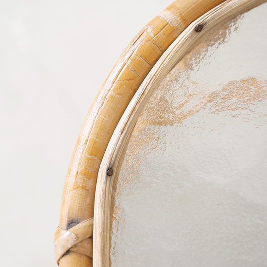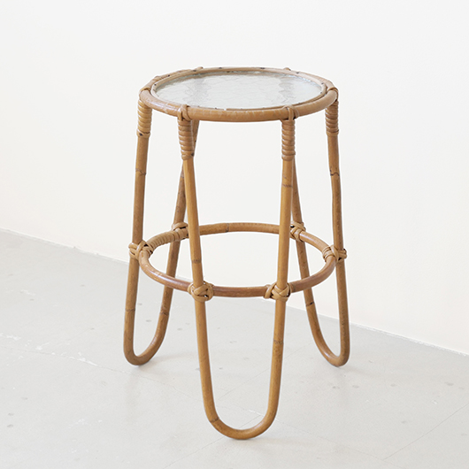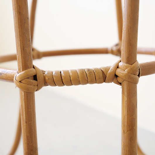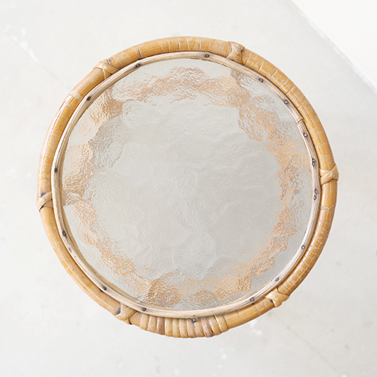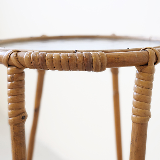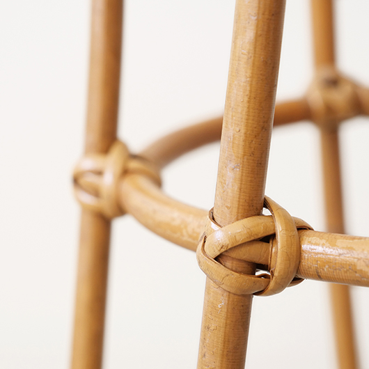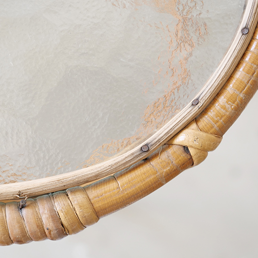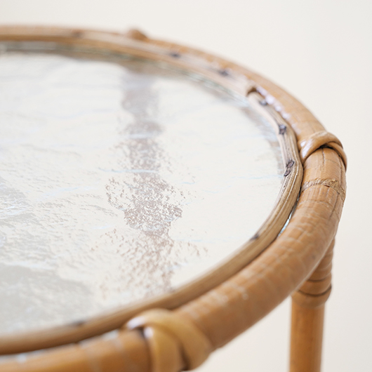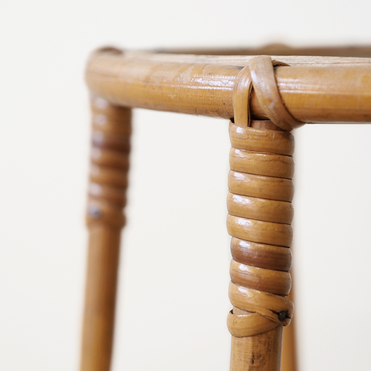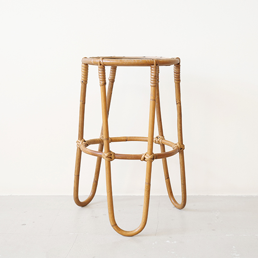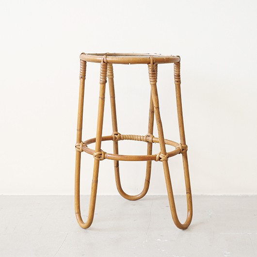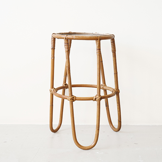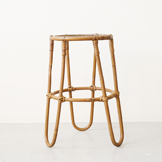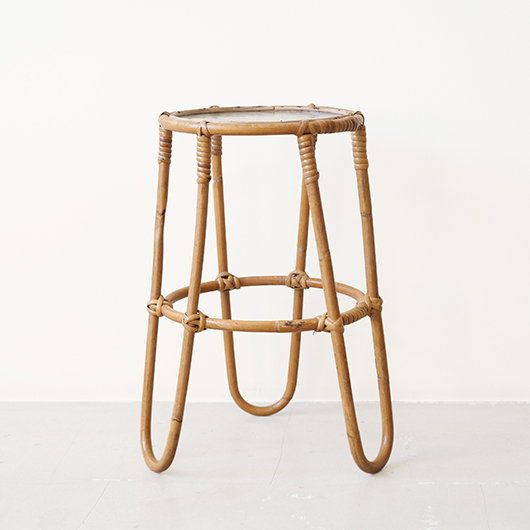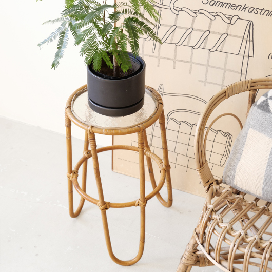 デンマークで買い付けをしました、ヴィンテージ フラワースタンド。 天板には静けさの漂う湖面のような味わいのあるガラスが用いられ、ヴィンテージらしい雰囲気を醸し出しています。 フレームにはラタンの皮付きの太めのものを、飾り部分も同じラタンのやわらかな皮籐が用いられ、200種類もあると言われるラタンをうまく組み合わせて作られています。丈夫でよくしなる特徴を生かした、V字に深く曲げた3本脚がデザインのポイントとなっています。 デンマークの一軒家には広いサンルームがよくあり、ラタン製のパーソナルソファやサイドテーブル、花台などが置かれているのを見かけます。その雰囲気を取り入れて、窓際やインナーテラスで小さな植木鉢を置いて飾ってはいかがでしょうか。もちろんソファに合わせてサイドテーブルとしても活躍してくれることと思います。 ”Loppis(蚤の市)”コーナーということで所々に気にならない程度の経年感が見られますが、それを含めてヴィンテージらしい味わいだと感じます。全体として良好な状態を保っています。そのほか細部の状態などは、画像をご参照ください。