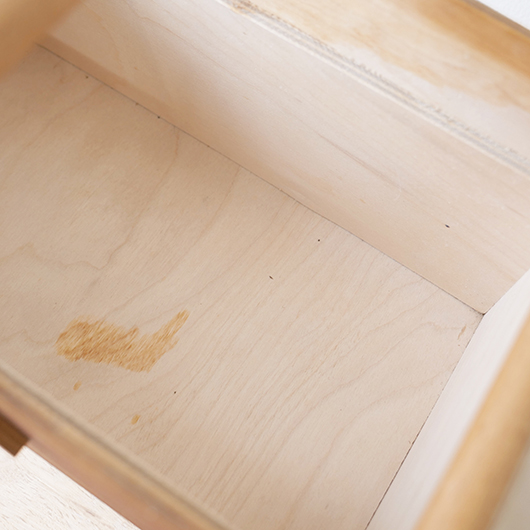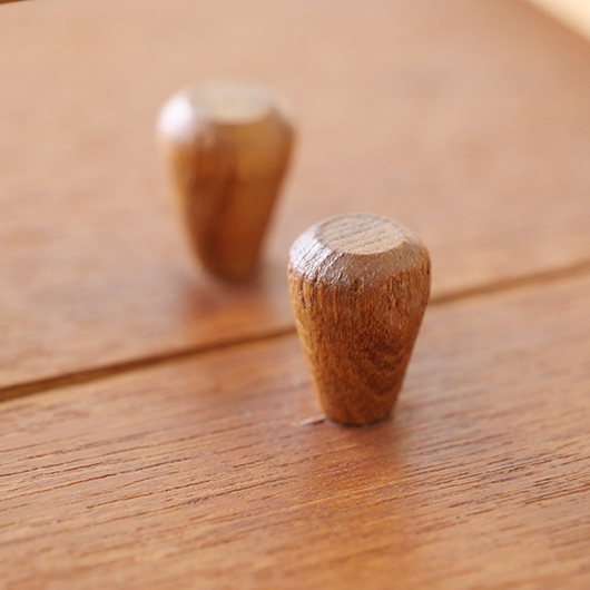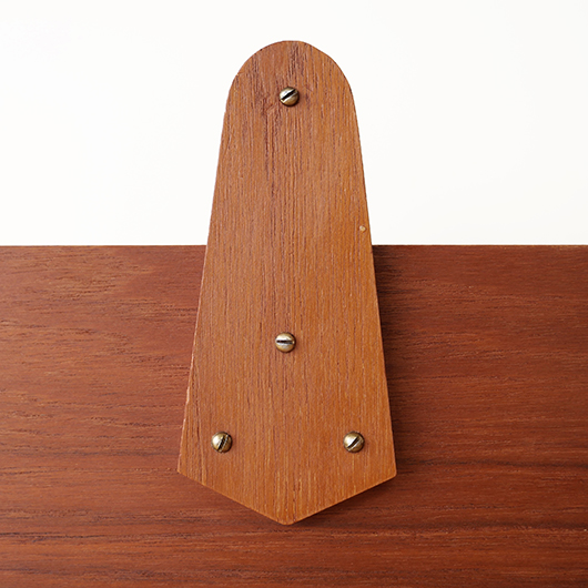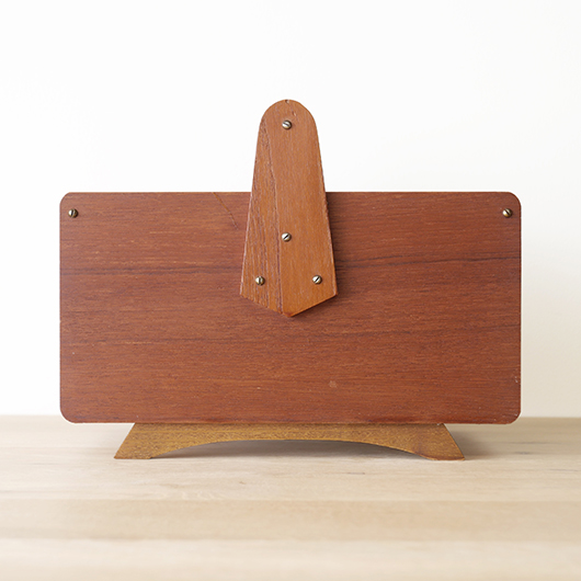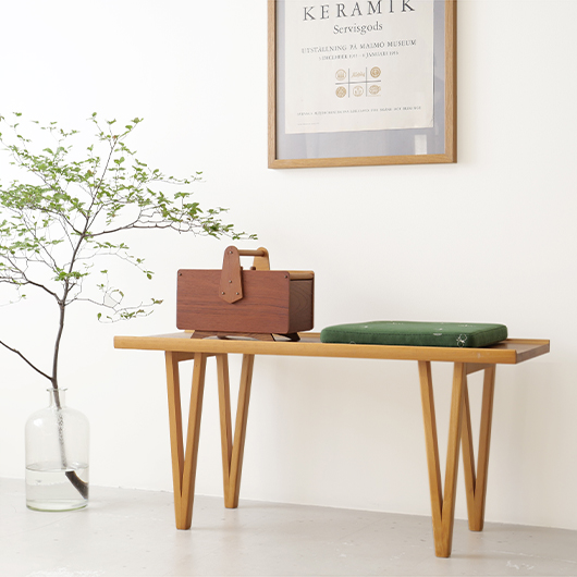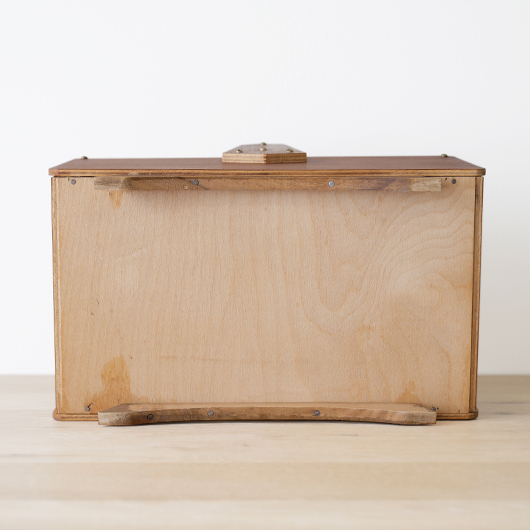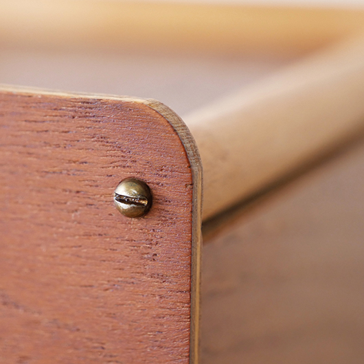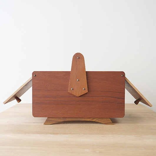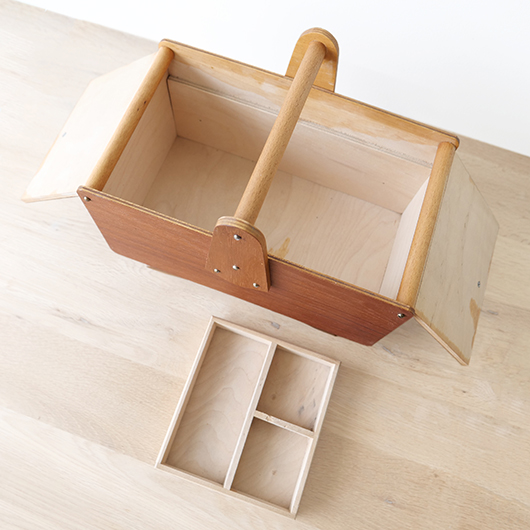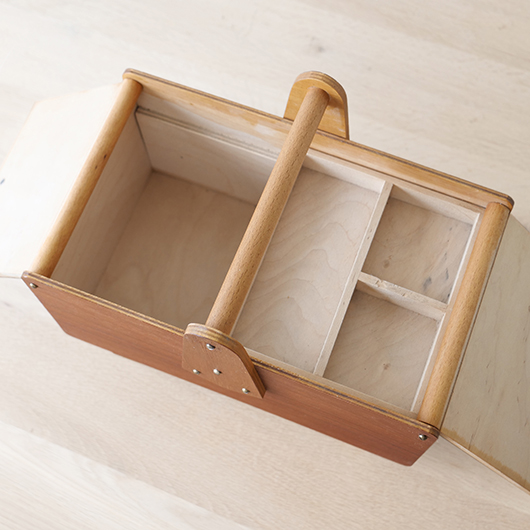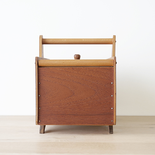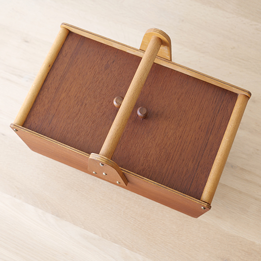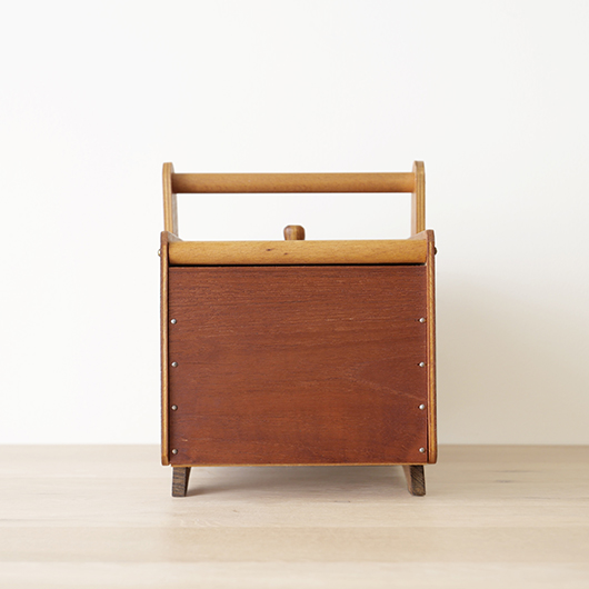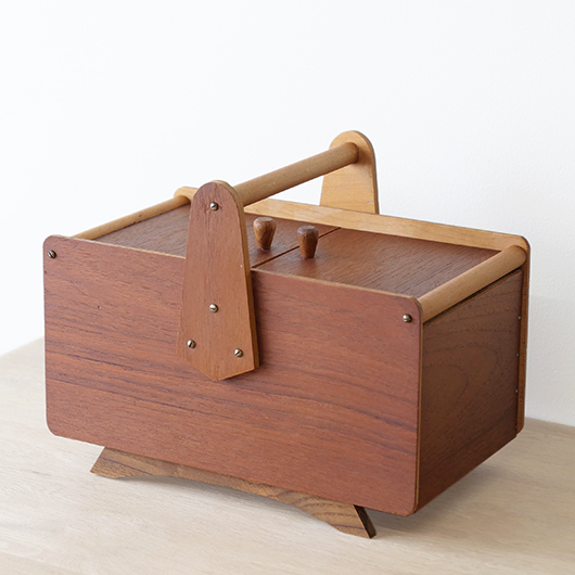 1960年代スウェーデン製のヴィンテージ ソーイングボックス。 観音開きの扉を開けると深い収納部が現れ、上方にスライド式で細かく仕切られたケースが1枚付属しています。そして前後をまたぐようにハンドルがつき、持ち運びに便利な作りです。また上から見ると扉開閉の構造である左右の円柱とハンドルの円柱が3本並び、リズミカルなデザイン性を持たせているようです。 本体にはチーク材、脚部にオーク材、フレームにビーチ材が用いられ、異なる色味の3種を効果的に組み合わせることで軽やかな印象を与えてくれます。そこに小さな真鍮ビスが合わさることで、北欧ヴィンテージらしさをプラスしています。 普段はリビングの片隅に置き、必要な時にさっと動かせる便利な収納箱。中は裁縫道具にとらわれず、文具や薬箱など細かなものを収納するのに向いています。こちらは特に小ぶりなサイズ感のため、テーブルやベンチなど気軽に置いて使用できます。 丁寧なメンテナンスを行い、全体的に綺麗な状態です。内部などに取りきれないシミが残りますが、雰囲気を損ねない程度かと思います。そのほか細部の状態などは画像をご参照ください。