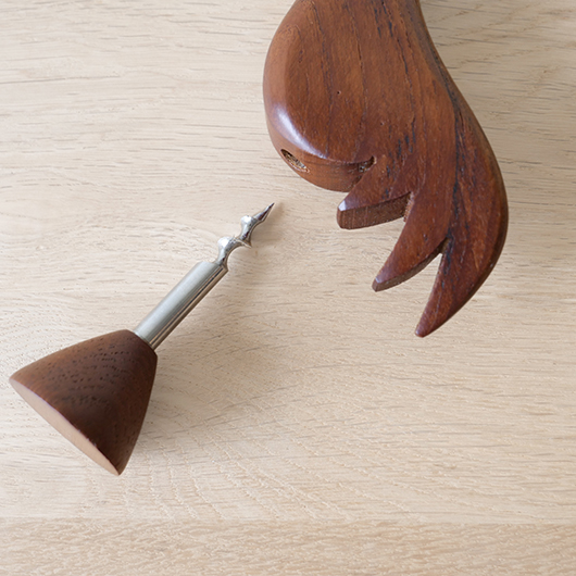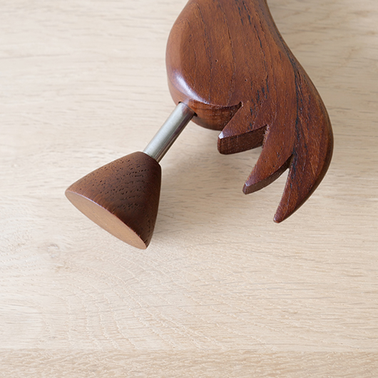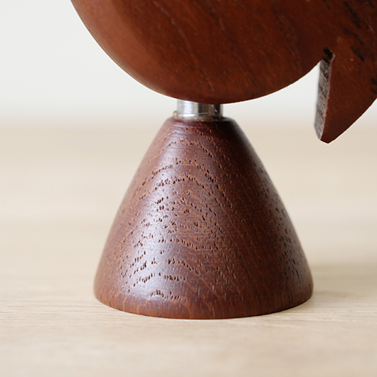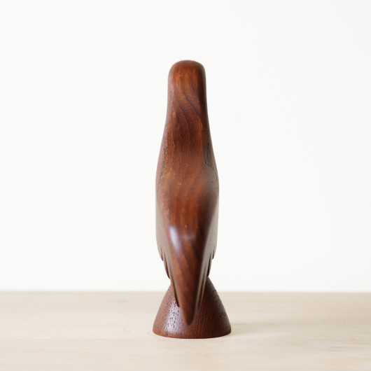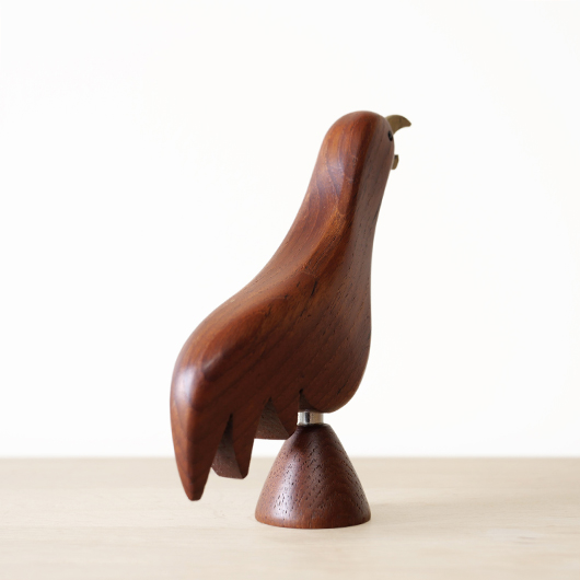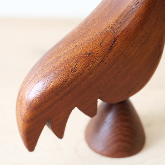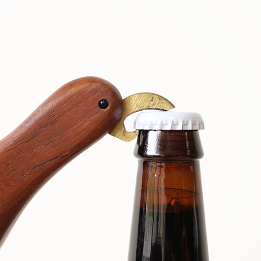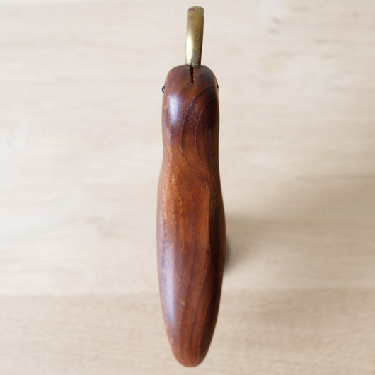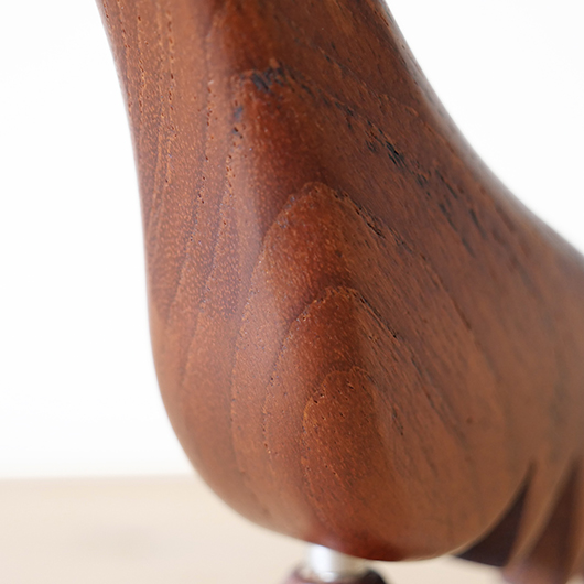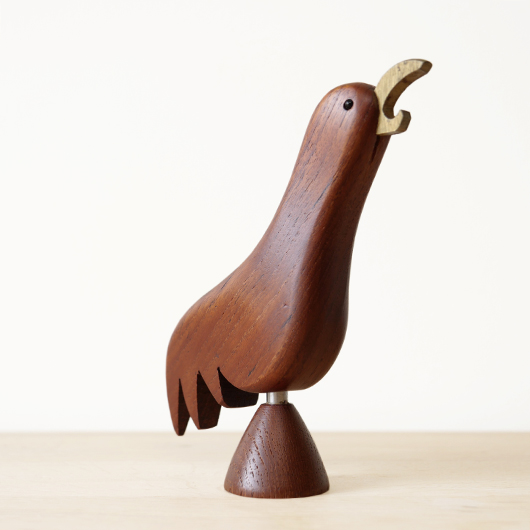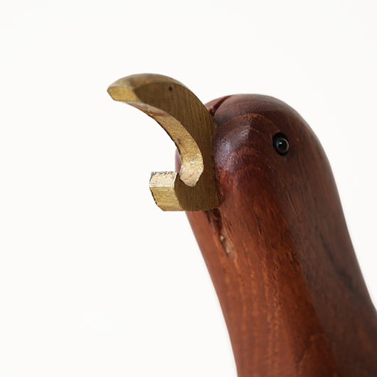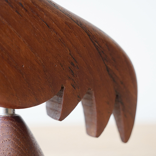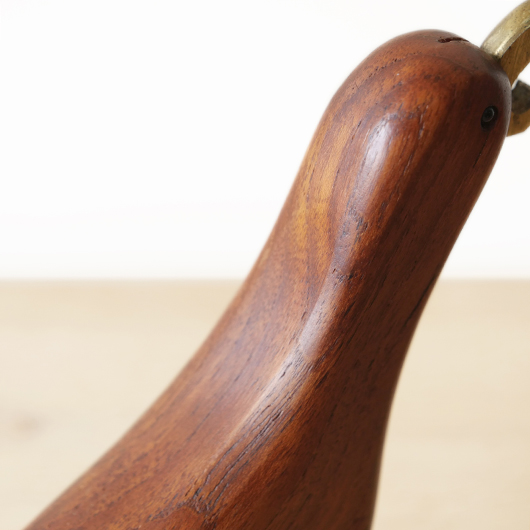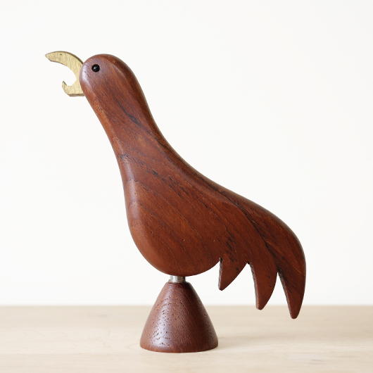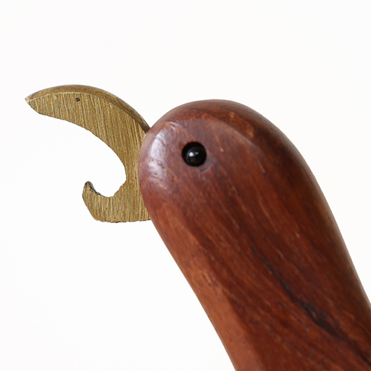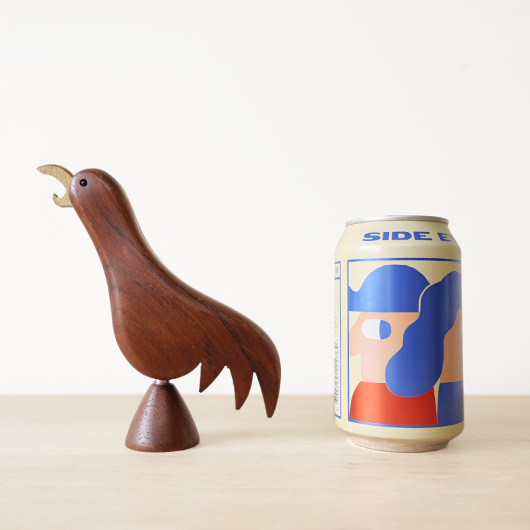 1960年代デンマーク製のヴィンテージ ボトルオープナー/コルクスクリュー。 コックリとした深い色合いのチーク無垢材を削り出して作ったのは、楽しげなさえずりが聞こえてきそうな鳥の姿。大きく開いた真鍮製のくちばしは瓶の王冠を引っ掛けて開けるボトルオープナーなっており、背に沿って掴むとちょうど良い角度に設計されてることが分かります。 土台にも同じくチーク無垢材が用いられており、本体から引き抜くとコルクスクリューが現れる2-way仕様となっています。 つぶらな瞳に真鍮製のくちばし、そしてヴィンテージならではの目の詰まった上質なチーク材を贅沢にも削り出して生まれたボディは、ヴィンテージでしか手に入らないものです。 キッチンの飾り棚に置いておくだけでも絵になる愛らしいフォルムをしています。実用性を兼ね備えたキッチンアイテムとしていかがでしょうか。 丁寧なメンテナンスを行い、全体として綺麗な状態です。そのほか細部の状態などは画像をご参照ください。