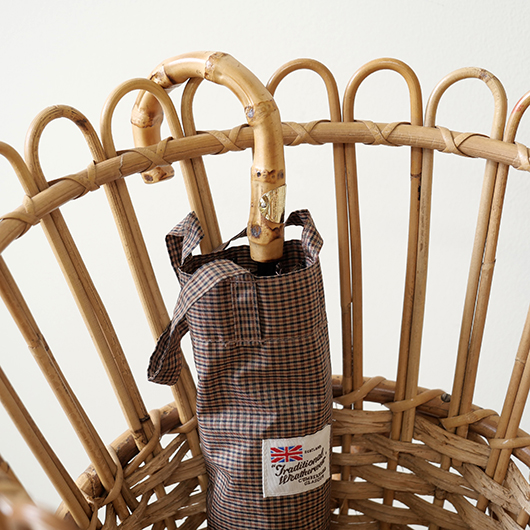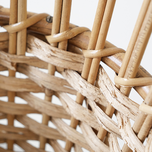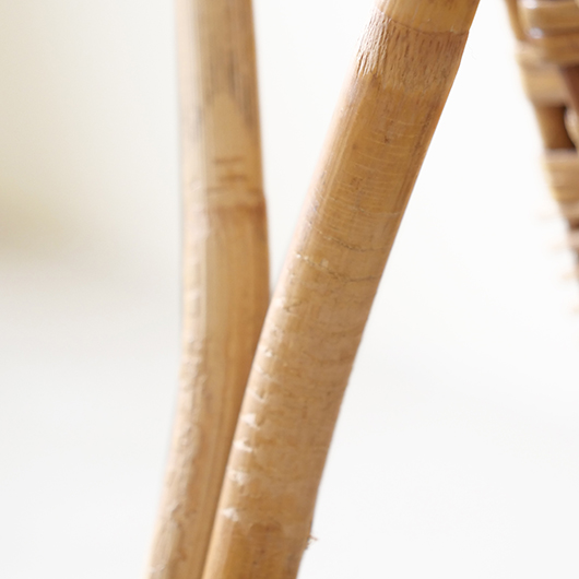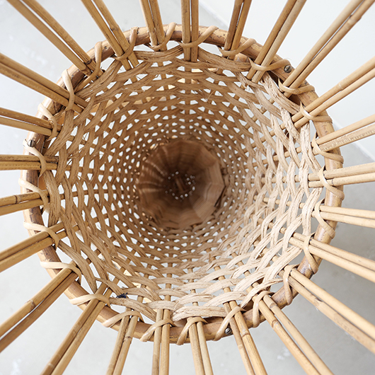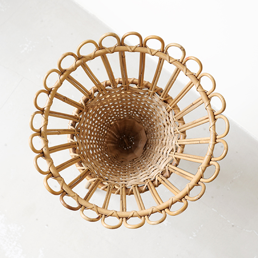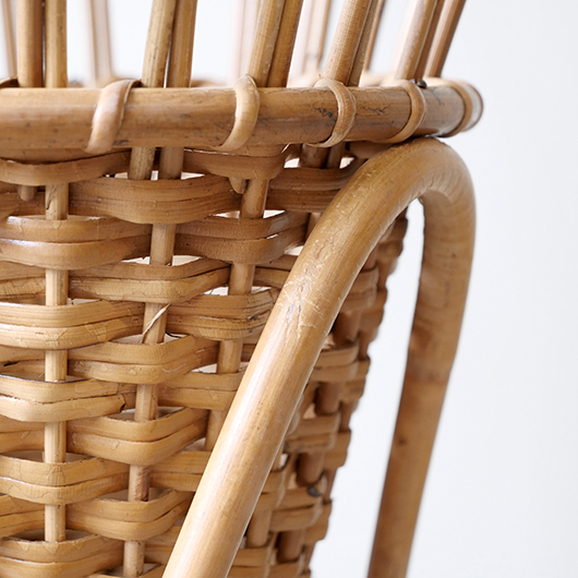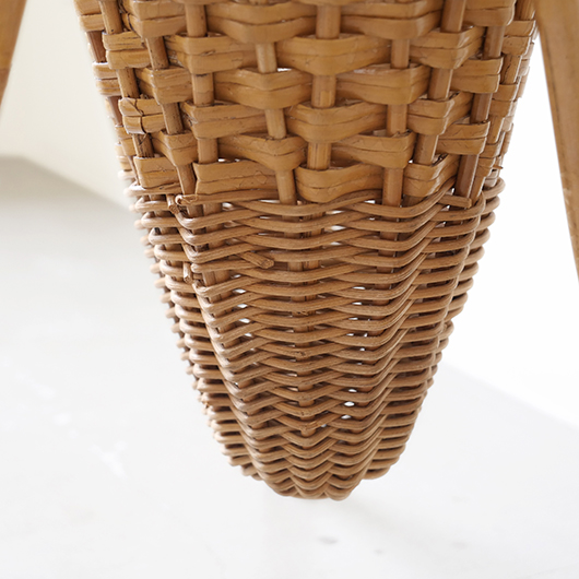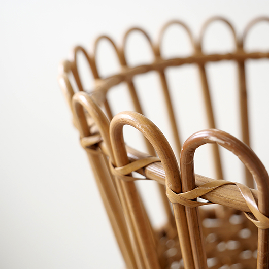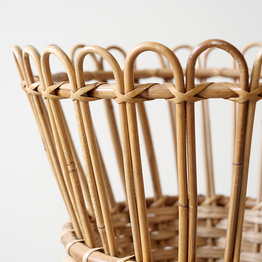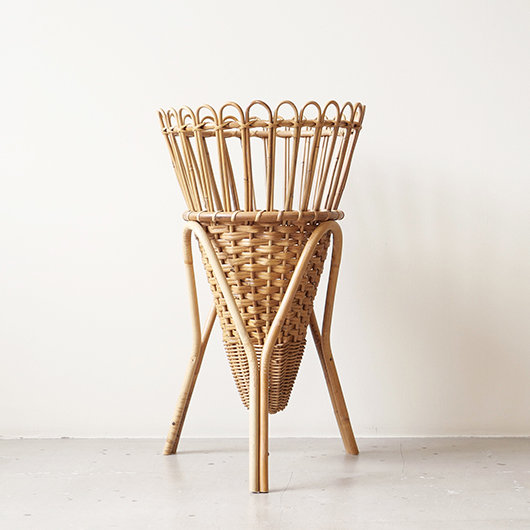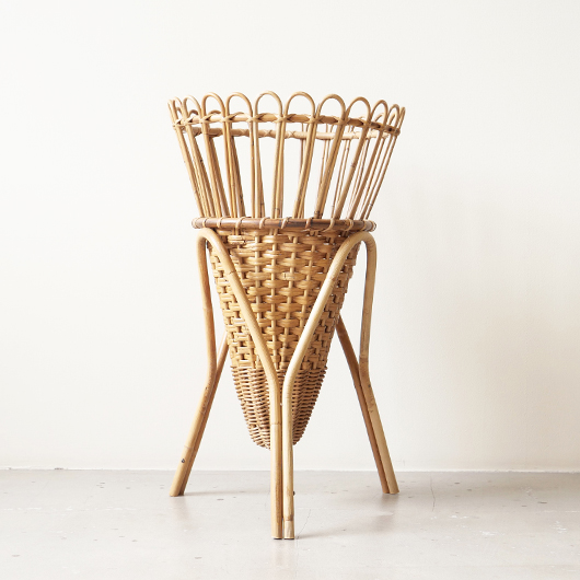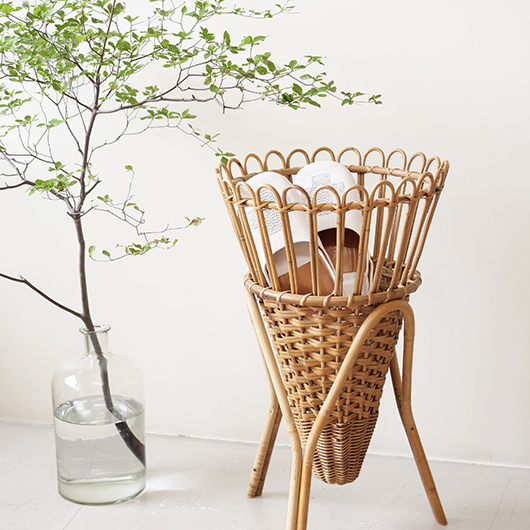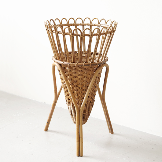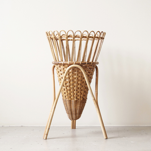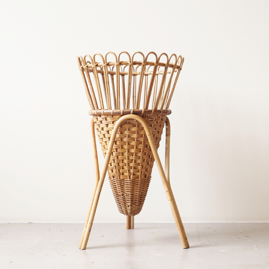デンマークで買い付けましたヴィンテージバスケット。 円錐形のフォルムをした本体は3パターンの編み方が組み合わされており、中心は平たいラタンを2本素編みに、下方はより強固にするために細い丸芯を用いて細かく、そして上部はフープ状に組んで華やかさを出しています。 脚部にも同じくラタンが用いられており、皮付きの太めのものU字に曲げ、それを3本脚として本体を下から支えています。大ぶりのバスケットの中でもインテリアとして計算された作りで、凝ったデザインと実用性を併せ持っています。 玄関先でスリッパを収納したり、傘立て(乾いた状態の傘を入れる)として雰囲気あるインテリアとして活躍してくれることと思います。その他ドライフラワーなどを入れても良さそうです。現地でもほとんど見かけることのないスペシャルな一台を日常に取り入れてはいかがでしょうか。 丁寧なメンテナンスを行いまして、綺麗な状態です。若干のスレやキレなどの箇所がございますが、気にならない程度かと思います。そのほか細部の状態などは、画像をご参照ください。