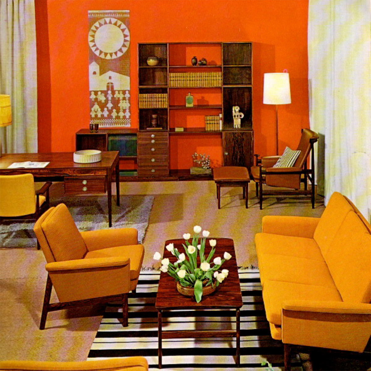【Design from Denmarkより】 こちらも同様に当時のインテリア雑誌で、奥に同じデスクとチェアの組み合わせが見えます。さらに壁際には同取っ手を使ったBookshelf system” Cresco”まで組み合わされて、とても統一感あるリビングですね。