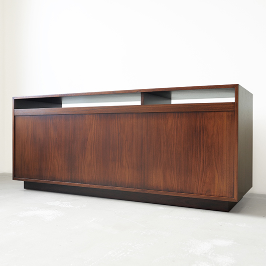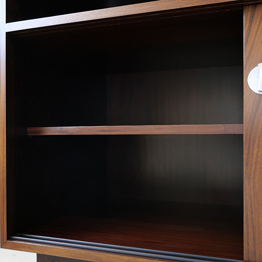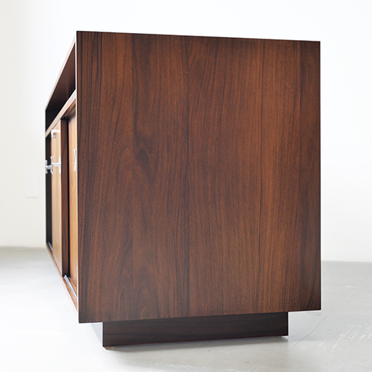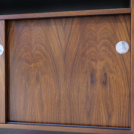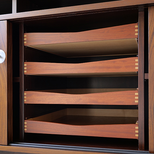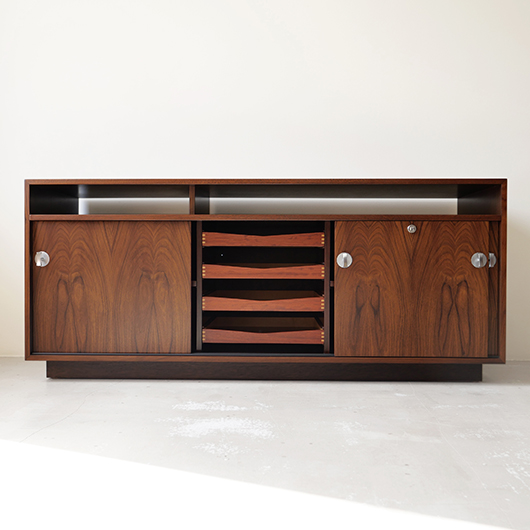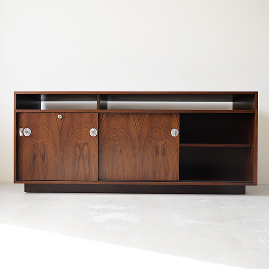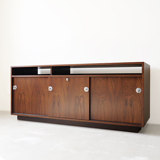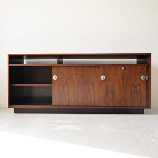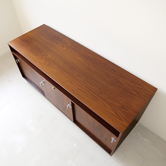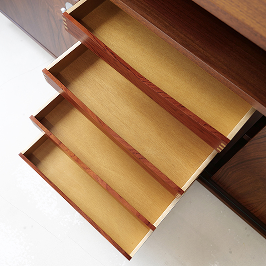 1961-62年 Finn Juhlのデザインによる、デンマークFrance&Son製のヴィンテージ サイドボード。 3枚の引き違い戸にはT字の取っ手が付き、艶消しスチールのキリリとした佇まいが全体の雰囲気によくマッチしています。内部の構造は左右に一枚づつ棚板が備えられた収納部、中央には4枚の浅いトレーが内蔵されています。トレーの接合部には凹凸の組み手を接合した組み継ぎの技法を用いて、華やかさを感じるデザイン性をプラスし扉を開けた際に内部のデザインをとても印象深いものとしています。 素材にはローズウッド材が用いられ、広い天板は見応えのある木目が広がっています。天板下に浅いオープンスペースが設けられているのも、利便性を考えてデザインされていることが伺えます。 国連会議室のためにデザインされたDiplopanChairを筆頭としたDiplomatシリーズは、チェアの他にもデスクやブックシェルフシステムなどがデザインされました。このサイドボードも同シリーズのひとつで、特徴的な取っ手などの共通点があり合わせてオフィスでの使用を考えられたものとなります。 リビングに置いてテレビ台として使用するのにちょうど良い高さかと思います。天板下のオープンスペースにAV機器などを置くと、背面が抜けているためコードを裏に回せてすっきりと使用することができます。その他、寝室などでミラーや絵画などと合わせて印象的なコーナー作りにもおすすめです。またそのシャープなデザインはワークスペースでも活躍してくれることと思います。幅141cmというデンマークのサイドボードとしては小ぶりで、とても使い勝手のよいサイズです。 全体を丁寧に研磨(サンディング)をして小キズや輪ジミを取り除き、その後に再塗装を行い、自然な艶の良い雰囲気に仕上がりました。鍵は付属しておりません。そのほか細部の状態などは、画像をご参照ください。