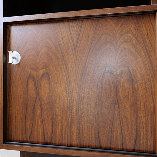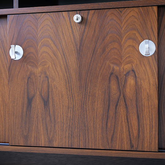 【mobilia 1963年No.96より】 こちらは当時のインテリア雑誌に掲載されたFrance and sonの広告で、今回のサイドボードと同シリーズのDiplomat ChairとDiplomat Writing Deskが載っています。デスクの引き出しには同デザインの取っ手が見られ、どんな豪華なワークスペースだろうと想像してしまいます。 【Design from Denmarkより】 こちらも同様に当時のインテリア雑誌で、奥に同じデスクとチェアの組み合わせが見えます。さらに壁際には同取っ手を使ったBookshelf system” Cresco”まで組み合わされて、とても統一感あるリビングですね。