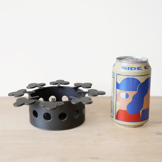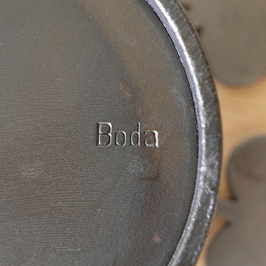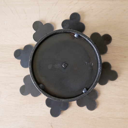 スウェーデンの Bertil Vallien デザインによる1960年代Boda Smide製のヴィンテージキャンドルホルダー。 ロートアイロン製の円柱の周りをクローバーの葉が8枚取り囲んでいます。円柱のボディは中心にキャンドルホルダーが内蔵され、ティーキャンドルをピッタリと収めることができます。 元々ガラスで有名なBodaの工場の近くに鍛治職人Axel Strömgrenの営む工房があったのだそう。そこに当時Bodaに所属していたErik Hoglundが通い始め、ガラスとアイアンを組み合わせた作品を作るようになり、Boda Smideが誕生しました。1960年代よりVallienも参加して、キャンドルスタンドやシャンデリアなど数々のインテリアを生み出しました。 キャンドルを灯して1日の終わりをゆらめく炎を眺めて心穏やかに過ごしたり、火を灯さずともオブジェとして置いておくだけで絵になる一台です。世界の美術館でもパーマネントコレクションされているアーティスト Vallien の作品を日々の暮らしに取り入れてはいかがでしょうか。 目立ったダメージもなく全体的に非常に綺麗な状態です。そのほか細部の状態などは、画像をご参照ください。
