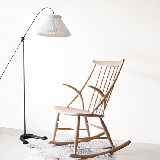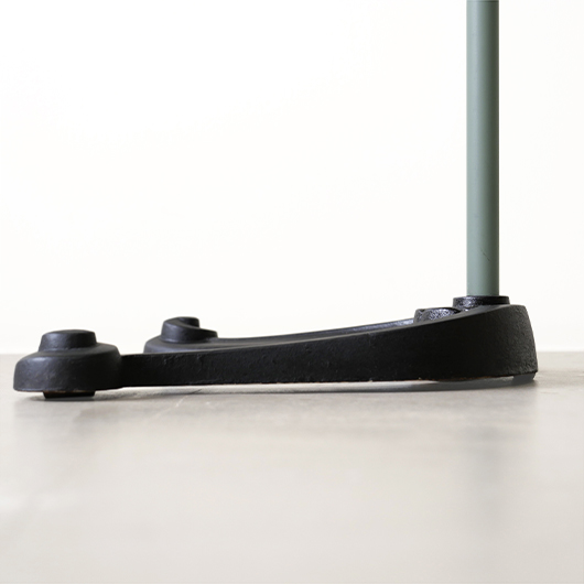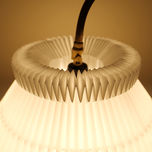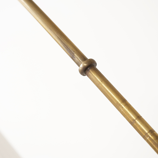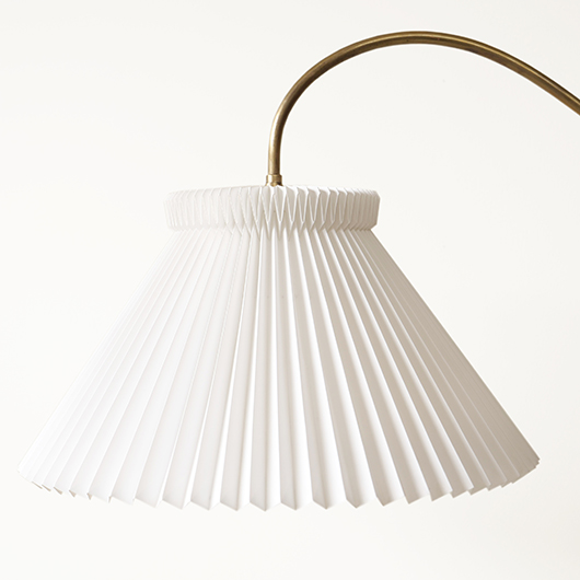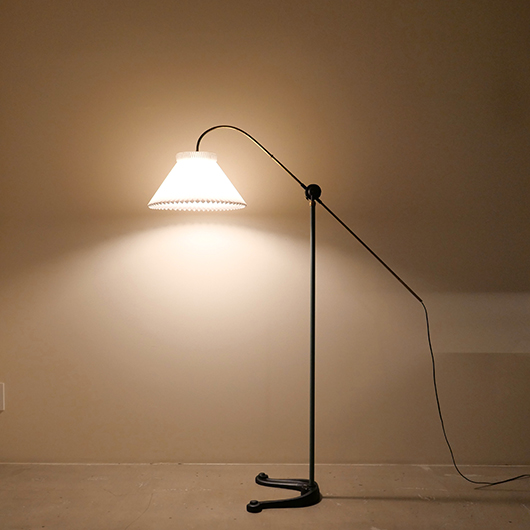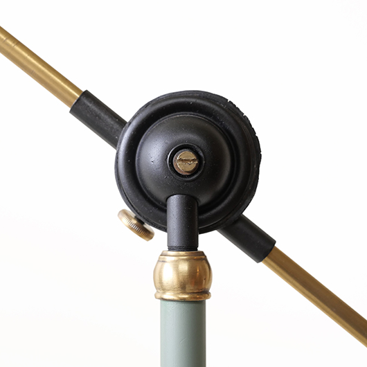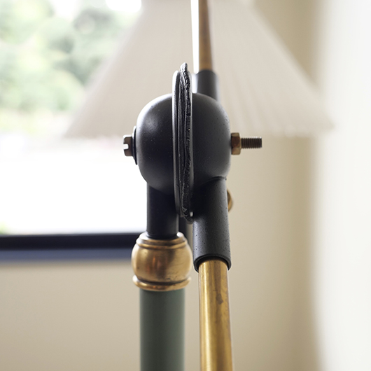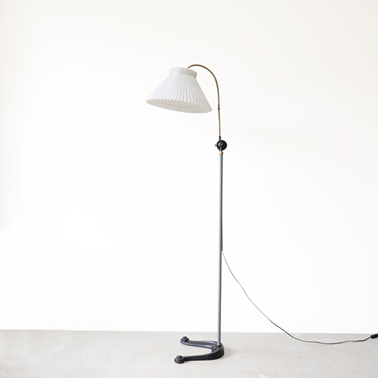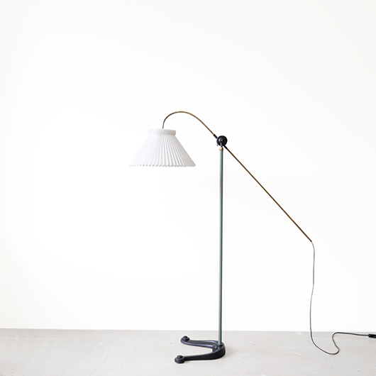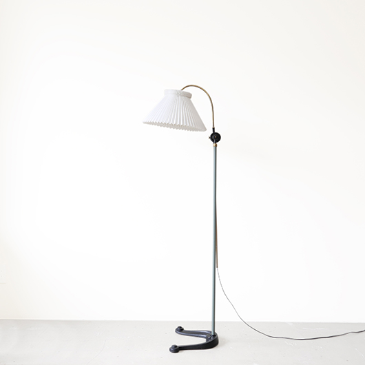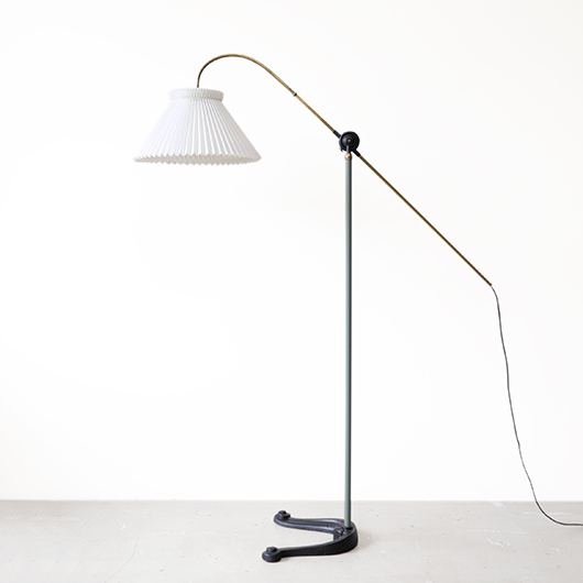 1940年代頃のデンマークFog & Mørup製のヴィンテージフロアランプ。 支柱から斜めに伸びたフレームと、優美な曲線の先に吊り下げられたシェードが特徴的なデザインの一台です。また目を引くのはそのフォルムだけではなく、美しく経年変化した真鍮フレームに支柱のセージグリーン、そして全体を引き締めるブラックを見事に組み合わせた絶妙なカラーリングも素晴らしいもの。脚部に見られるアール・デコ調の装飾と相まって唯一無二のデザインとなっています。 支柱上部についた丸い金具がアジャスターとなり、フレームを前後にさらに角度を調節することができます。光を届ける範囲変えたり、高さを変えることで雰囲気まで異なって見えるのも魅力のひとつではないでしょうか。 オリジナルのシェードはレ・クリントのもので、明かりを灯した際に複雑に折られたシェードからの陰影がより美しさを強調させています。空間を引き立てる存在感があり、アナログながら機能性にも優れた使い勝手の良い一灯です。 電気工事士の資格を持つ職人によりソケット・配線・プラグ等の電気に関わる部分は全て交換し、電気用品安全法に基づいた点検なども行いPSEマークを表示しておりますので、新しいもの同様に安心してご使用いただけます(詳細下記ご参照)。 丁寧な修復を行い、全体的に綺麗な状態です。シェードに黄ばみや目立ったダメージなどないため、同型の新しいものに交換してあるようです。時間をかけクリーニングを行いました。落としきれなかったごく僅かな経年感はあるものの、綺麗な状態を保っています。そのほか細部の状態などは、画像をご参照ください。