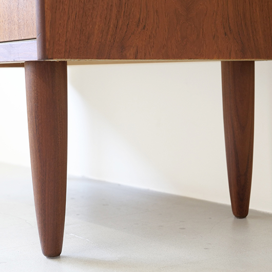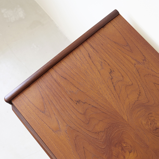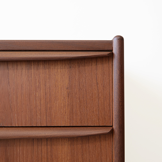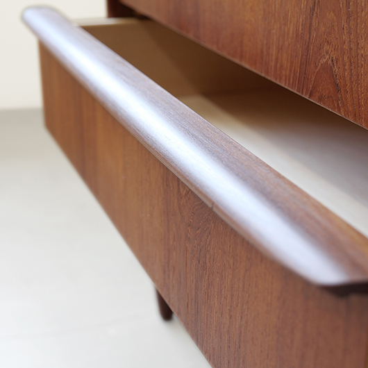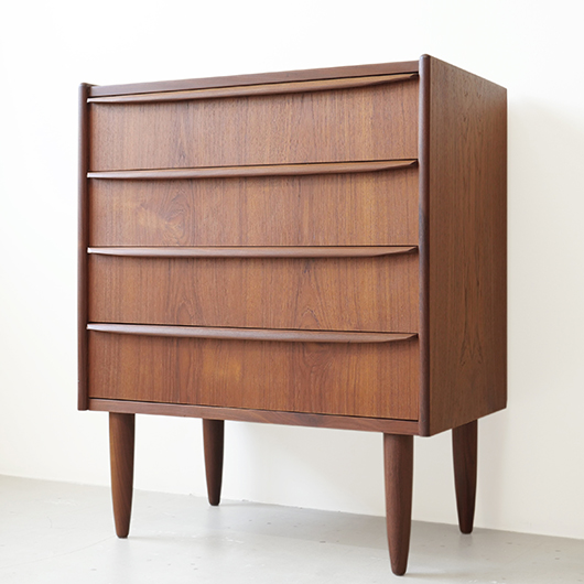 1960年代デンマーク製のヴィンテージ4段チェスト。 程よいサイズ感で収納力を備えたミディアムサイズのチェストです。引出しの縁に沿って付けられたチーク無垢材の取っ手は指掛かりも良く、バータイプですっきりとした印象を与えてくれます。また正面から見て上下に揃った木目も、丁寧に作られたデンマーク製のヴィンテージらしさのひとつです。 リビングや寝室などに置いて、衣類などを収納していただけます。広い天板にはお気に入りの小物はもちろん、テーブルランプやベースなどのディスプレイにも良さそうです。 丁寧な修復を行いまして、全体的にに綺麗な状態です。背板や引出し底板は新しいものに交換しておりますので、清潔にお使いいただけます。所々い小キズや修復箇所などが見られますが、雰囲気を損ねない程度かと思います。そのほか細部の状態などは、画像をご参照ください。